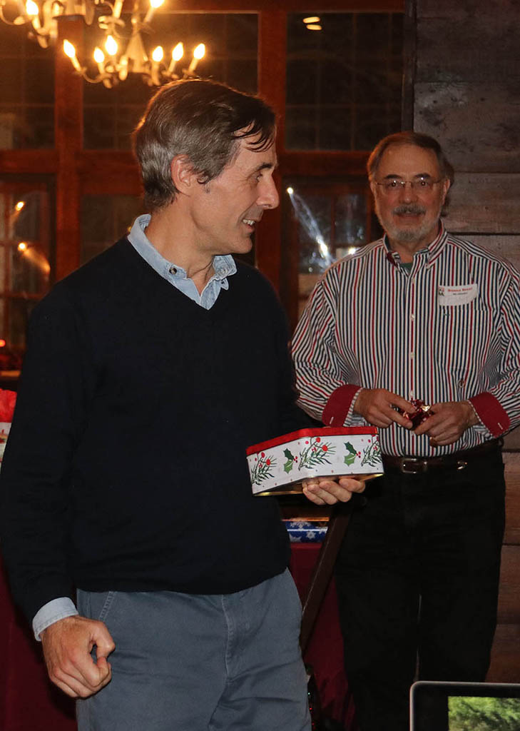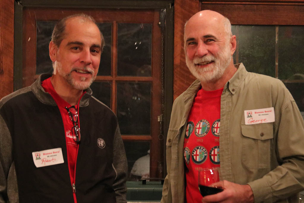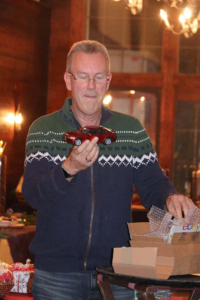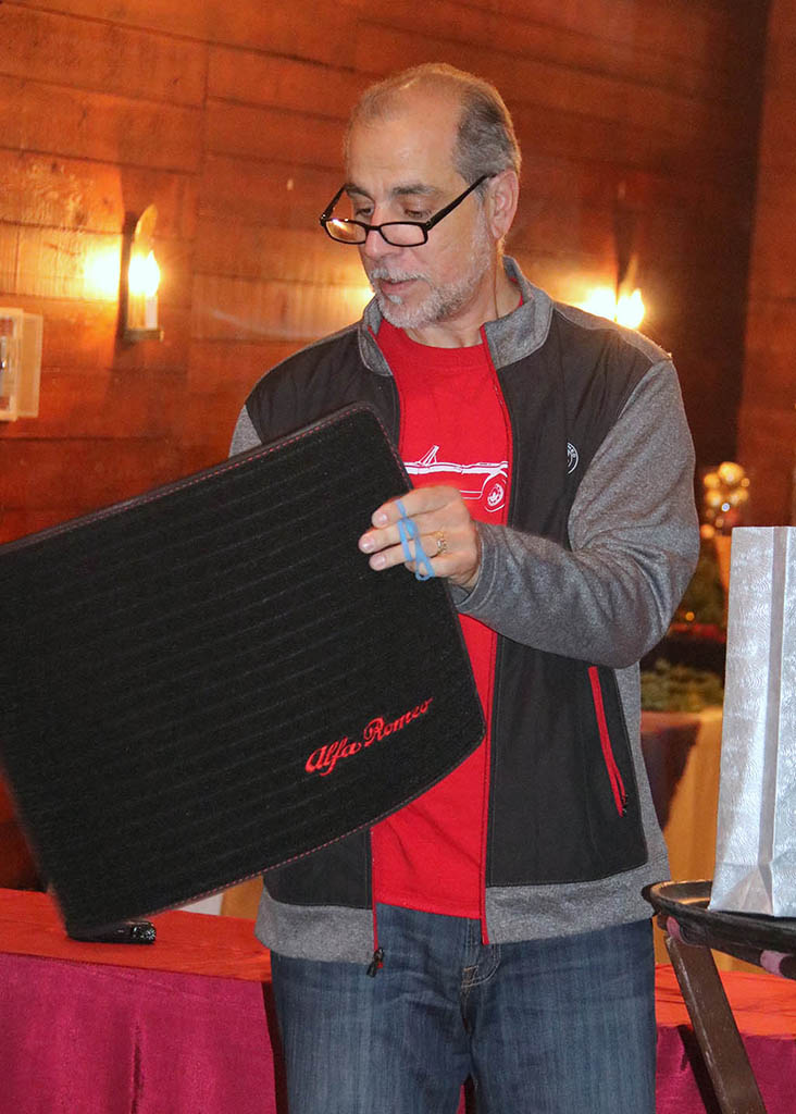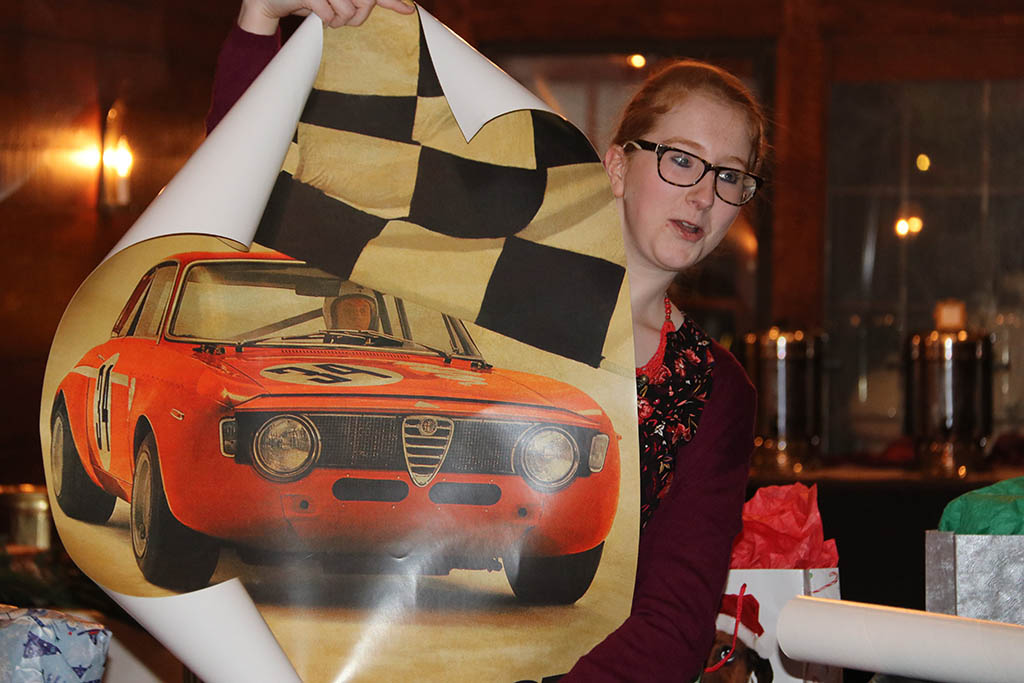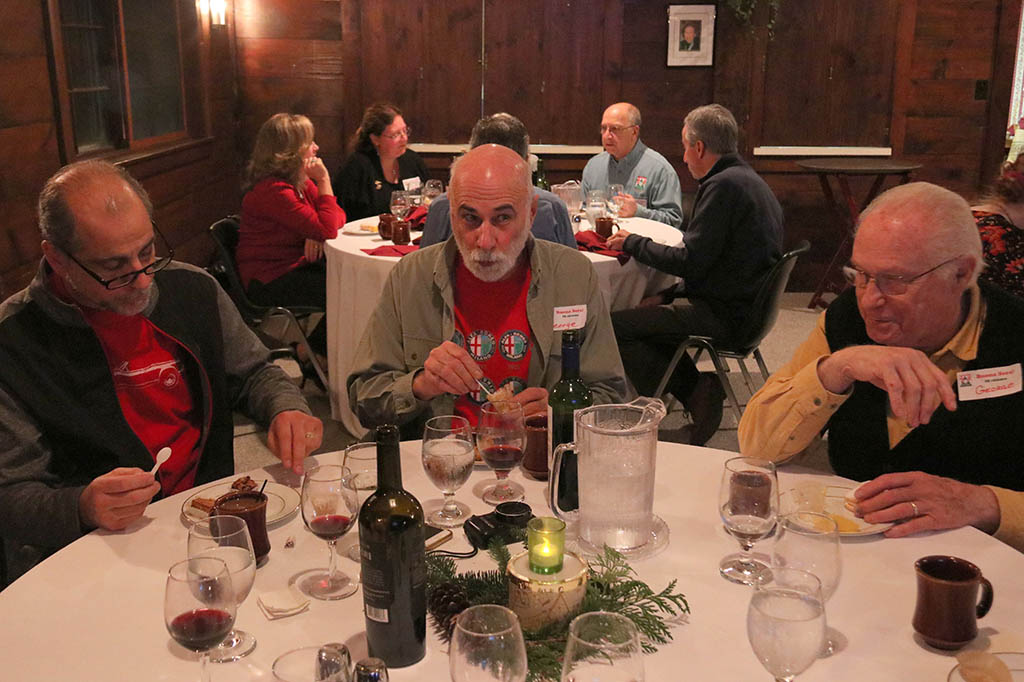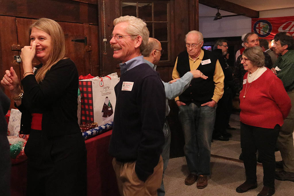 It was a little touch-and-go, but we managed to pull off another one of our fine, fun AONE Holiday Parties at the Josiah Smith Tavern in Weston, MA, on Saturday, December 9th. Mother Nature was in an uncooperative mood, dumping on us the season's first significant snowstorm, which fell throughout the entire day of our gathering, leaving the area with about 6" of the stuff and making for some challenging driving conditions coming and going. Unfazed, however, we had not a single cancellation due to the weather! And that included people coming from Rhode Island, New Hampshire, and even Steve Bellantone down from Maine! (I suppose they're more used to it up there.) Around forty of us drifted inside the Tavern, where Tastings Caterers had everything waiting for us. In addition to a "stationary table" loaded with appetizers, the capable wait staff wandered among us offering their delectable hors d'oeuvres. We'd brought along our various beverages, which we uncorked and uncapped, and proceeded to enjoy the food, drink and each other's company. As a backdrop, Tom Lesko had prepared a free-running slide presentation displaying photos from all of our AONE events of the past year, accompanied by some holiday background music. We were happy to have back in our midst two couples who'd been with us in the past but had gone Alfaless in recent years. Steve & Ellen Silverstein recently acquired the very same Duetto that Steve had ogled out the window of the school bus that took him to junior high back in Tennessee! Bruce & Jane Murray once had 164s and are now seriously considering a new Giulia (if we can just convince Jane about the merits of the paddle-shift transmission). In due course, the main buffet was announced as ready for us, so we all queued up, grabbed plates, and eagerly partook. Tastings once again provided us with their excellent cuisine and didn't disappoint! We were all seated around five large tables, and, judging from the decibel level of the boisterous chatter, it was easy to tell what a great time everyone was having. As people were finishing off their delectable desserts, it was time to get down to "business". The crowd groaned as I went around the room handing out copies of the Official AONE Holiday Songbook, because it meant that they'd be coerced into the sing-along of corrupted Alfa-centric Xmas tunes that I've foisted on them in previous years. We made it through a few songs before tossing the booklets aside and moving on to better things. Namely, the start of the Yankee gift swap! It's always a ton of fun, and this year's was no exception. Our suggestion that we limit the number of bottles of wine and Limoncello seemed to have had a positive effect, as we had a wide assortment of fun and interesting gifts get opened (and swapped)! If you look through the photos, you'll get an idea of the variety of interesting items that found new homes. (By the way, I think you'll agree that Adrien Sipos, who took almost all of the photos during the evening, does a most outstanding job — she really caught the party's spirit!) Our thanks go once again to Tom Lesko for making all of the arrangements for our popular annual holiday bash! (Well, he did sort of screw up the weather.) 'Twas a really outstanding event ... 2017 Holiday Party Revelers |