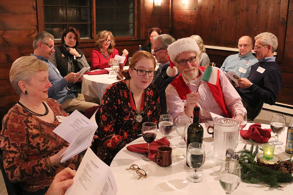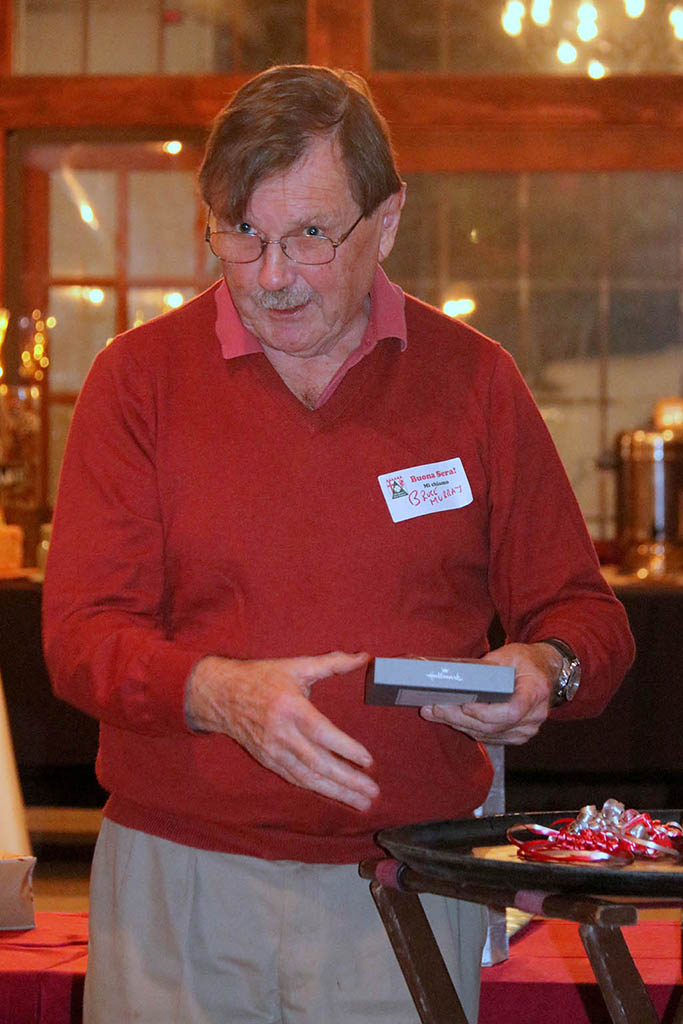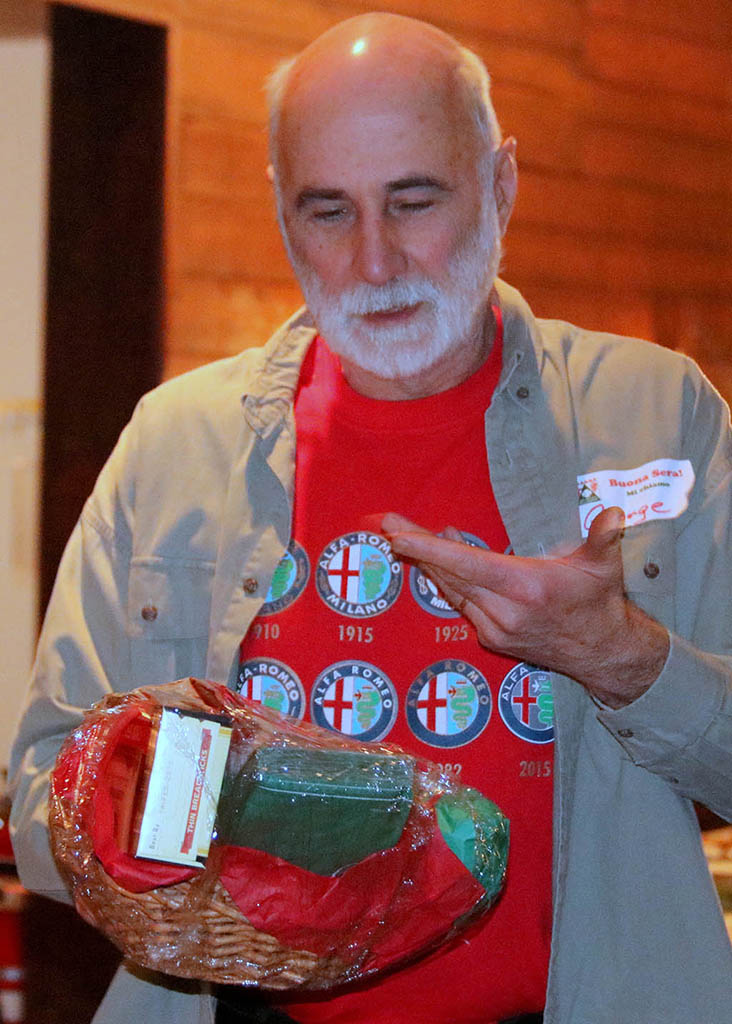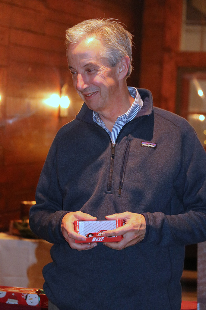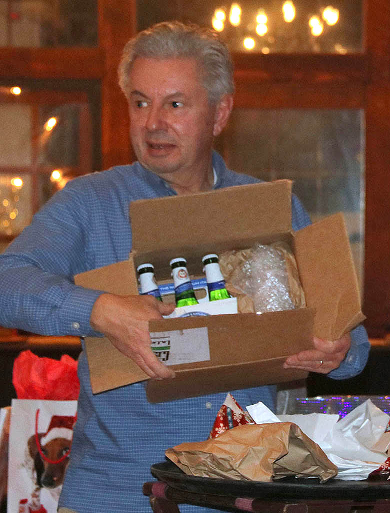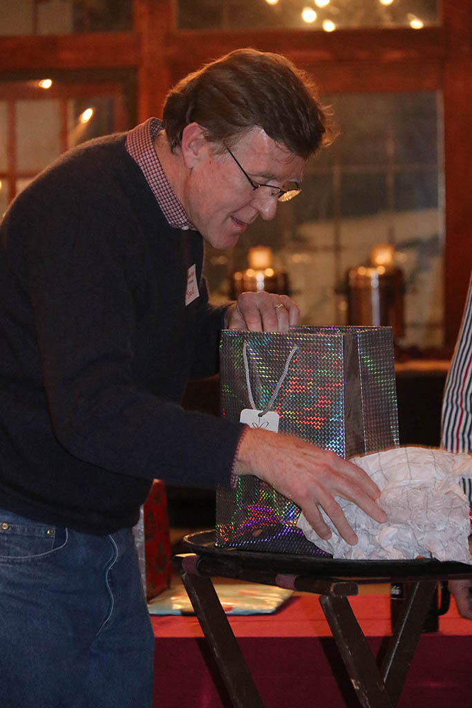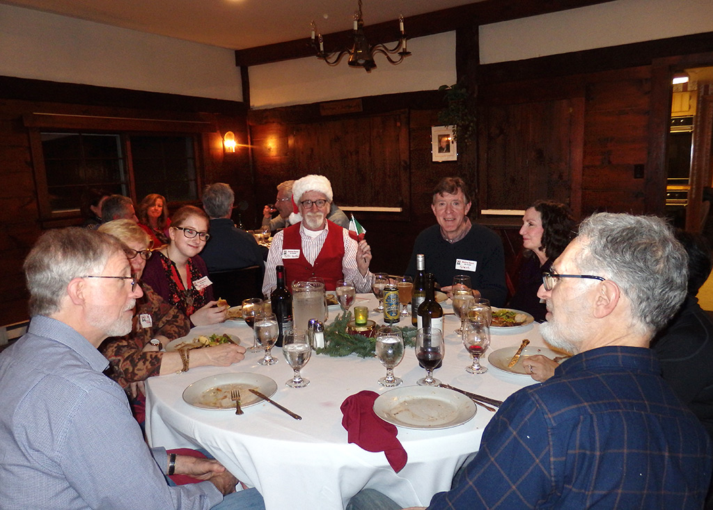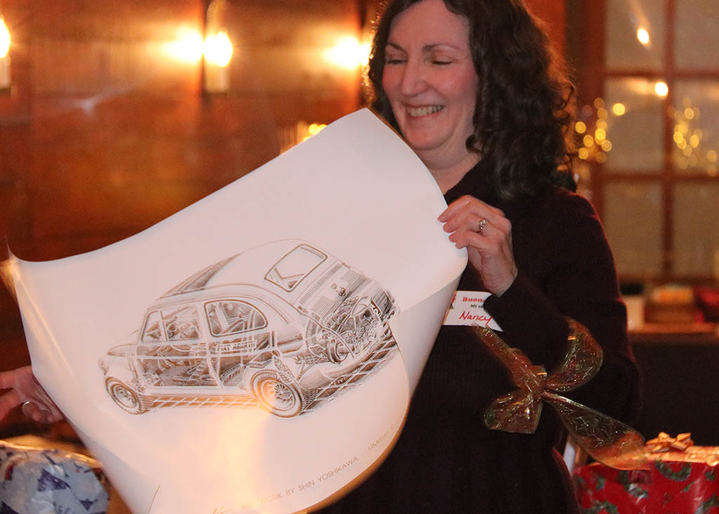 It was a little touch-and-go, but we managed to pull off another one of our fine, fun AONE Holiday Parties at the Josiah Smith Tavern in Weston, MA, on Saturday, December 9th. Mother Nature was in an uncooperative mood, dumping on us the season's first significant snowstorm, which fell throughout the entire day of our gathering, leaving the area with about 6" of the stuff and making for some challenging driving conditions coming and going. Unfazed, however, we had not a single cancellation due to the weather! And that included people coming from Rhode Island, New Hampshire, and even Steve Bellantone down from Maine! (I suppose they're more used to it up there.) Around forty of us drifted inside the Tavern, where Tastings Caterers had everything waiting for us. In addition to a "stationary table" loaded with appetizers, the capable wait staff wandered among us offering their delectable hors d'oeuvres. We'd brought along our various beverages, which we uncorked and uncapped, and proceeded to enjoy the food, drink and each other's company. As a backdrop, Tom Lesko had prepared a free-running slide presentation displaying photos from all of our AONE events of the past year, accompanied by some holiday background music. We were happy to have back in our midst two couples who'd been with us in the past but had gone Alfaless in recent years. Steve & Ellen Silverstein recently acquired the very same Duetto that Steve had ogled out the window of the school bus that took him to junior high back in Tennessee! Bruce & Jane Murray once had 164s and are now seriously considering a new Giulia (if we can just convince Jane about the merits of the paddle-shift transmission). In due course, the main buffet was announced as ready for us, so we all queued up, grabbed plates, and eagerly partook. Tastings once again provided us with their excellent cuisine and didn't disappoint! We were all seated around five large tables, and, judging from the decibel level of the boisterous chatter, it was easy to tell what a great time everyone was having. As people were finishing off their delectable desserts, it was time to get down to "business". The crowd groaned as I went around the room handing out copies of the Official AONE Holiday Songbook, because it meant that they'd be coerced into the sing-along of corrupted Alfa-centric Xmas tunes that I've foisted on them in previous years. We made it through a few songs before tossing the booklets aside and moving on to better things. Namely, the start of the Yankee gift swap! It's always a ton of fun, and this year's was no exception. Our suggestion that we limit the number of bottles of wine and Limoncello seemed to have had a positive effect, as we had a wide assortment of fun and interesting gifts get opened (and swapped)! If you look through the photos, you'll get an idea of the variety of interesting items that found new homes. (By the way, I think you'll agree that Adrien Sipos, who took almost all of the photos during the evening, does a most outstanding job — she really caught the party's spirit!) Our thanks go once again to Tom Lesko for making all of the arrangements for our popular annual holiday bash! (Well, he did sort of screw up the weather.) 'Twas a really outstanding event ... 2017 Holiday Party Revelers |