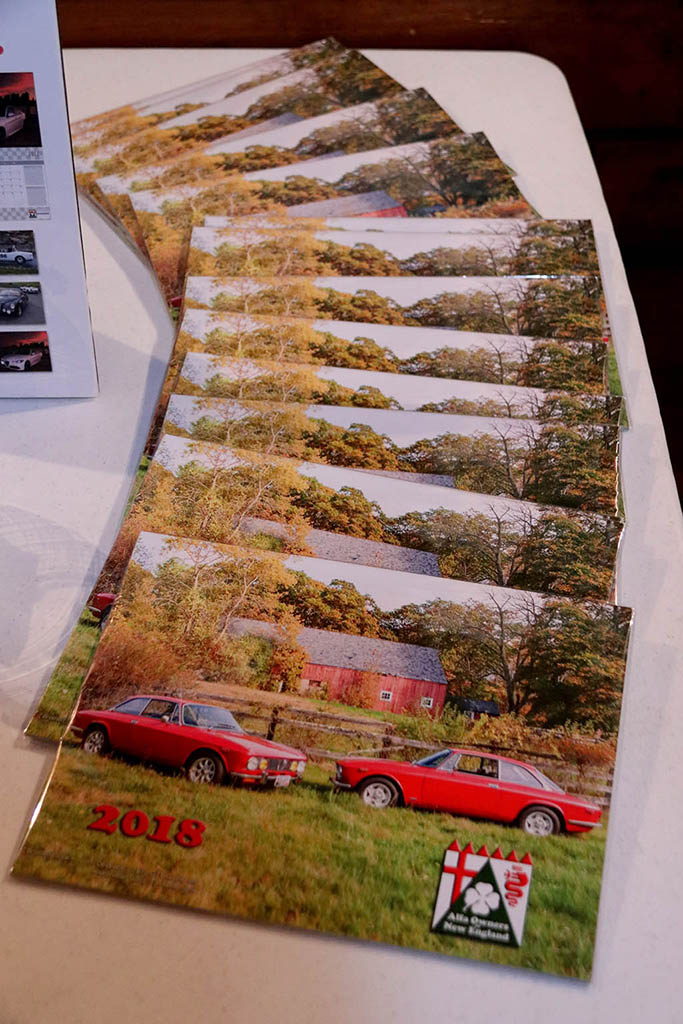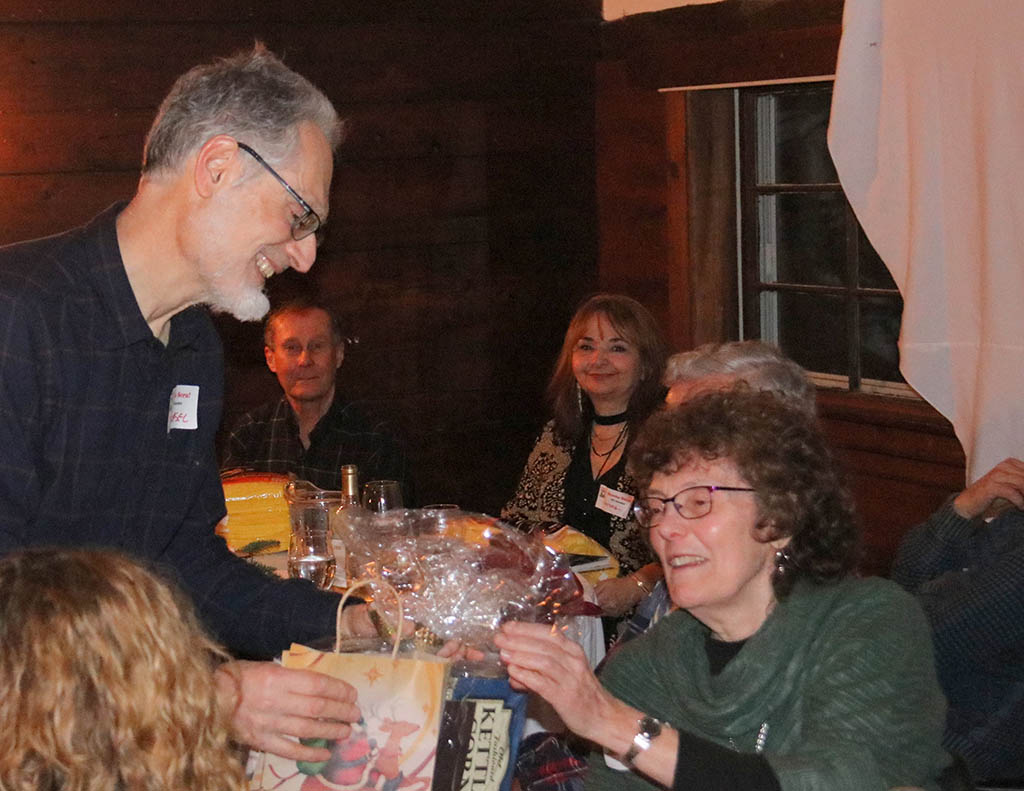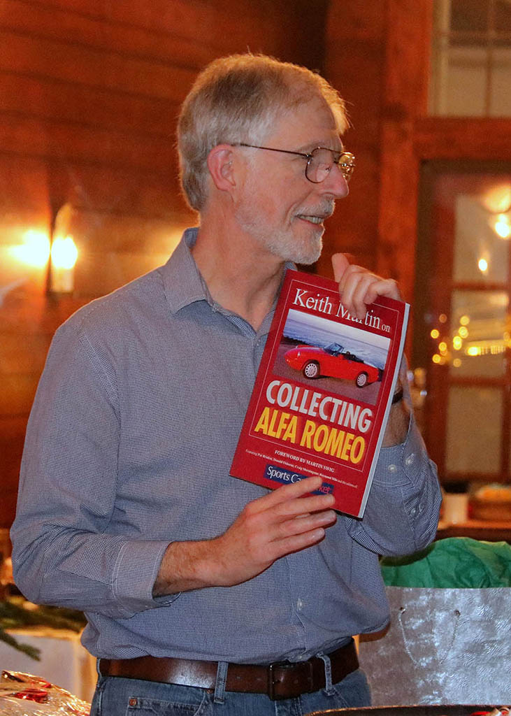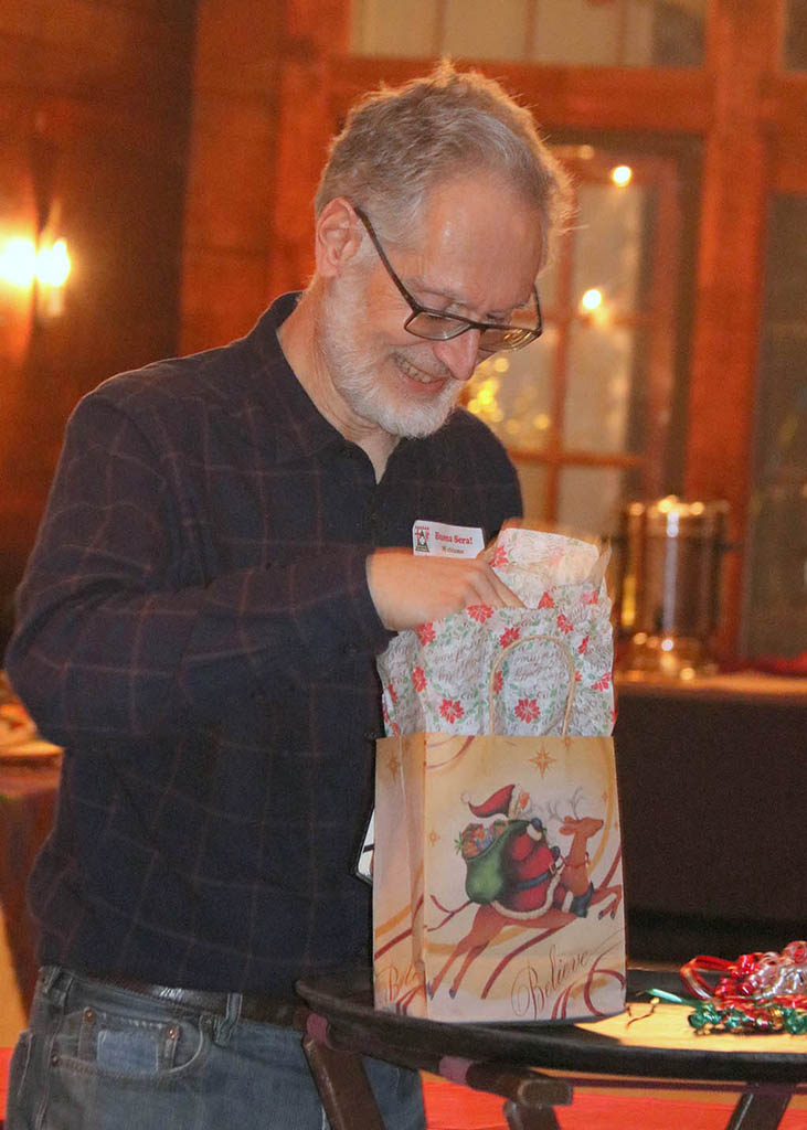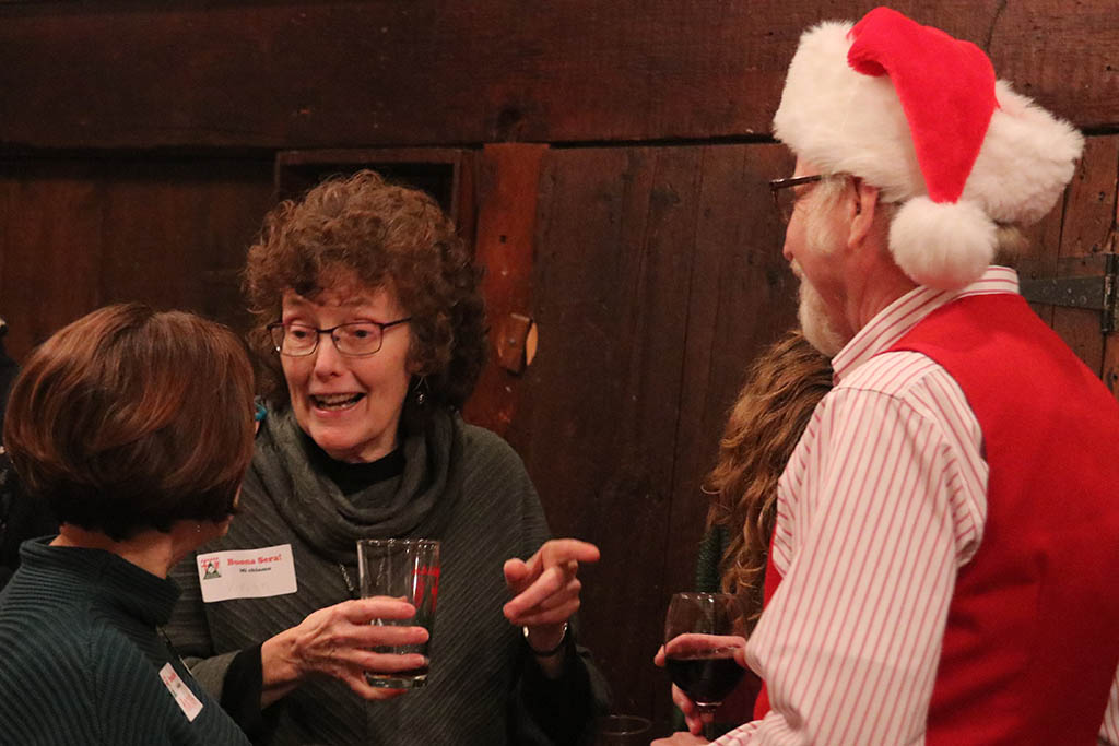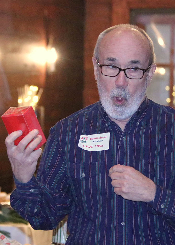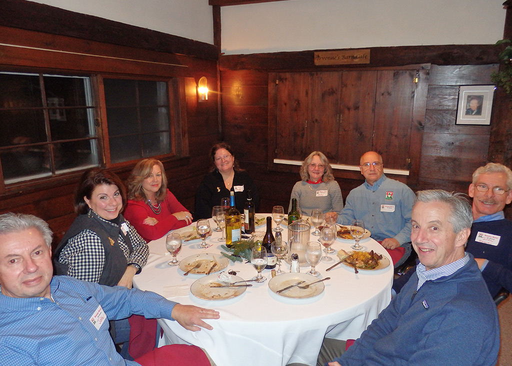 It was a little touch-and-go, but we managed to pull off another one of our fine, fun AONE Holiday Parties at the Josiah Smith Tavern in Weston, MA, on Saturday, December 9th. Mother Nature was in an uncooperative mood, dumping on us the season's first significant snowstorm, which fell throughout the entire day of our gathering, leaving the area with about 6" of the stuff and making for some challenging driving conditions coming and going. Unfazed, however, we had not a single cancellation due to the weather! And that included people coming from Rhode Island, New Hampshire, and even Steve Bellantone down from Maine! (I suppose they're more used to it up there.) Around forty of us drifted inside the Tavern, where Tastings Caterers had everything waiting for us. In addition to a "stationary table" loaded with appetizers, the capable wait staff wandered among us offering their delectable hors d'oeuvres. We'd brought along our various beverages, which we uncorked and uncapped, and proceeded to enjoy the food, drink and each other's company. As a backdrop, Tom Lesko had prepared a free-running slide presentation displaying photos from all of our AONE events of the past year, accompanied by some holiday background music. We were happy to have back in our midst two couples who'd been with us in the past but had gone Alfaless in recent years. Steve & Ellen Silverstein recently acquired the very same Duetto that Steve had ogled out the window of the school bus that took him to junior high back in Tennessee! Bruce & Jane Murray once had 164s and are now seriously considering a new Giulia (if we can just convince Jane about the merits of the paddle-shift transmission). In due course, the main buffet was announced as ready for us, so we all queued up, grabbed plates, and eagerly partook. Tastings once again provided us with their excellent cuisine and didn't disappoint! We were all seated around five large tables, and, judging from the decibel level of the boisterous chatter, it was easy to tell what a great time everyone was having. As people were finishing off their delectable desserts, it was time to get down to "business". The crowd groaned as I went around the room handing out copies of the Official AONE Holiday Songbook, because it meant that they'd be coerced into the sing-along of corrupted Alfa-centric Xmas tunes that I've foisted on them in previous years. We made it through a few songs before tossing the booklets aside and moving on to better things. Namely, the start of the Yankee gift swap! It's always a ton of fun, and this year's was no exception. Our suggestion that we limit the number of bottles of wine and Limoncello seemed to have had a positive effect, as we had a wide assortment of fun and interesting gifts get opened (and swapped)! If you look through the photos, you'll get an idea of the variety of interesting items that found new homes. (By the way, I think you'll agree that Adrien Sipos, who took almost all of the photos during the evening, does a most outstanding job — she really caught the party's spirit!) Our thanks go once again to Tom Lesko for making all of the arrangements for our popular annual holiday bash! (Well, he did sort of screw up the weather.) 'Twas a really outstanding event ... 2017 Holiday Party Revelers |