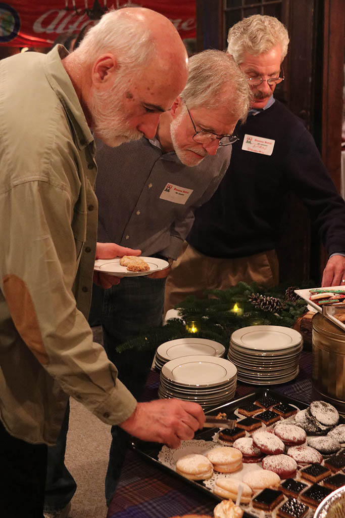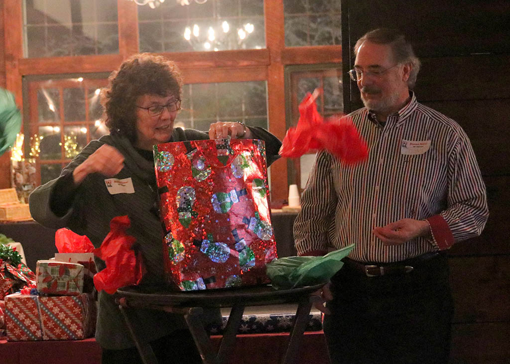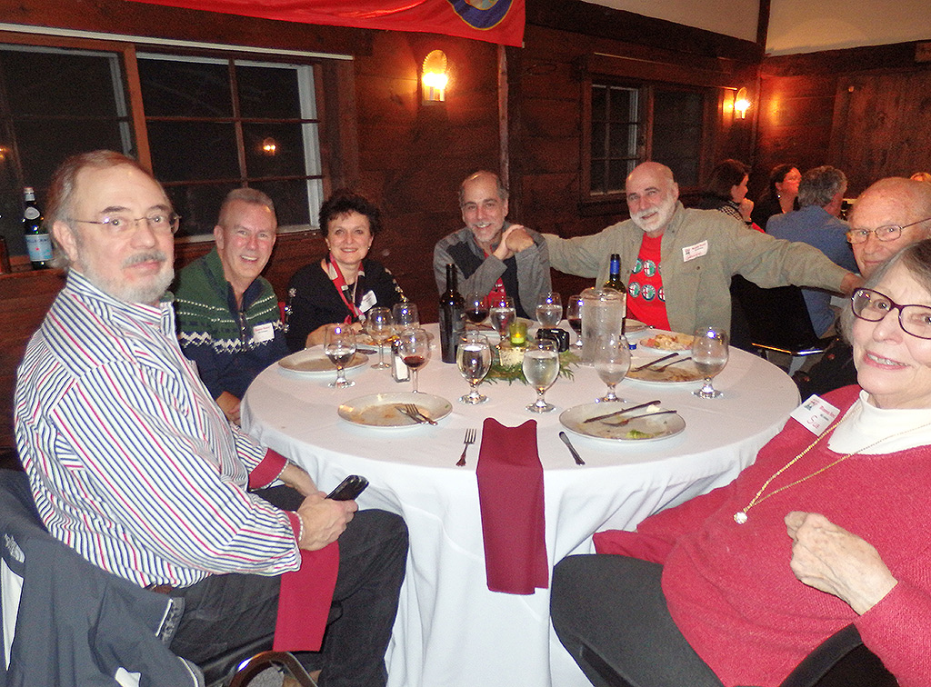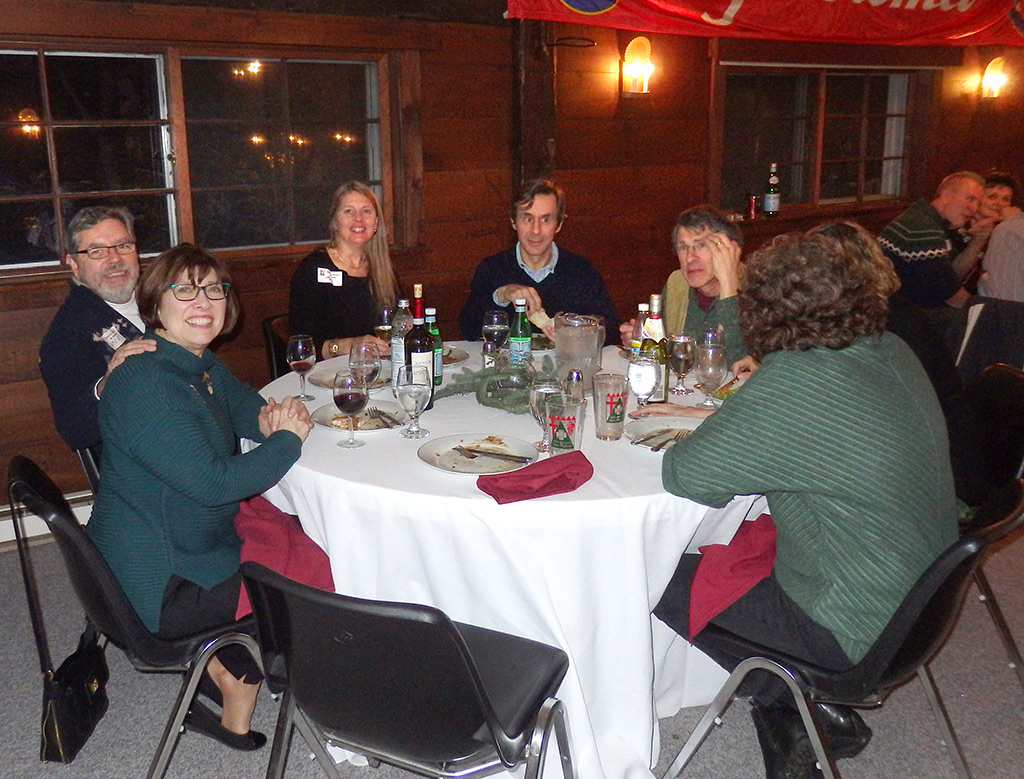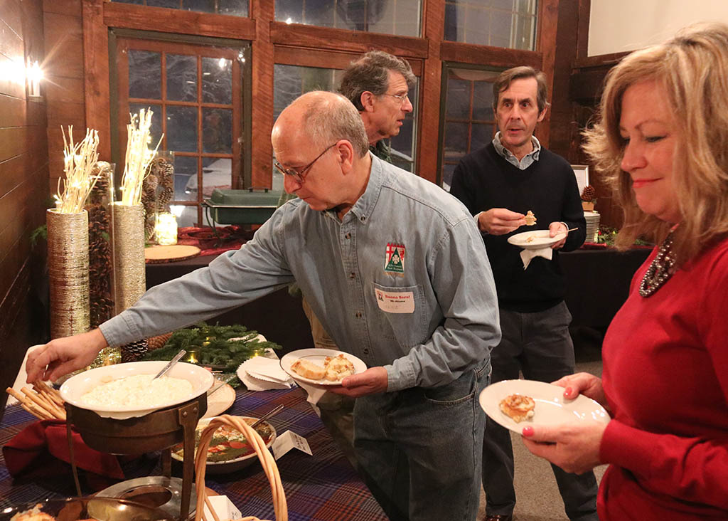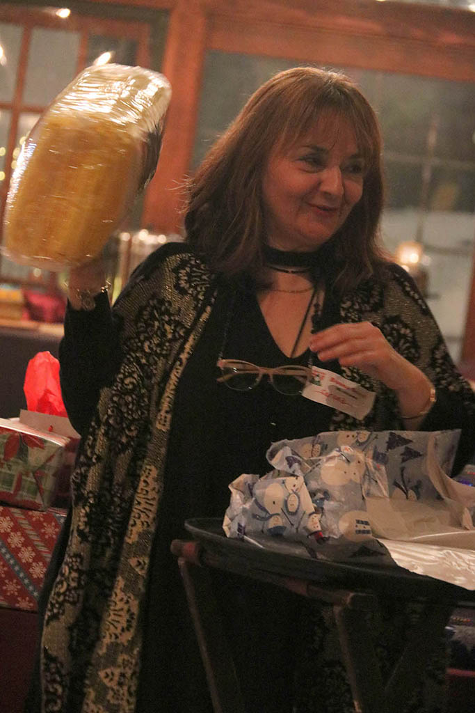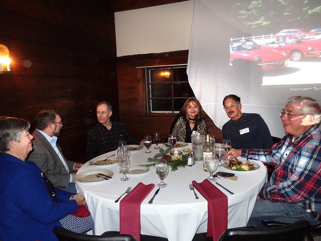 It was a little touch-and-go, but we managed to pull off another one of our fine, fun AONE Holiday Parties at the Josiah Smith Tavern in Weston, MA, on Saturday, December 9th. Mother Nature was in an uncooperative mood, dumping on us the season's first significant snowstorm, which fell throughout the entire day of our gathering, leaving the area with about 6" of the stuff and making for some challenging driving conditions coming and going. Unfazed, however, we had not a single cancellation due to the weather! And that included people coming from Rhode Island, New Hampshire, and even Steve Bellantone down from Maine! (I suppose they're more used to it up there.) Around forty of us drifted inside the Tavern, where Tastings Caterers had everything waiting for us. In addition to a "stationary table" loaded with appetizers, the capable wait staff wandered among us offering their delectable hors d'oeuvres. We'd brought along our various beverages, which we uncorked and uncapped, and proceeded to enjoy the food, drink and each other's company. As a backdrop, Tom Lesko had prepared a free-running slide presentation displaying photos from all of our AONE events of the past year, accompanied by some holiday background music. We were happy to have back in our midst two couples who'd been with us in the past but had gone Alfaless in recent years. Steve & Ellen Silverstein recently acquired the very same Duetto that Steve had ogled out the window of the school bus that took him to junior high back in Tennessee! Bruce & Jane Murray once had 164s and are now seriously considering a new Giulia (if we can just convince Jane about the merits of the paddle-shift transmission). In due course, the main buffet was announced as ready for us, so we all queued up, grabbed plates, and eagerly partook. Tastings once again provided us with their excellent cuisine and didn't disappoint! We were all seated around five large tables, and, judging from the decibel level of the boisterous chatter, it was easy to tell what a great time everyone was having. As people were finishing off their delectable desserts, it was time to get down to "business". The crowd groaned as I went around the room handing out copies of the Official AONE Holiday Songbook, because it meant that they'd be coerced into the sing-along of corrupted Alfa-centric Xmas tunes that I've foisted on them in previous years. We made it through a few songs before tossing the booklets aside and moving on to better things. Namely, the start of the Yankee gift swap! It's always a ton of fun, and this year's was no exception. Our suggestion that we limit the number of bottles of wine and Limoncello seemed to have had a positive effect, as we had a wide assortment of fun and interesting gifts get opened (and swapped)! If you look through the photos, you'll get an idea of the variety of interesting items that found new homes. (By the way, I think you'll agree that Adrien Sipos, who took almost all of the photos during the evening, does a most outstanding job — she really caught the party's spirit!) Our thanks go once again to Tom Lesko for making all of the arrangements for our popular annual holiday bash! (Well, he did sort of screw up the weather.) 'Twas a really outstanding event ... 2017 Holiday Party Revelers |