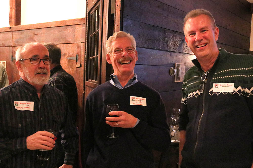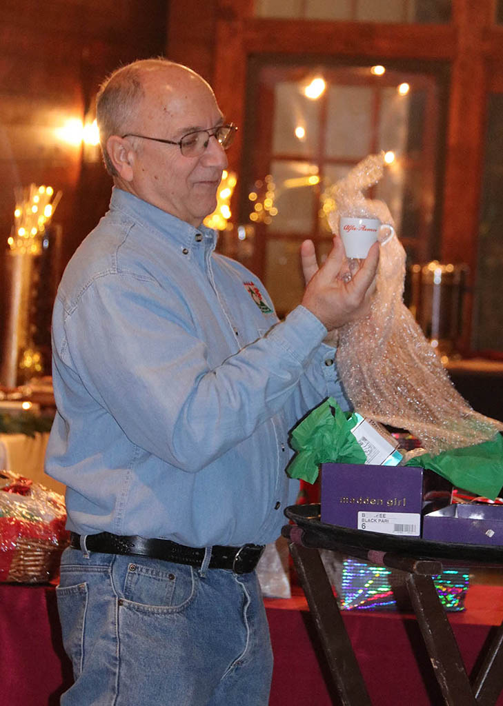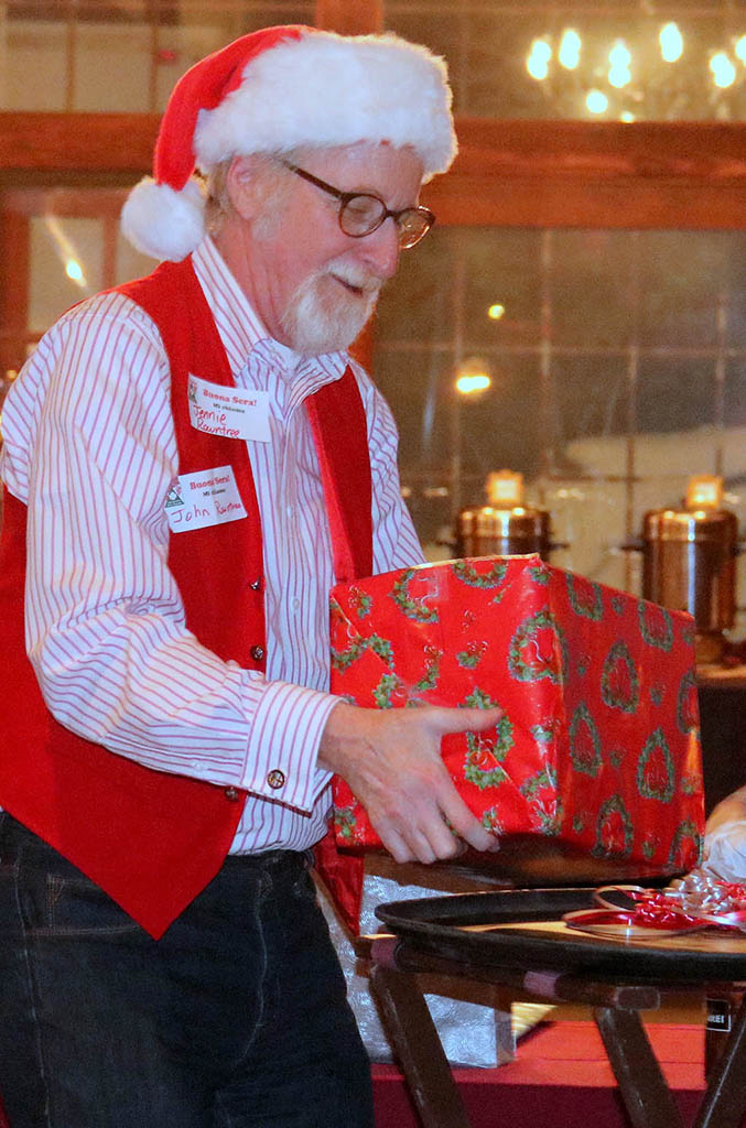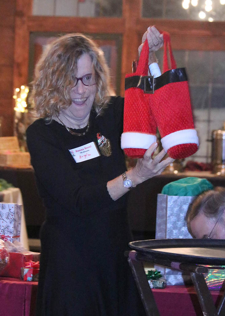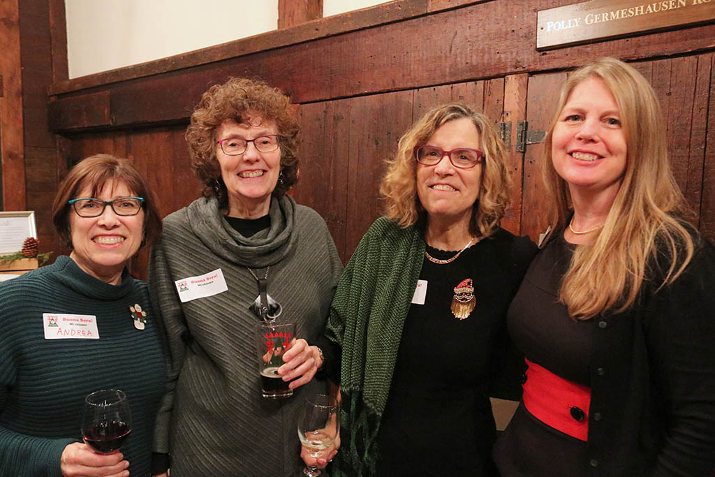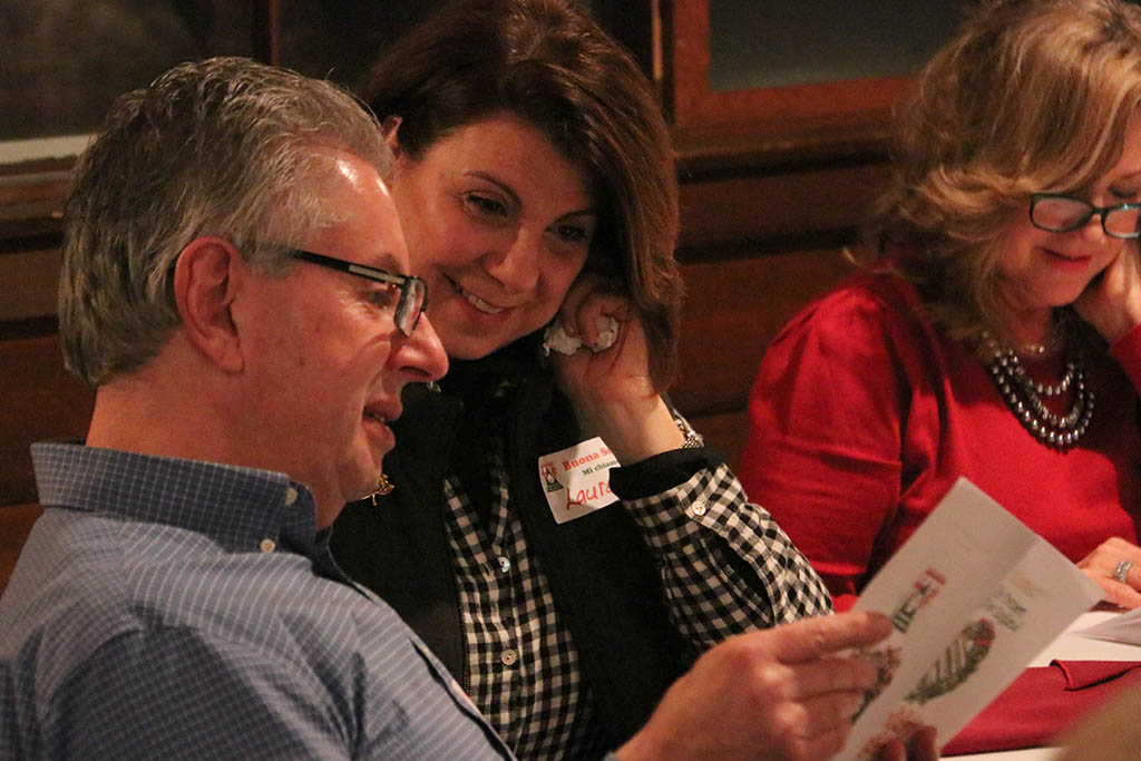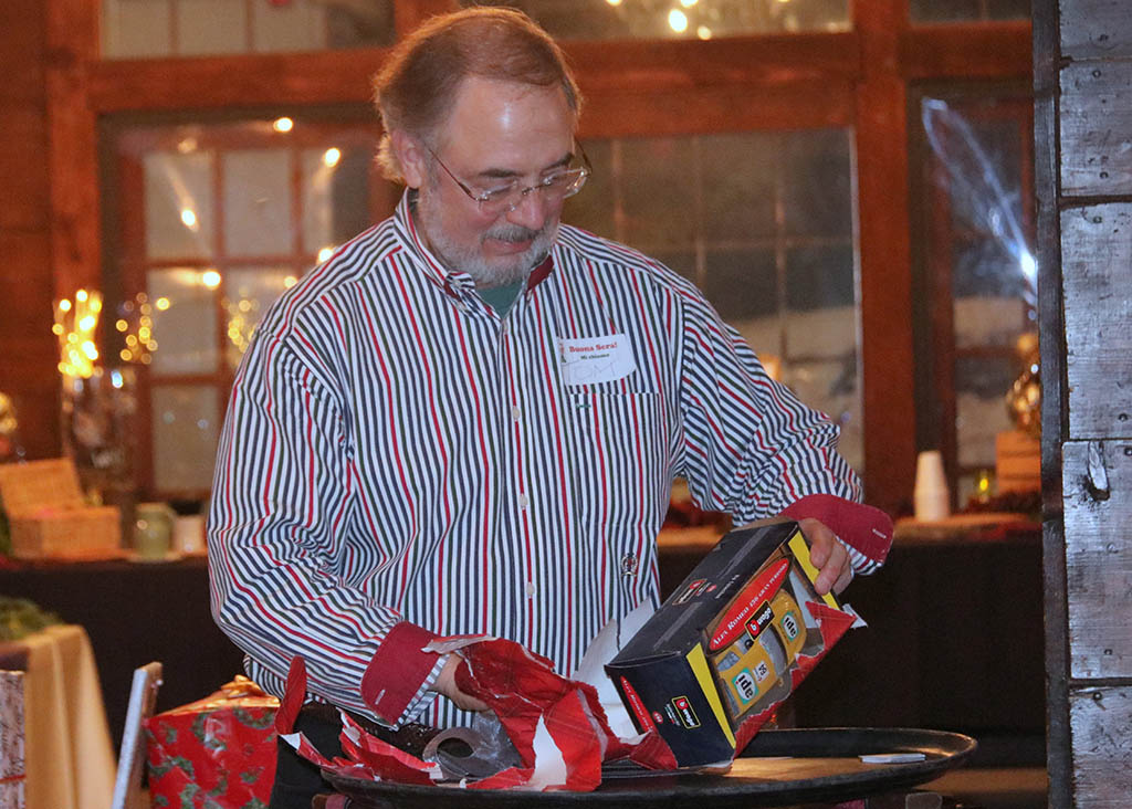 It was a little touch-and-go, but we managed to pull off another one of our fine, fun AONE Holiday Parties at the Josiah Smith Tavern in Weston, MA, on Saturday, December 9th. Mother Nature was in an uncooperative mood, dumping on us the season's first significant snowstorm, which fell throughout the entire day of our gathering, leaving the area with about 6" of the stuff and making for some challenging driving conditions coming and going. Unfazed, however, we had not a single cancellation due to the weather! And that included people coming from Rhode Island, New Hampshire, and even Steve Bellantone down from Maine! (I suppose they're more used to it up there.) Around forty of us drifted inside the Tavern, where Tastings Caterers had everything waiting for us. In addition to a "stationary table" loaded with appetizers, the capable wait staff wandered among us offering their delectable hors d'oeuvres. We'd brought along our various beverages, which we uncorked and uncapped, and proceeded to enjoy the food, drink and each other's company. As a backdrop, Tom Lesko had prepared a free-running slide presentation displaying photos from all of our AONE events of the past year, accompanied by some holiday background music. We were happy to have back in our midst two couples who'd been with us in the past but had gone Alfaless in recent years. Steve & Ellen Silverstein recently acquired the very same Duetto that Steve had ogled out the window of the school bus that took him to junior high back in Tennessee! Bruce & Jane Murray once had 164s and are now seriously considering a new Giulia (if we can just convince Jane about the merits of the paddle-shift transmission). In due course, the main buffet was announced as ready for us, so we all queued up, grabbed plates, and eagerly partook. Tastings once again provided us with their excellent cuisine and didn't disappoint! We were all seated around five large tables, and, judging from the decibel level of the boisterous chatter, it was easy to tell what a great time everyone was having. As people were finishing off their delectable desserts, it was time to get down to "business". The crowd groaned as I went around the room handing out copies of the Official AONE Holiday Songbook, because it meant that they'd be coerced into the sing-along of corrupted Alfa-centric Xmas tunes that I've foisted on them in previous years. We made it through a few songs before tossing the booklets aside and moving on to better things. Namely, the start of the Yankee gift swap! It's always a ton of fun, and this year's was no exception. Our suggestion that we limit the number of bottles of wine and Limoncello seemed to have had a positive effect, as we had a wide assortment of fun and interesting gifts get opened (and swapped)! If you look through the photos, you'll get an idea of the variety of interesting items that found new homes. (By the way, I think you'll agree that Adrien Sipos, who took almost all of the photos during the evening, does a most outstanding job — she really caught the party's spirit!) Our thanks go once again to Tom Lesko for making all of the arrangements for our popular annual holiday bash! (Well, he did sort of screw up the weather.) 'Twas a really outstanding event ... 2017 Holiday Party Revelers |