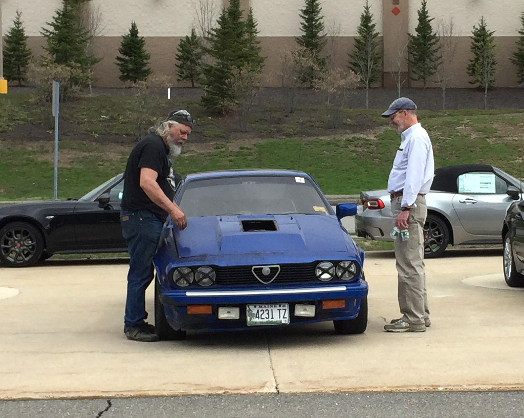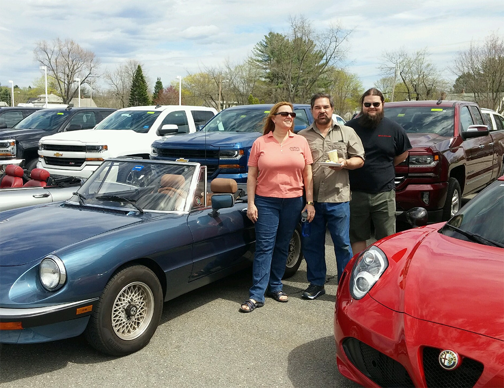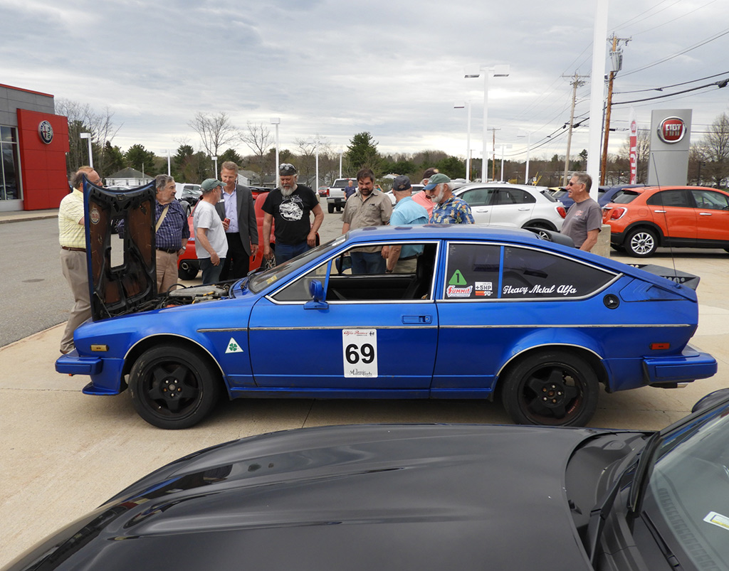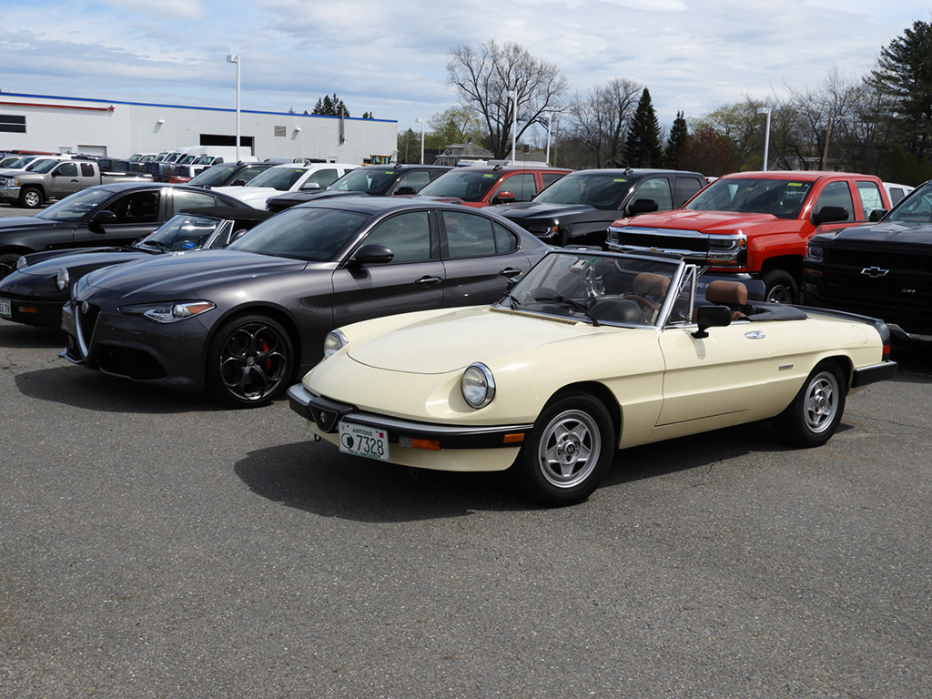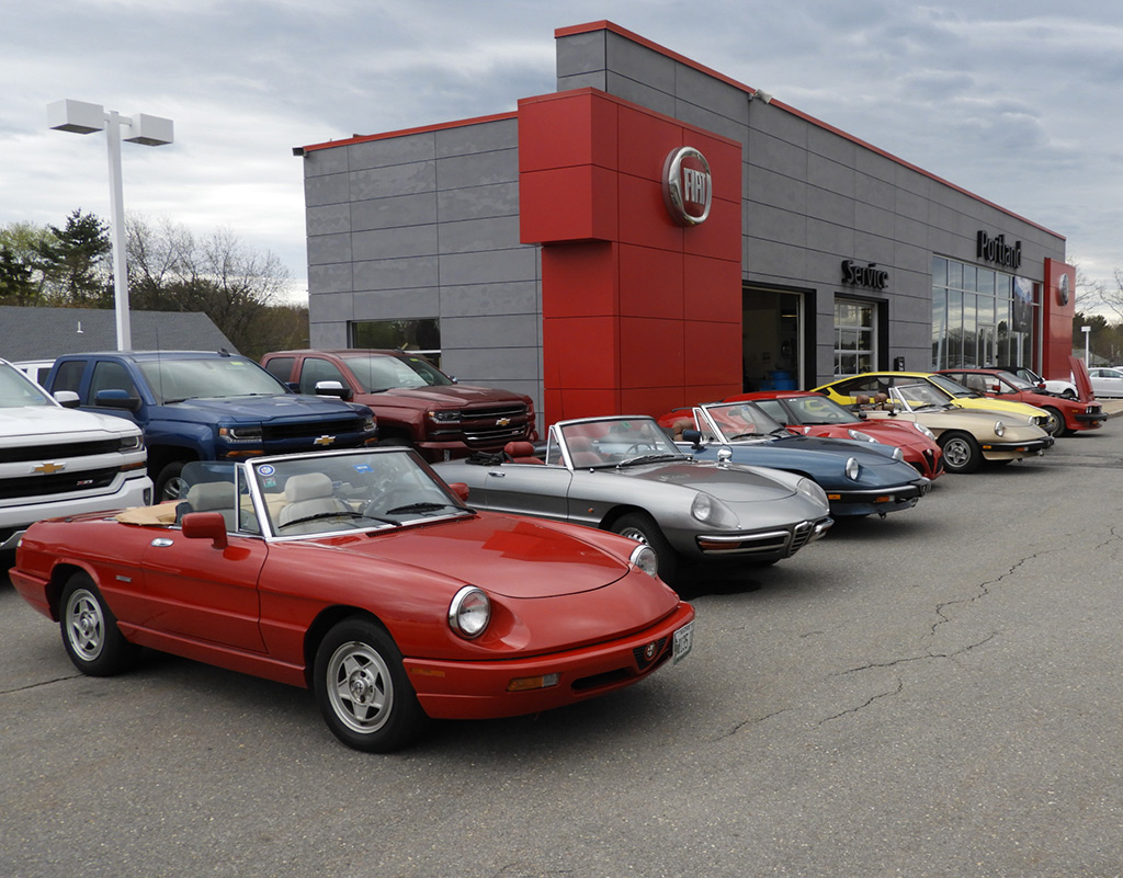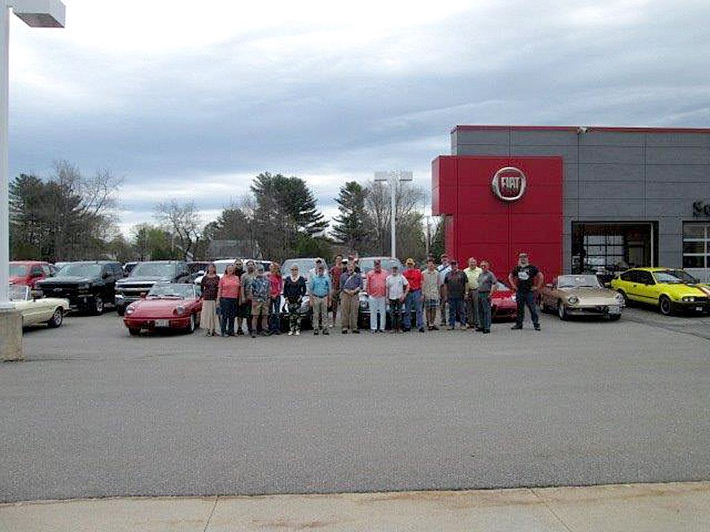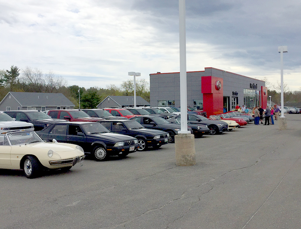 We all hung around outside in the lot and inside the showroom and service bays for a couple of hours or more, chatting and admiring all of the new and old Alfa Romeos on hand. The dealership staff members were all very friendly and accommodating, and they had set up lots of goodies to eat and beverages to slake our thirsts. It looked like they enjoyed seeing our old Alfas as much as we enjoyed seeing their new ones! Those of us who wanted to take new Giulias for test drives got to do so. As a recent, highly satisfied purchaser of one myself, I'm sure that they enjoyed the rides. As far as we know, the test drive Giulias were all returned unharmed ...... Around 1:30 or so, we all gathered for a group photo, and then some of us hopped in our Alfas for a drive out in the country that was planned and led by Portland AONEr Sam Surprise. We headed northwest out of town and did a fun romp all the way around Sebago Lake. 'Twas a pleasant way to wind up a pleasant day. While it's always nice to look at Alfas and talk about them, driving them is what it's all about! Our thanks go out to several people for making the event a success! First, of course, to Alfa Romeo and Fiat of Portland for hosting the gathering. Then to Bill Anderson of AONE for getting the ball rolling. And finally to Sam Surprise for picking up the ball, making the arrangements with the dealership, and pulling off the apres-launch drive. Well done, everybody! |