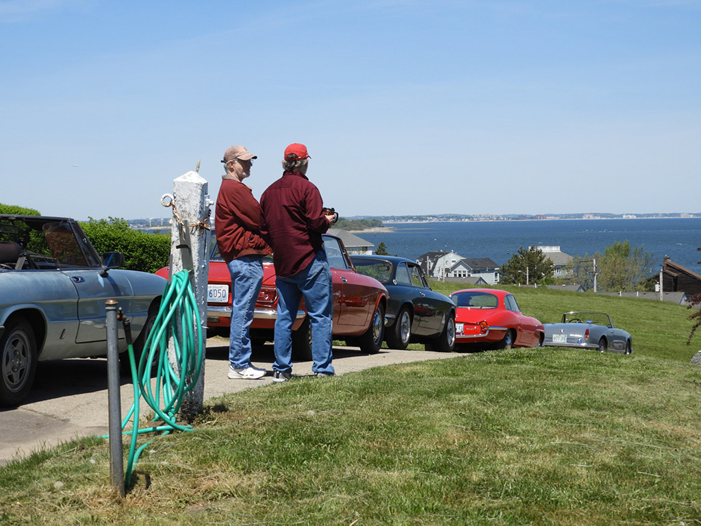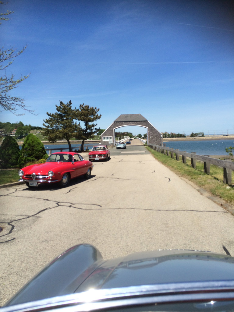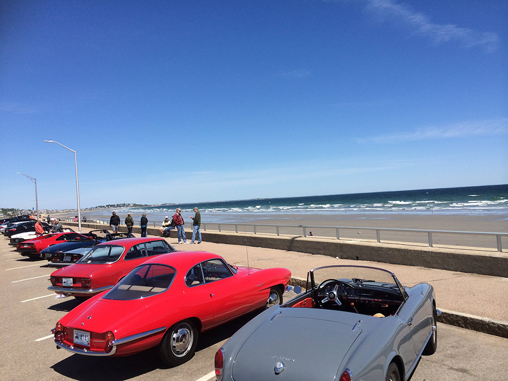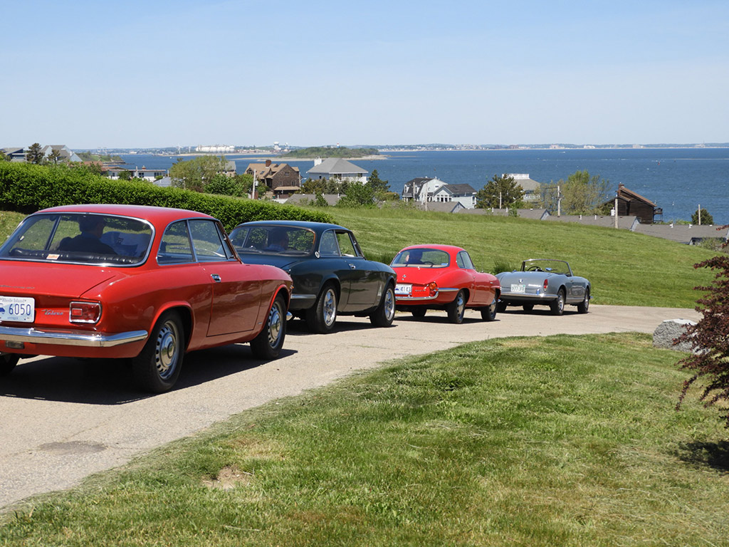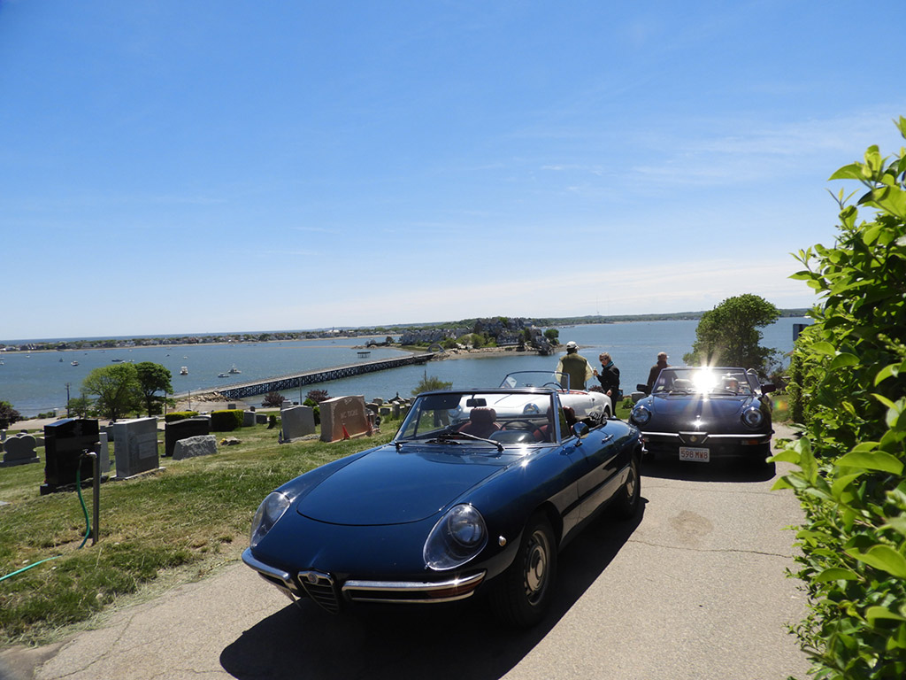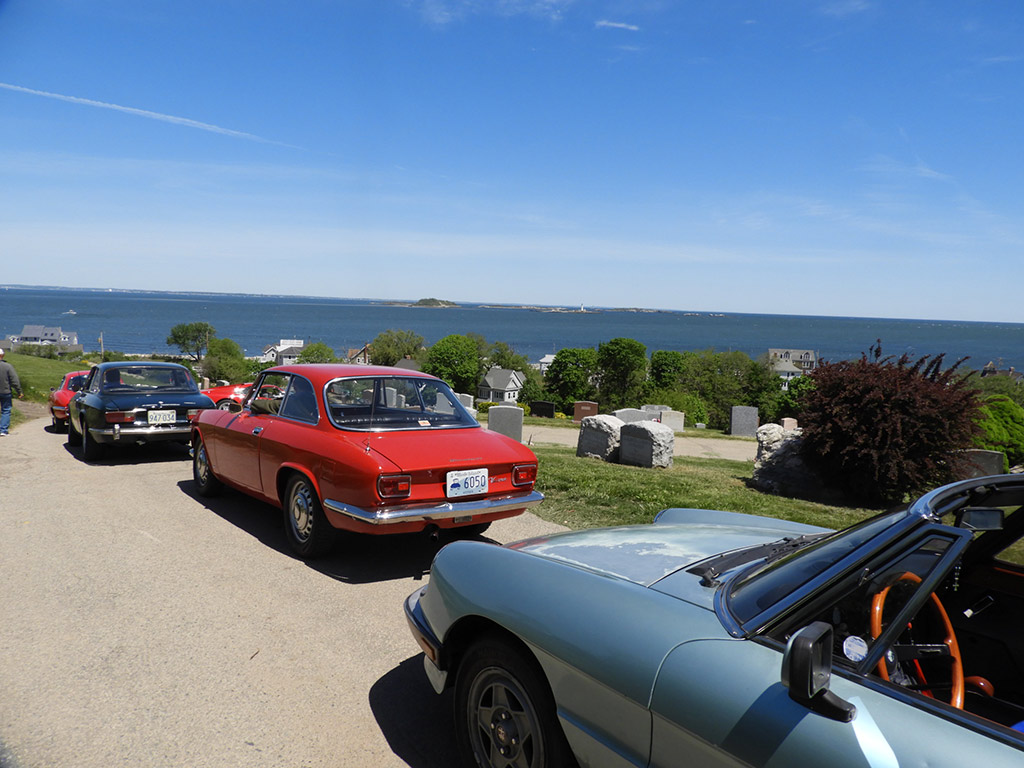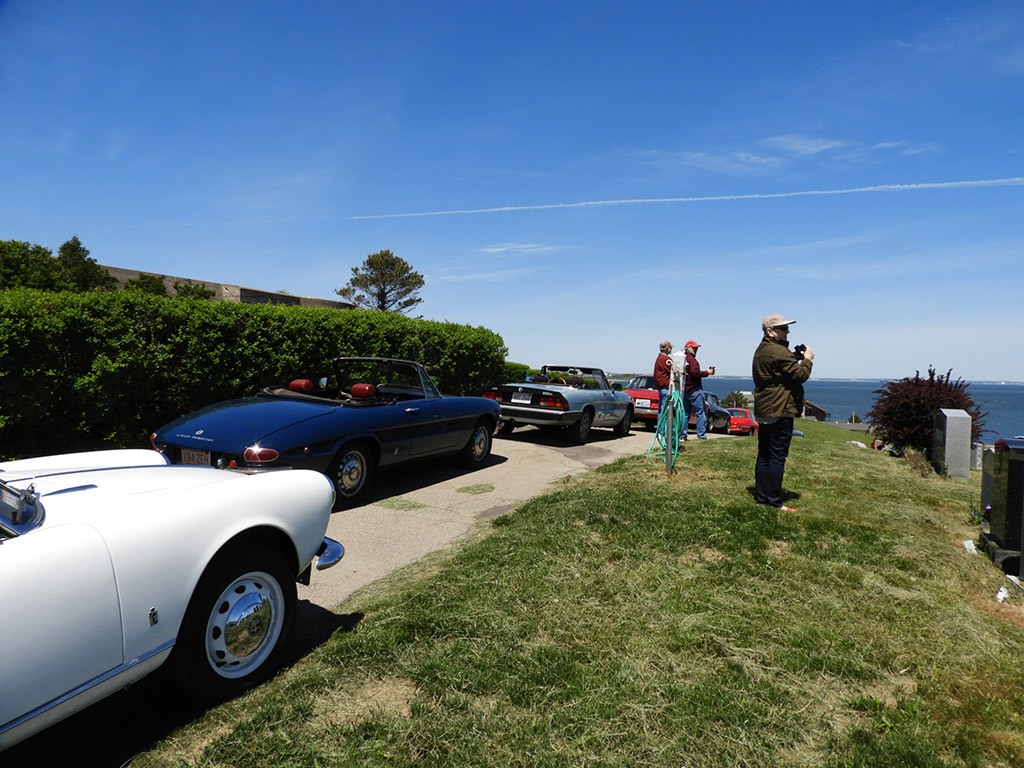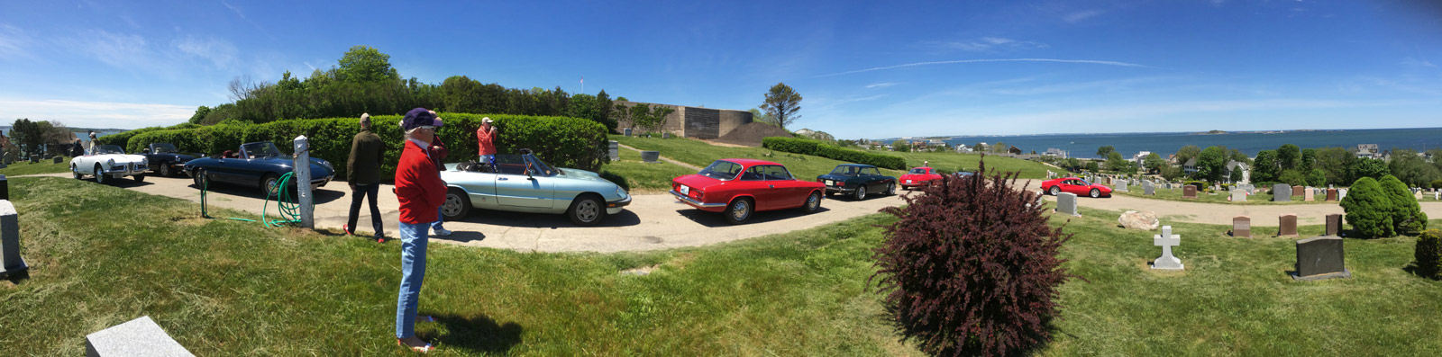By Tom Lesko I began the South Shore Beach and Waterfront Tour 11 years ago and it is still a beautiful drive in beautiful Alfas in beautiful, spring weather — still such a great day. We were joined by Spiders older and newer, a GT and GTV, a Sprint Speciale, and a Ferarri. Ten cars in all and fourteen members. After our traditional meet-and-greet, coffee, and munchkins, I handed out color maps with the day's route indicated in light Alfa red. Similar to past years, our tour included a swing around Hingham Harbor, Crow Point, and the Hingham Yacht Club, and then on to Nantasket Beach for an ocean view and "pause for the cause" at the local Dunkin Donuts. From there, it was a short drive to the summit of the Hull cemetery for a nearly-360º view (a view to die for ;-) of the beaches, islands, and bays of the South Shore — fantastic! Continuing on to the end of the Hull peninsula and "Hull Gut", we circled back and took a short side trip out to Spinnaker Island in Hingham Bay to see the remains of the early 20th century "Fort Duvall" coast artillery placement of two 16" guns strategically located to protect the coast. The guns are long gone, and condominium units have replaced them on the old fort's foundations. Then it was on to the "gold coast" of Cohasset, where the ocean views and beautiful homes were in their usual visual splendor. The Minot Lighthouse overview was our next stop after a nice, twisty stretch that allowed us to exercise our engines a bit. We then toured back over the spectacular roadways of Cohasset and went to Jake's Seafood Restaurant at Steamboat Wharf in Nantasket for a wonderful lunch and conversation. A good time was had by all — looking forward to our next AONE event — see you there! Tom Lesko - 1965 Giulia Spider Veloce ("Grumpy")