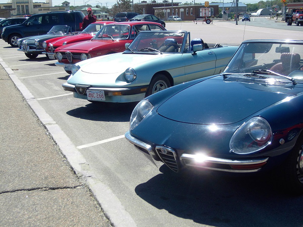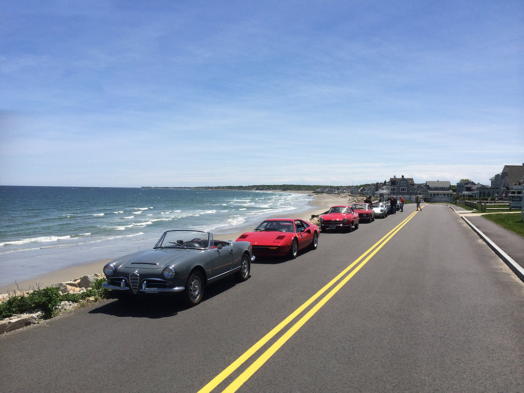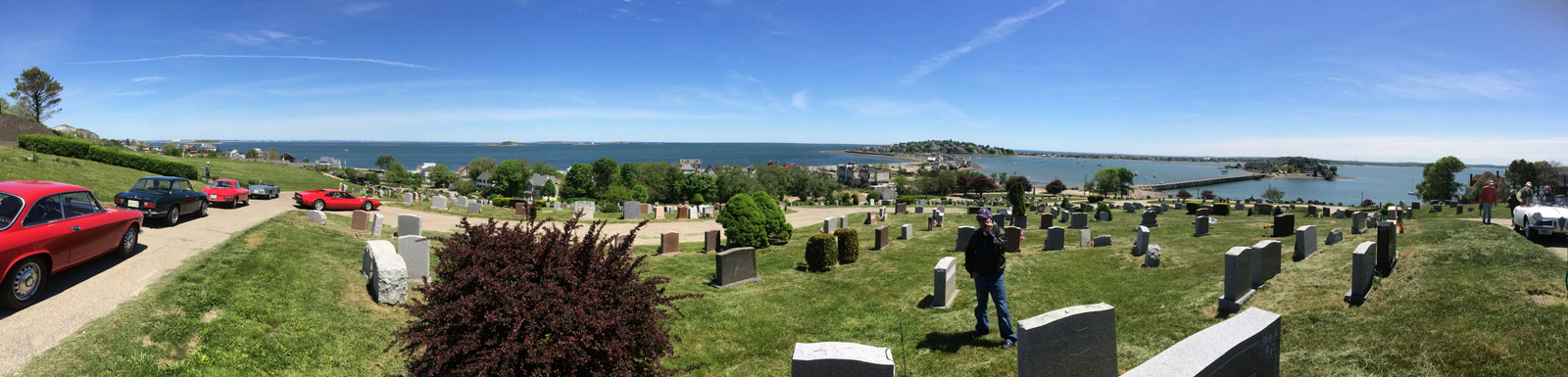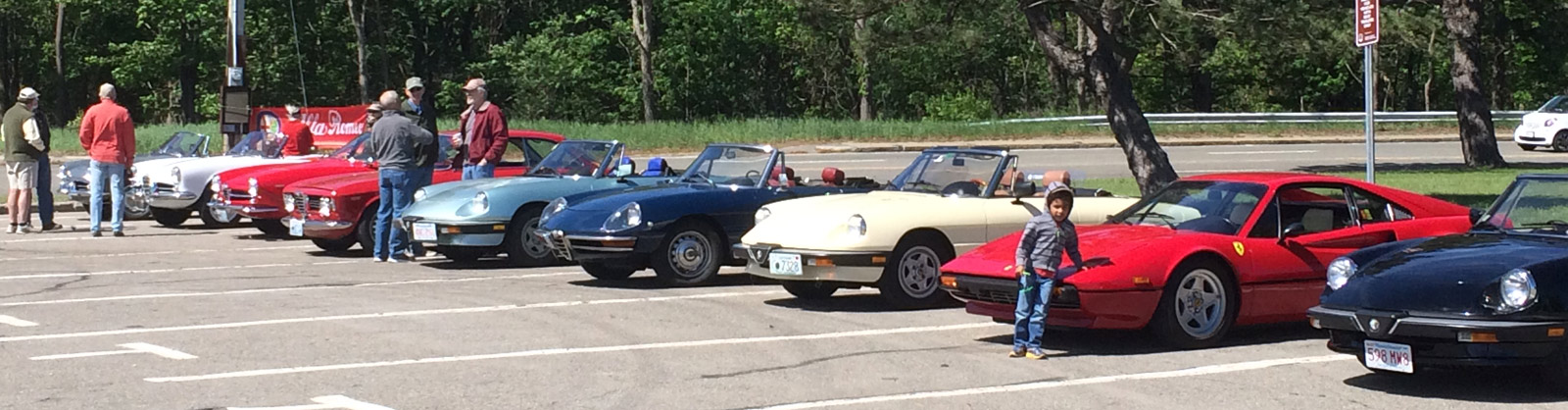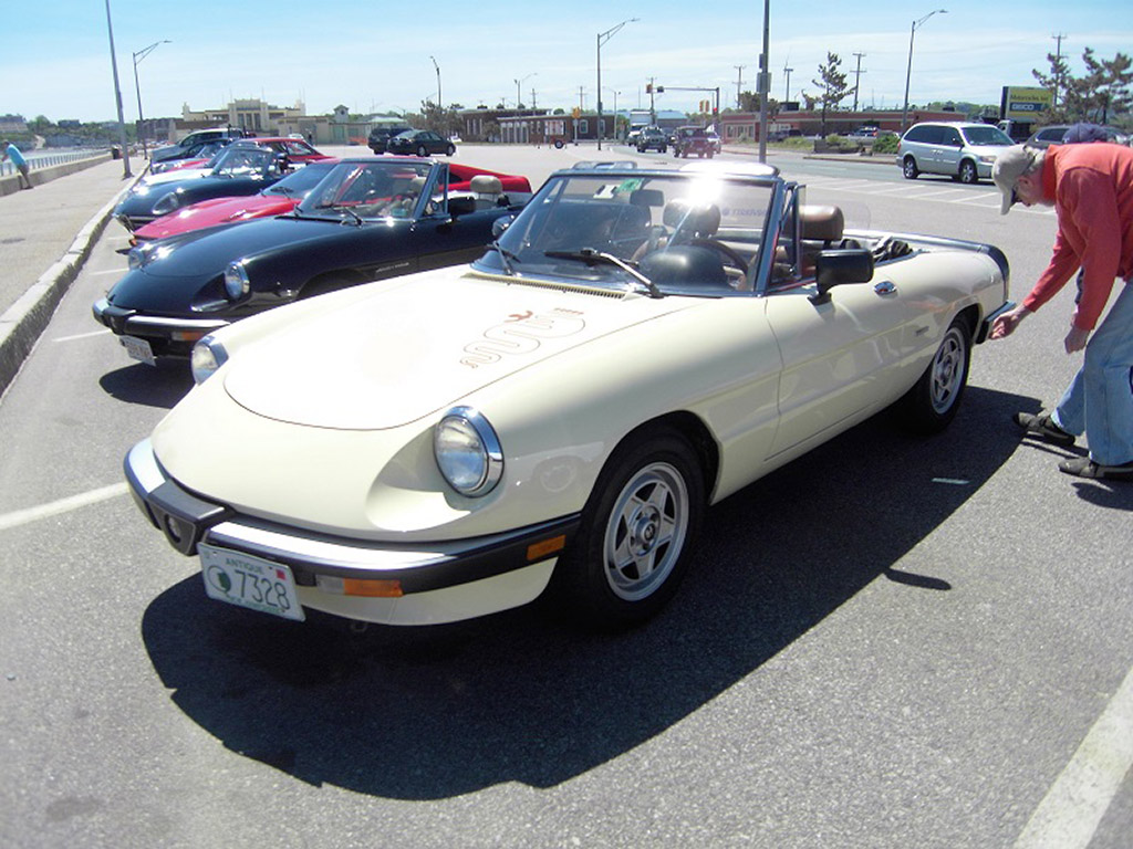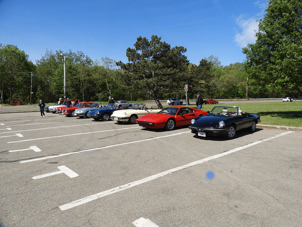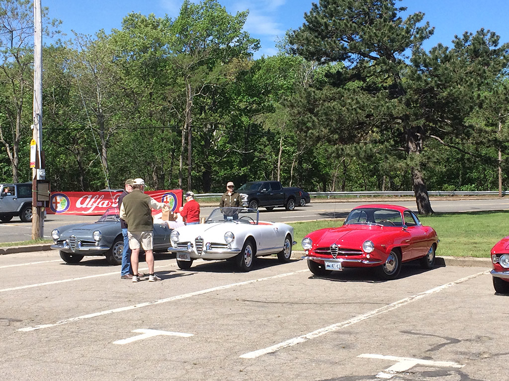 By Tom Lesko I began the South Shore Beach and Waterfront Tour 11 years ago and it is still a beautiful drive in beautiful Alfas in beautiful, spring weather — still such a great day. We were joined by Spiders older and newer, a GT and GTV, a Sprint Speciale, and a Ferarri. Ten cars in all and fourteen members. After our traditional meet-and-greet, coffee, and munchkins, I handed out color maps with the day's route indicated in light Alfa red. Similar to past years, our tour included a swing around Hingham Harbor, Crow Point, and the Hingham Yacht Club, and then on to Nantasket Beach for an ocean view and "pause for the cause" at the local Dunkin Donuts. From there, it was a short drive to the summit of the Hull cemetery for a nearly-360º view (a view to die for ;-) of the beaches, islands, and bays of the South Shore — fantastic! Continuing on to the end of the Hull peninsula and "Hull Gut", we circled back and took a short side trip out to Spinnaker Island in Hingham Bay to see the remains of the early 20th century "Fort Duvall" coast artillery placement of two 16" guns strategically located to protect the coast. The guns are long gone, and condominium units have replaced them on the old fort's foundations. Then it was on to the "gold coast" of Cohasset, where the ocean views and beautiful homes were in their usual visual splendor. The Minot Lighthouse overview was our next stop after a nice, twisty stretch that allowed us to exercise our engines a bit. We then toured back over the spectacular roadways of Cohasset and went to Jake's Seafood Restaurant at Steamboat Wharf in Nantasket for a wonderful lunch and conversation. A good time was had by all — looking forward to our next AONE event — see you there! Tom Lesko - 1965 Giulia Spider Veloce ("Grumpy")