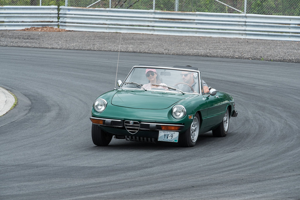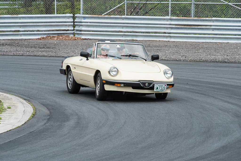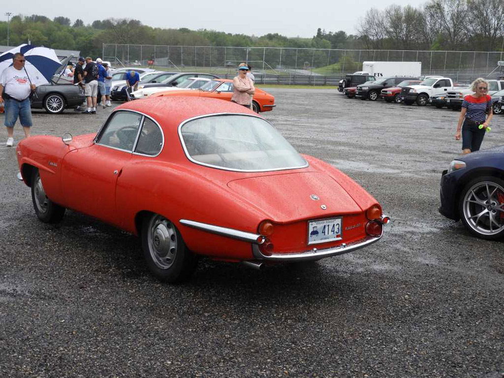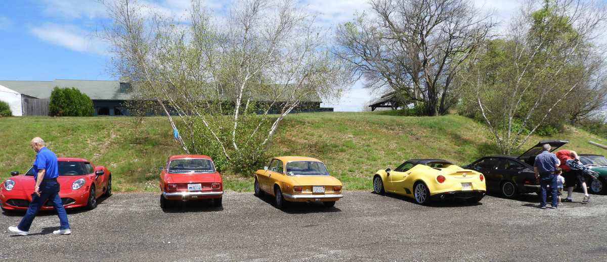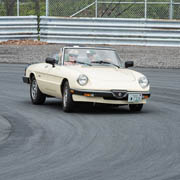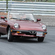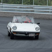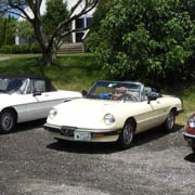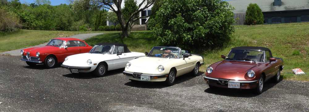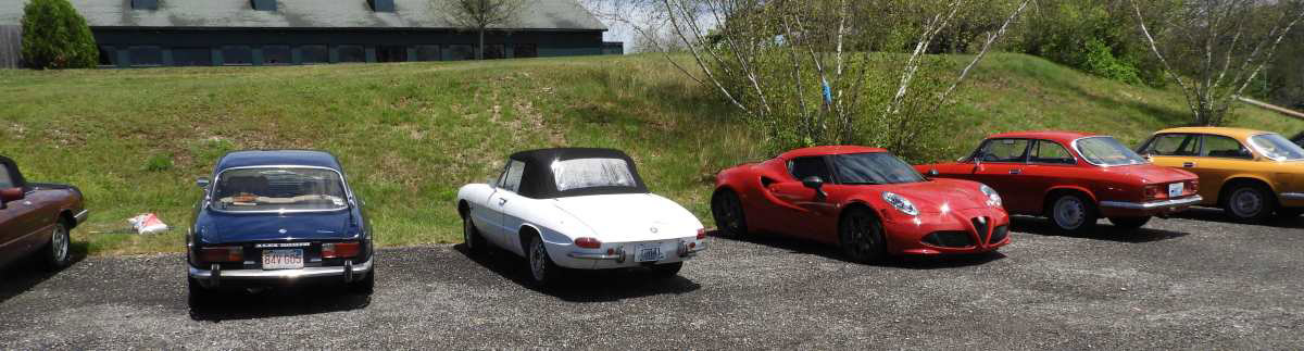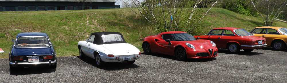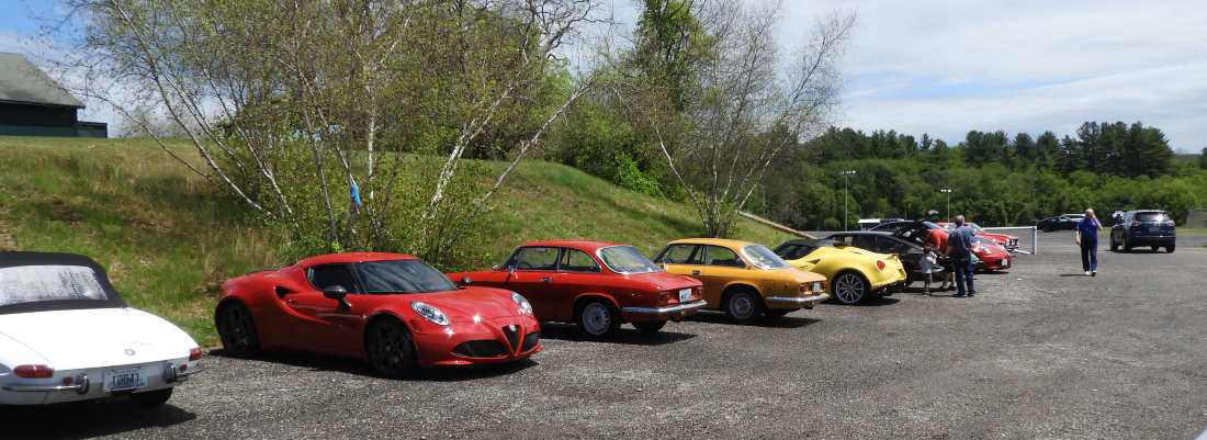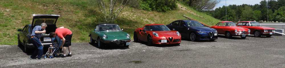 The fourth annual Thompson Motorsports Vintage Weekend and Alfa Romeo Corral greeted fans and racers alike with some early-morning damp and rainy conditions. As the racers guided their wonderful (and fragile) machines around the damp track, the Alfista faithful wandered in with tops up and sunroofs closed. Fortunately, late morning saw clearing skies and warm temperatures! Although I have been following vintage racing for some 48 years (I saw my first Alfa at Thompson in the summer of 1968), I found the racing quite confusing! As always, there were mixed classes running together, but there were some races that included a selection of cars, while many (but not all) of those same cars ran in another race. My conclusion is that this had something to do with the dual sanctioning, but I'm definitely not certain. A suggestion was made to the folks at Thompson to ask the vintage clubs to offer a basic fan guide for future events. During the track workers' lunch break, we were treated to several laps around the track. Remember what I said earlier about sunny skies? Well, about three laps into the parade laps the sky opened up in a very big way! Although some tops were rapidly lifted, a particular 4C Spider owner found out that his modern targa roof does not go up as quickly as his old spider top (right, Gene)? As I looked across the track at Jim and Patti DeWaele's impressive lunch spread, I witnessed lightning reflexes as everything was scooped up and safely stored in the trusty Subaru! With the rain disappearing as quickly as it came, the grill was fired up and Jim and Patti treated everyone to a wonderful lunch — hotdogs, burgers and sausage with all the fixin's, including peppers and fried onions, topped off with a scrumptious salad from Nancy Perry! As lunch wrapped up, the racing resumed. Alfa racer Roger Cassin generously set up a canopy to give us some much-needed shade as the caterpillars did quite a job on the speedway's trees (by the way, nice drives, Roger!). All in all, it was a great day — Alfas, race cars, great food and, as always, wonderful camaraderie! See you next year! [Hats off to Gene Durso, John and Jim DeWaele, Tom Letourneau, Dan Donovan, and the other AONErs who did such a splendid job organizing the Alfa Car Corral! —Ed.] Alfa Car Corral Participants Peter Lombardo - 4C