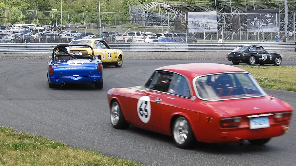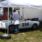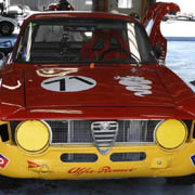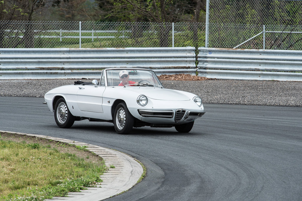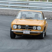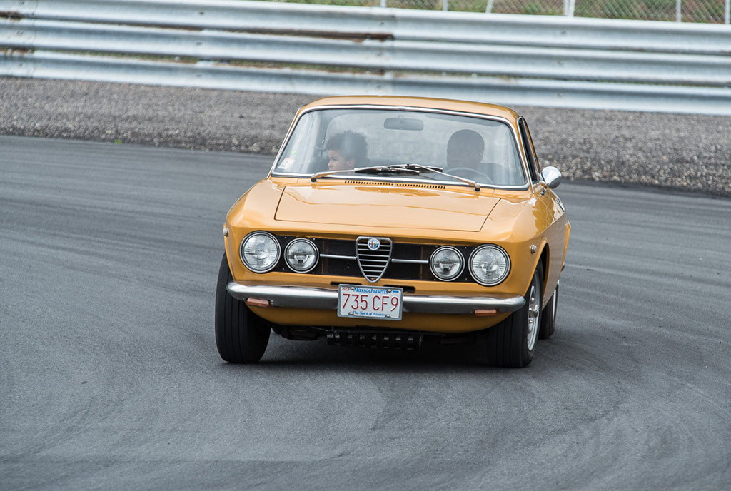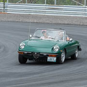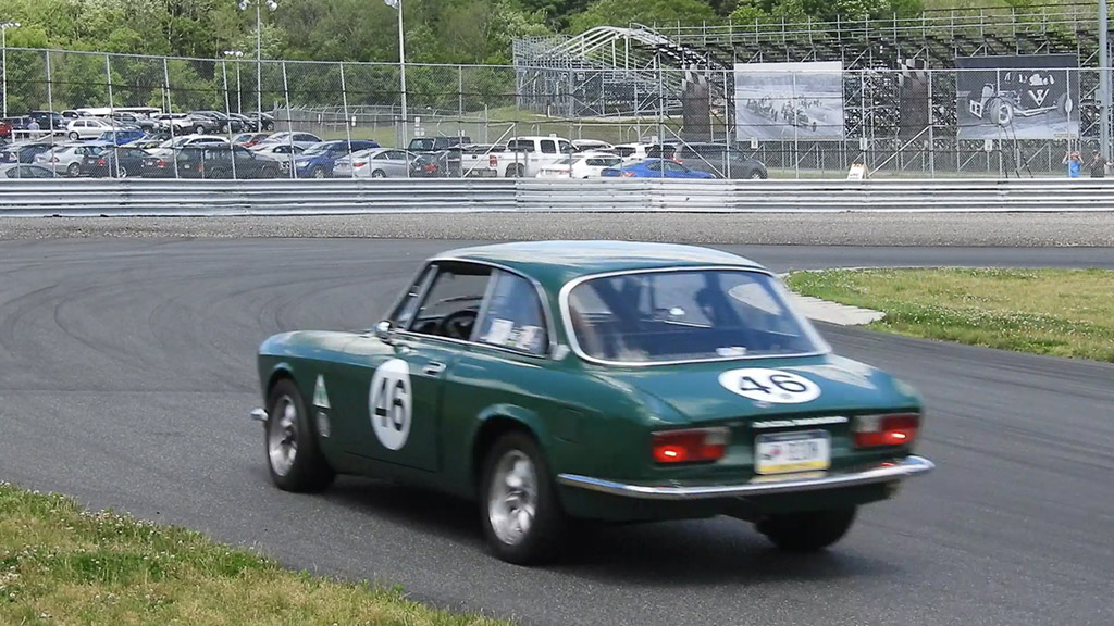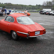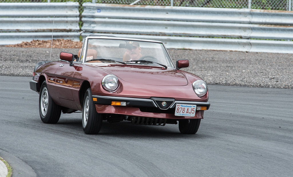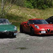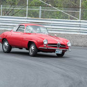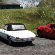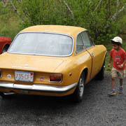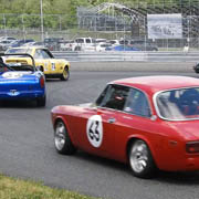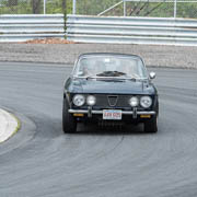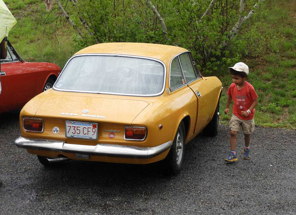 The fourth annual Thompson Motorsports Vintage Weekend and Alfa Romeo Corral greeted fans and racers alike with some early-morning damp and rainy conditions. As the racers guided their wonderful (and fragile) machines around the damp track, the Alfista faithful wandered in with tops up and sunroofs closed. Fortunately, late morning saw clearing skies and warm temperatures! Although I have been following vintage racing for some 48 years (I saw my first Alfa at Thompson in the summer of 1968), I found the racing quite confusing! As always, there were mixed classes running together, but there were some races that included a selection of cars, while many (but not all) of those same cars ran in another race. My conclusion is that this had something to do with the dual sanctioning, but I'm definitely not certain. A suggestion was made to the folks at Thompson to ask the vintage clubs to offer a basic fan guide for future events. During the track workers' lunch break, we were treated to several laps around the track. Remember what I said earlier about sunny skies? Well, about three laps into the parade laps the sky opened up in a very big way! Although some tops were rapidly lifted, a particular 4C Spider owner found out that his modern targa roof does not go up as quickly as his old spider top (right, Gene)? As I looked across the track at Jim and Patti DeWaele's impressive lunch spread, I witnessed lightning reflexes as everything was scooped up and safely stored in the trusty Subaru! With the rain disappearing as quickly as it came, the grill was fired up and Jim and Patti treated everyone to a wonderful lunch — hotdogs, burgers and sausage with all the fixin's, including peppers and fried onions, topped off with a scrumptious salad from Nancy Perry! As lunch wrapped up, the racing resumed. Alfa racer Roger Cassin generously set up a canopy to give us some much-needed shade as the caterpillars did quite a job on the speedway's trees (by the way, nice drives, Roger!). All in all, it was a great day — Alfas, race cars, great food and, as always, wonderful camaraderie! See you next year! [Hats off to Gene Durso, John and Jim DeWaele, Tom Letourneau, Dan Donovan, and the other AONErs who did such a splendid job organizing the Alfa Car Corral! —Ed.] Alfa Car Corral Participants Peter Lombardo - 4C