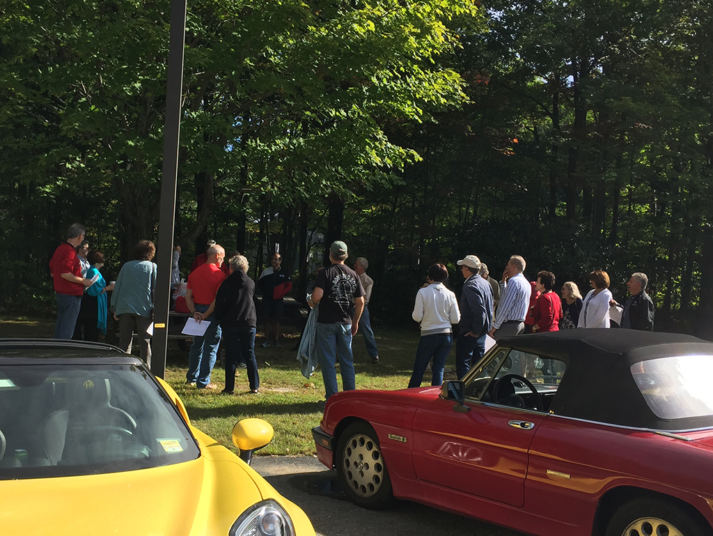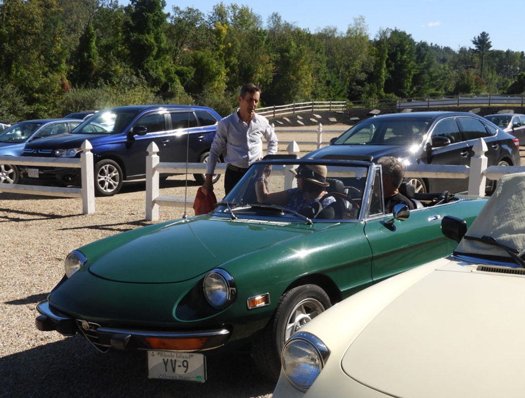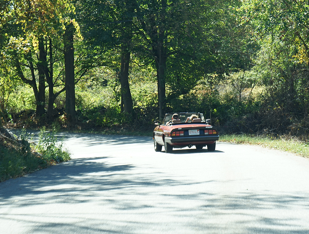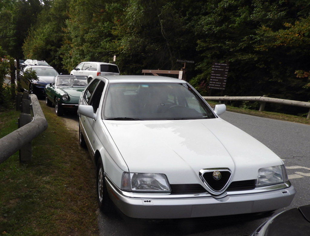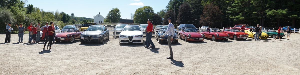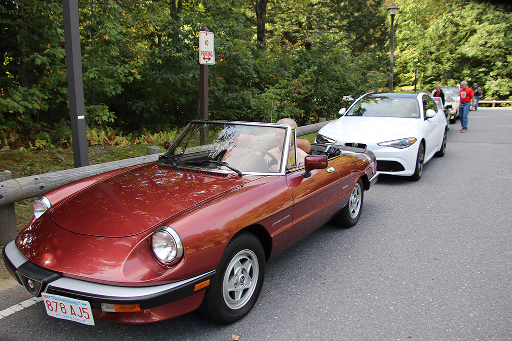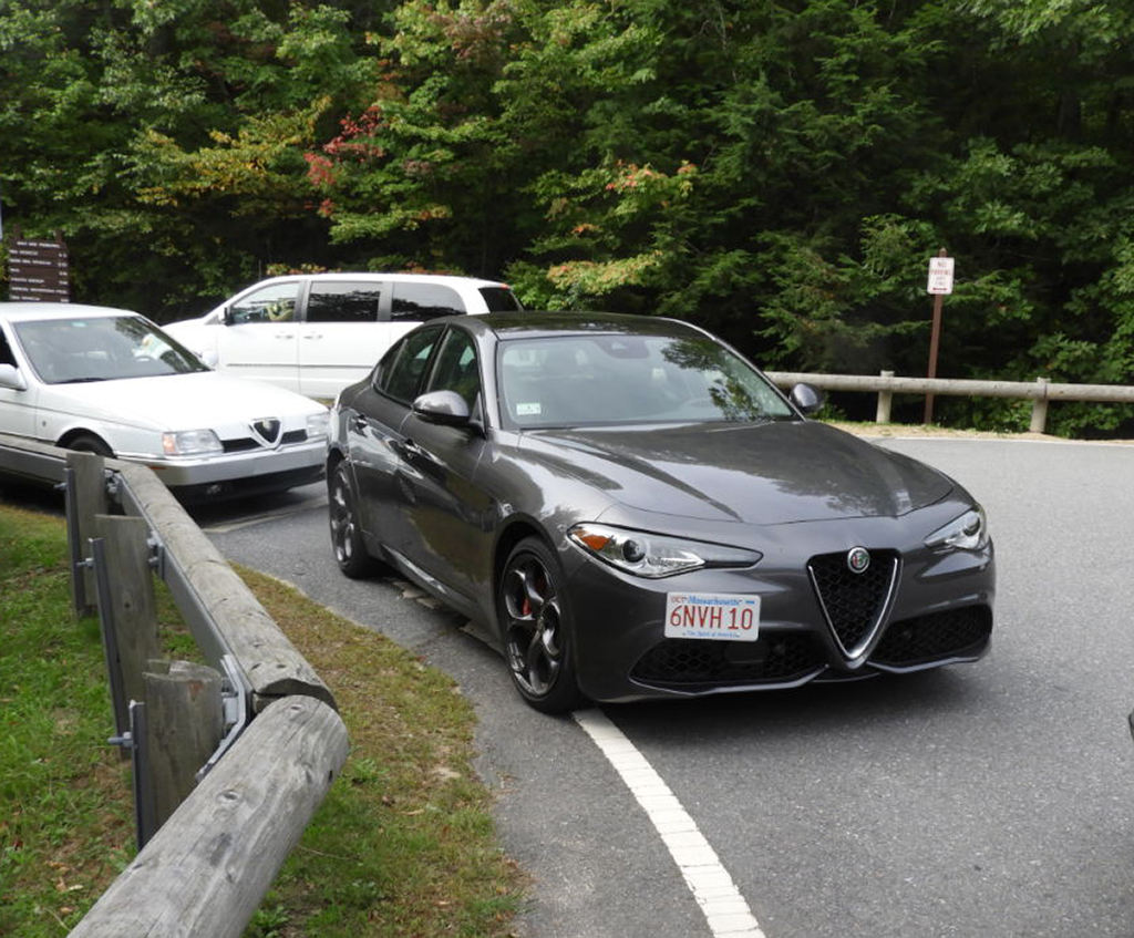 First of all, Saturday morning dawned on a beautiful, dry day. I was going to get to enjoy the tour in optimum conditions. And the other cars, all thirteen of them, were like me, Italian: five 1980s Alfa Spiders (the 1984 of Bob Rupp and Barb Smith, the 1986 of Bill Migliore and Tom Letourneau, the 1988 of tour organizers Deb and Dan Donovan, and two 1987 models, one belonging to Roberta and John Rowntree and the other to Marco Di Martino and Humberto Di Martino), two 1974 Spiders (one belonging to John and Lauren DeWaele and the other to Tom Freiberger), a 1994 164LS (driven by Frank LaSala and Mary Demers), a 1967 Giulia Sprint GT (driven by Mike Hollinger), a 2016 4C Spider (driven by Gene and Judy Durso), and three almost brand-new 2017 Alfa Giulia sedans (a white one belonging to Robert Rook and Adrien Sipos, a grey one belonging to Dave and Vi Pratt, and a blue one belonging to Greg and Andrea Stidsen). Some of the Giulias were a little reluctant, at first, to accept me as anything other than a poor relative.
