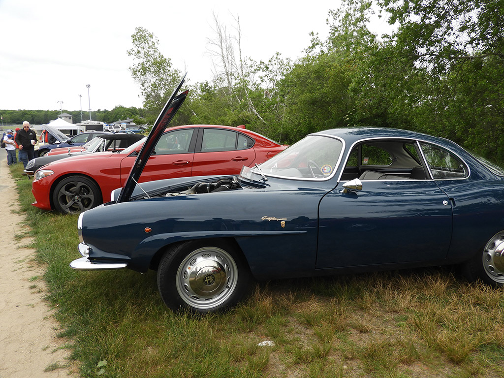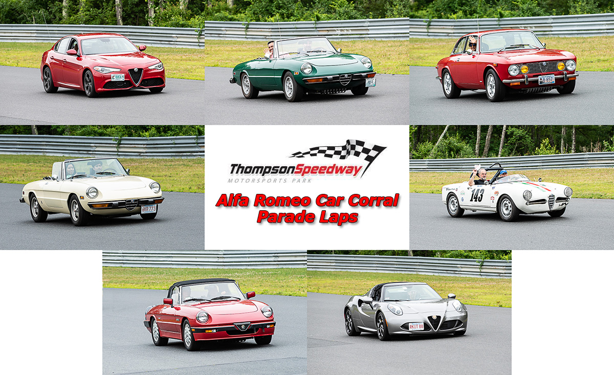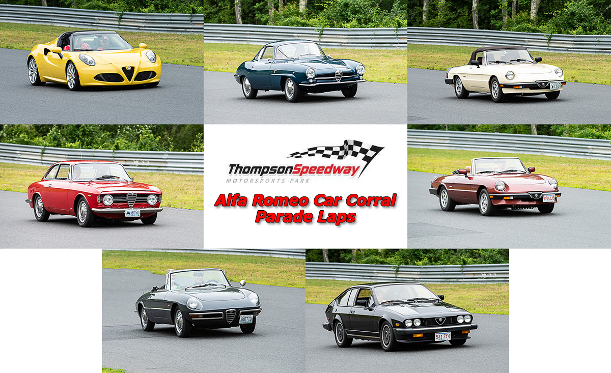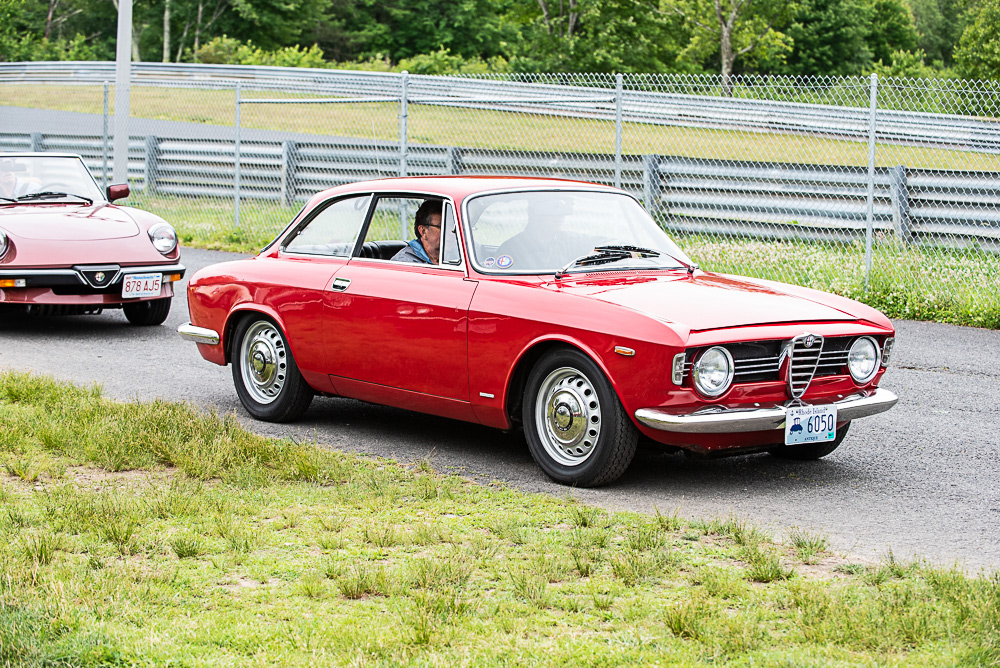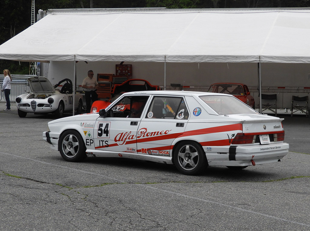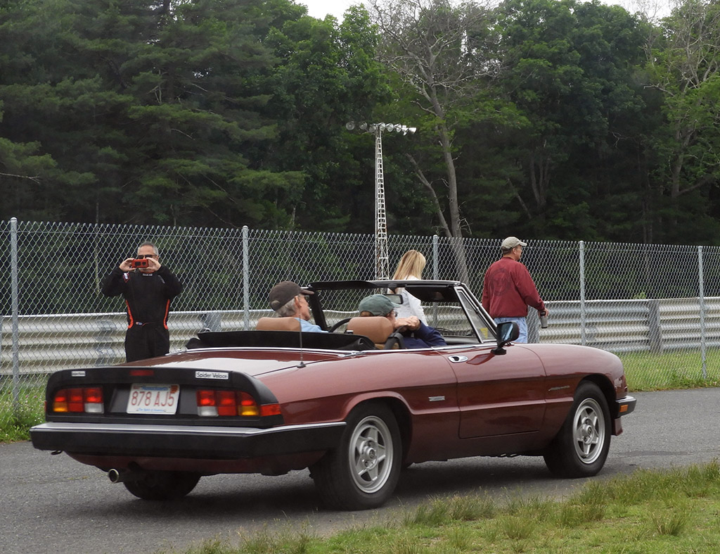 Two reports on a great weekend! Italian Horsepower at the Old Thompson Corral It was a delightful day for Alfa Romeo ownership when Alfa Club members gathered on June 23rd at the Thompson Motorsports facility in rural Connecticut. I had actually arrived on Thursday for the first day of racing, cheering on veteran English Formula Ford driver Richard Morris as he took up racing again after a three-year hiatus and a costly engine overhaul. By Saturday, the facility was much fuller, a full range of Alfas were on the track, and our garage space was close to a red GTV and a white Milano, both of which saw track time. When I returned Saturday, the place was in full swing, with a few more racing Alfas circulated the track and a lot of passenger-class Alfas and Alfisti, most of them moving to the lovely grassed area off the service road between the track's two paddock areas along the main straight. As most who read the emails regarding the corral, it moved this year from the main stone parking area adjacent to the oval across the bridge and to the more comfortable grass area. This was due in part, I understand, to the irresistible pressure of Tom Letourneau, who was an ebullient presence as always, driving his Team Thompson one-lung golf cart with precision and purpose. I noticed that he put his remarkable, Corvette-powered Jaguar Van den Plas sedan out on display and sale, and it looked terrific, as ever. I love most all vintage racing, and the Alfas had a number of opportunities to shine over the weekend. Thompson's new (with the reopening of the road course section of the track a few years ago) sweeping series of turns and short chutes that begin at the end of the main straight and snaked onto the left under the bridge onto the banked oval section provided a good point of view, but there are so many other places to catch the action. I'll always love the sound of an Alfa four cylinder, but the wail of the GTV6 and Milano Verde race cars ruled my ears that day as they entered the last short chute leading to the left under the bridge. The tallish Milano wobbled about on the changing camber onto the oval like a DTM Touring Car champion, while the GTV6 had an eerily tenacious grip that kept the car beautifully planted, haring around the circuit effortlessly. When one considers the relative rarity of an Alfa Romeo on the road, it makes sense to make the most of an opportunity to see and be seen in an ubiquitous Spider, a relatively rare GTV6, Sprint Speciale, 4C, Giulia and Giulia Quadrifoglio, a Milano, a Giulietta, Berlina, or any number of other models that either raced at or rallied to Thompson Motorsports Park that morning under cloudy skies. While they were all there in force, an ongoing cold must have addled my mind, because I didn't bring my '86 Spider Graduate out of a weirdly deep-seated worry about how heavy the rain might fall. Now, it doesn't really matter that there was NO significant rain from 8:45 am right up to 5pm when I left. What mattered was my lack of commitment to showing up in an Alfa Romeo on a day when no really heavy rain was forecast. Around Noon, when we were about to go out on the track for parade laps, I had to ask for a ride, which was granted, and I rode in a lovely 1989 Spider Quadrifoglio driven by the inestimable Kent Worthington. His car must be worth at least a few hundred dollars more than my lowly Graduate, and he didn't have any trouble deciding to bring it. And then there were the really valuable cars, whose owners didn't have a problem bringing them either. Thompson officials were generous with their parade laps, and the Camaro pace car set of at a good clip after checking to see that the entire troupe of cars was visible along the straight. We were in the midfield, and Kent drove with flair and skill, followed by a yellow 4C lulled into somnolence by our relatively modest performance potential. We followed Tom Larsen's Sprint Speciale. No parade this, fast enough to feel the car's grip on corners, but not fast enough to raise the red mist. Kent hadn't been sure he would take the parade laps following an incident that morning where he stopped briefly on his short trip, re-entered the car and experienced an oh-no moment of the brake pedal flopping to the floor. But it only happened once, and was fine thereafter: possibly some air in the lines? But just in case, Kent left most of the braking to the engine, executing many well-organized downshifts and keeping the revs up. That only added to the fun. Five full laps later, we exited our cars and proceeded to a lovely cookout picnic that tasted wonderful. Many, many thanks to Jim and Patti DeWaele for putting on the terrific spread for us! I started to talk to a few Alfisti about my poor decision to leave the Spider home that morning. Kent had a good response: Does it really matter if any of our Alfas are exposed to rain for a day? What harm can it really do? Even if were to rain at the relatively small number of events one attends in the space of a year, it still wouldn't have an obvious impact on the cars over the many years we own them. And it is a lot more fun than leaving them behind. Then and there, I resolved to treat my car as it was designed to be treated, as a wonderful piece of driving involvement whose running is not mutually exclusive to the existence of rain. After all, If Tom, the owner of a very worthy Sprint Speciale, can turn the key in less-than-perfect weather, why should I hesitate to do likewise in my own fractionally worthy machine? Thanks to all the organizers, and to Thompson for making us feel welcome yet again. Kudos to the staff at the office near the main entrance who continue to make a terrific, friendly impression.