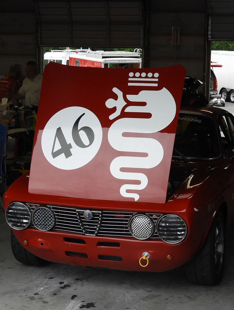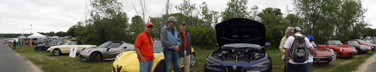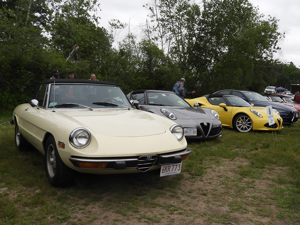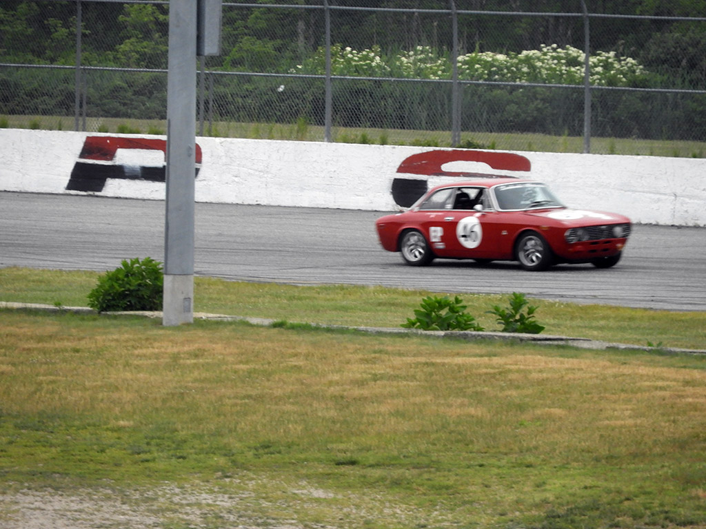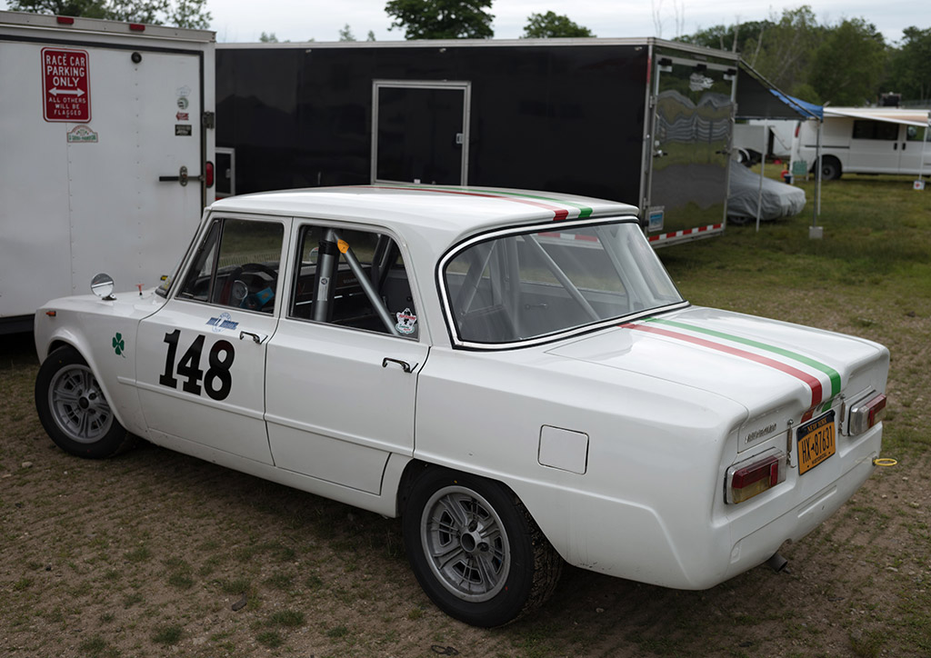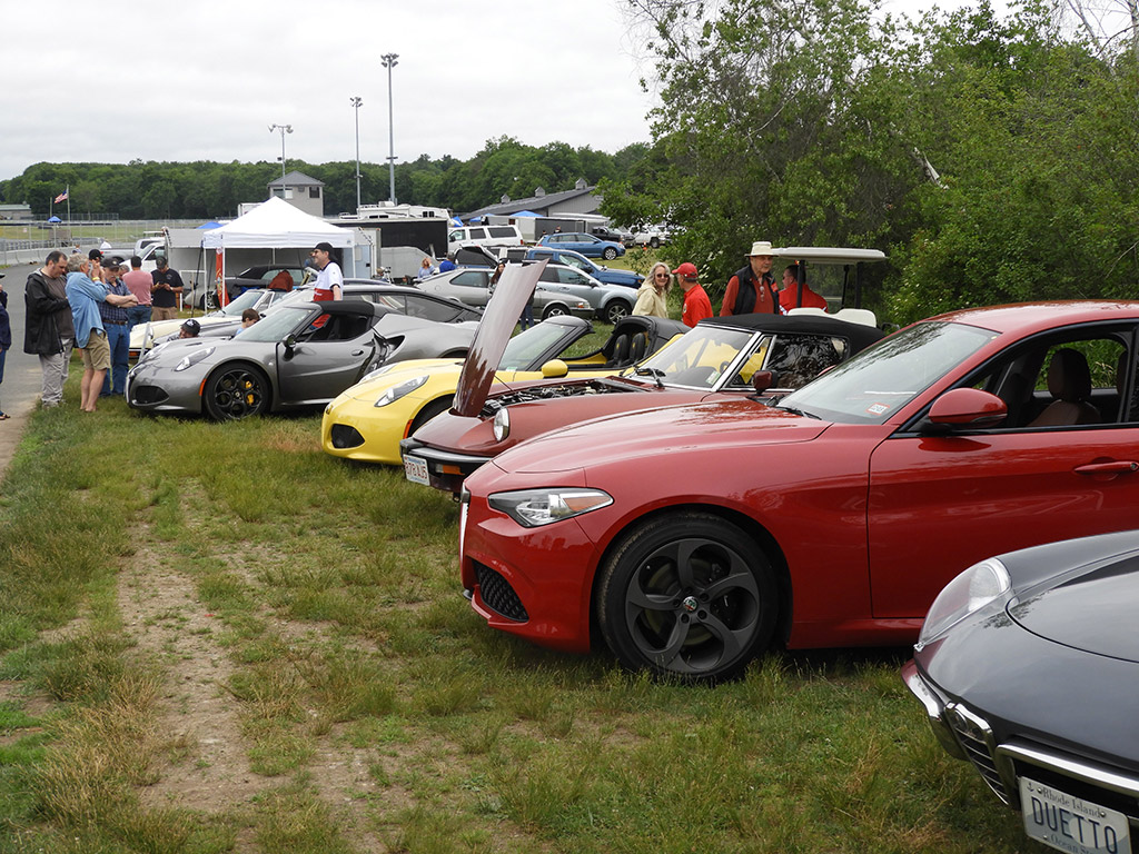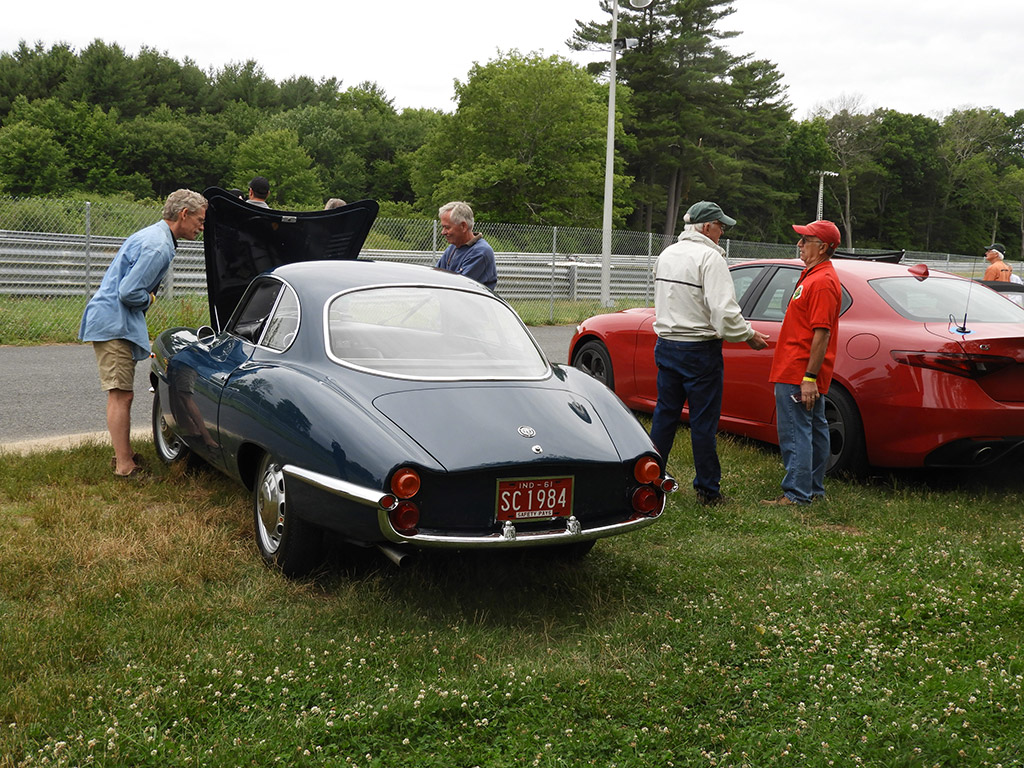 Two reports on a great weekend! Italian Horsepower at the Old Thompson Corral It was a delightful day for Alfa Romeo ownership when Alfa Club members gathered on June 23rd at the Thompson Motorsports facility in rural Connecticut. I had actually arrived on Thursday for the first day of racing, cheering on veteran English Formula Ford driver Richard Morris as he took up racing again after a three-year hiatus and a costly engine overhaul. By Saturday, the facility was much fuller, a full range of Alfas were on the track, and our garage space was close to a red GTV and a white Milano, both of which saw track time. When I returned Saturday, the place was in full swing, with a few more racing Alfas circulated the track and a lot of passenger-class Alfas and Alfisti, most of them moving to the lovely grassed area off the service road between the track's two paddock areas along the main straight. As most who read the emails regarding the corral, it moved this year from the main stone parking area adjacent to the oval across the bridge and to the more comfortable grass area. This was due in part, I understand, to the irresistible pressure of Tom Letourneau, who was an ebullient presence as always, driving his Team Thompson one-lung golf cart with precision and purpose. I noticed that he put his remarkable, Corvette-powered Jaguar Van den Plas sedan out on display and sale, and it looked terrific, as ever. I love most all vintage racing, and the Alfas had a number of opportunities to shine over the weekend. Thompson's new (with the reopening of the road course section of the track a few years ago) sweeping series of turns and short chutes that begin at the end of the main straight and snaked onto the left under the bridge onto the banked oval section provided a good point of view, but there are so many other places to catch the action. I'll always love the sound of an Alfa four cylinder, but the wail of the GTV6 and Milano Verde race cars ruled my ears that day as they entered the last short chute leading to the left under the bridge. The tallish Milano wobbled about on the changing camber onto the oval like a DTM Touring Car champion, while the GTV6 had an eerily tenacious grip that kept the car beautifully planted, haring around the circuit effortlessly. When one considers the relative rarity of an Alfa Romeo on the road, it makes sense to make the most of an opportunity to see and be seen in an ubiquitous Spider, a relatively rare GTV6, Sprint Speciale, 4C, Giulia and Giulia Quadrifoglio, a Milano, a Giulietta, Berlina, or any number of other models that either raced at or rallied to Thompson Motorsports Park that morning under cloudy skies. While they were all there in force, an ongoing cold must have addled my mind, because I didn't bring my '86 Spider Graduate out of a weirdly deep-seated worry about how heavy the rain might fall. Now, it doesn't really matter that there was NO significant rain from 8:45 am right up to 5pm when I left. What mattered was my lack of commitment to showing up in an Alfa Romeo on a day when no really heavy rain was forecast. Around Noon, when we were about to go out on the track for parade laps, I had to ask for a ride, which was granted, and I rode in a lovely 1989 Spider Quadrifoglio driven by the inestimable Kent Worthington. His car must be worth at least a few hundred dollars more than my lowly Graduate, and he didn't have any trouble deciding to bring it. And then there were the really valuable cars, whose owners didn't have a problem bringing them either. Thompson officials were generous with their parade laps, and the Camaro pace car set of at a good clip after checking to see that the entire troupe of cars was visible along the straight. We were in the midfield, and Kent drove with flair and skill, followed by a yellow 4C lulled into somnolence by our relatively modest performance potential. We followed Tom Larsen's Sprint Speciale. No parade this, fast enough to feel the car's grip on corners, but not fast enough to raise the red mist. Kent hadn't been sure he would take the parade laps following an incident that morning where he stopped briefly on his short trip, re-entered the car and experienced an oh-no moment of the brake pedal flopping to the floor. But it only happened once, and was fine thereafter: possibly some air in the lines? But just in case, Kent left most of the braking to the engine, executing many well-organized downshifts and keeping the revs up. That only added to the fun. Five full laps later, we exited our cars and proceeded to a lovely cookout picnic that tasted wonderful. Many, many thanks to Jim and Patti DeWaele for putting on the terrific spread for us! I started to talk to a few Alfisti about my poor decision to leave the Spider home that morning. Kent had a good response: Does it really matter if any of our Alfas are exposed to rain for a day? What harm can it really do? Even if were to rain at the relatively small number of events one attends in the space of a year, it still wouldn't have an obvious impact on the cars over the many years we own them. And it is a lot more fun than leaving them behind. Then and there, I resolved to treat my car as it was designed to be treated, as a wonderful piece of driving involvement whose running is not mutually exclusive to the existence of rain. After all, If Tom, the owner of a very worthy Sprint Speciale, can turn the key in less-than-perfect weather, why should I hesitate to do likewise in my own fractionally worthy machine? Thanks to all the organizers, and to Thompson for making us feel welcome yet again. Kudos to the staff at the office near the main entrance who continue to make a terrific, friendly impression.
