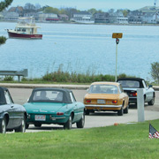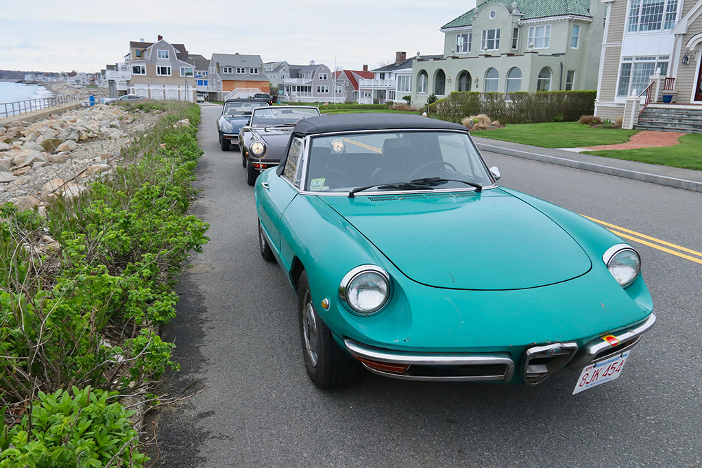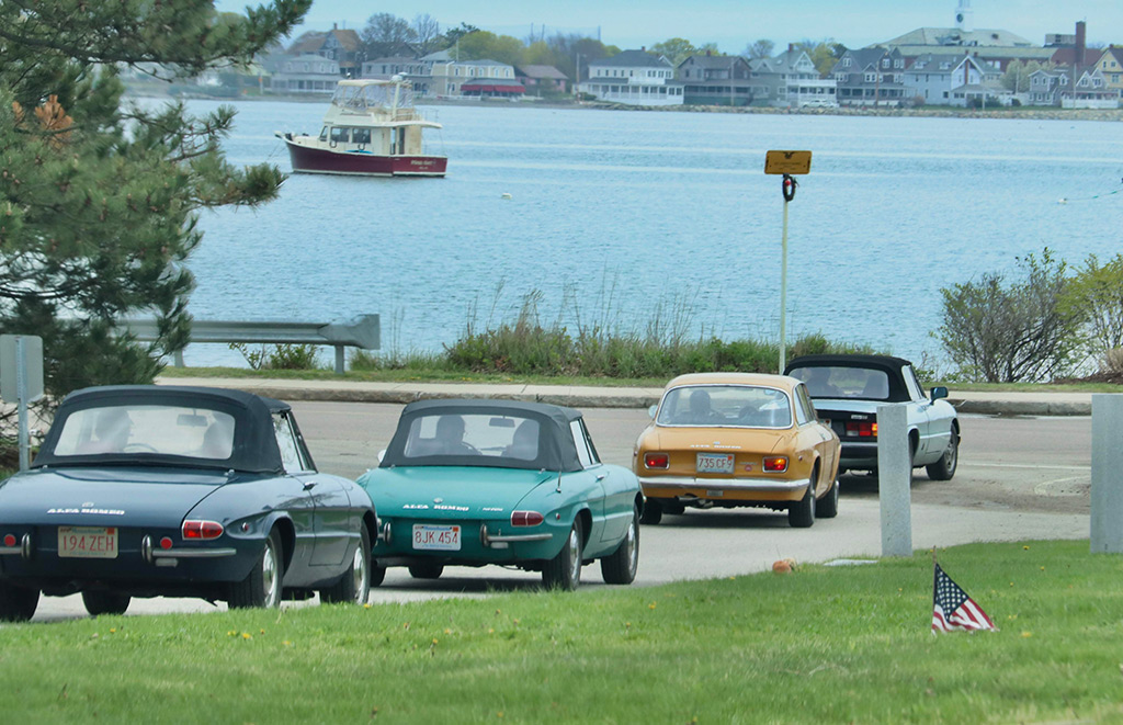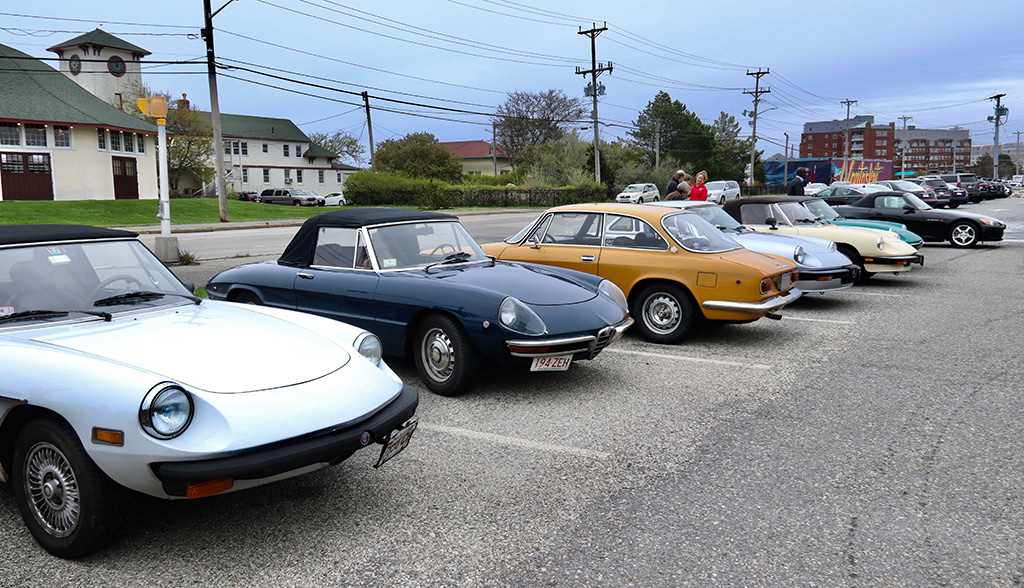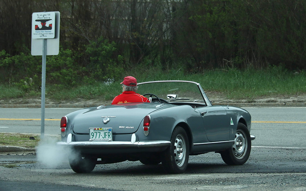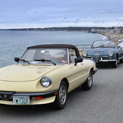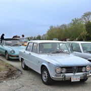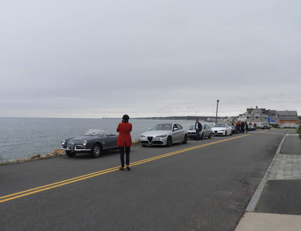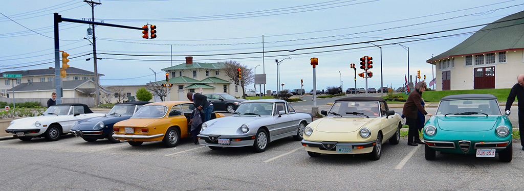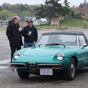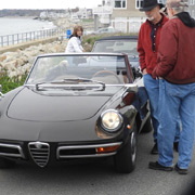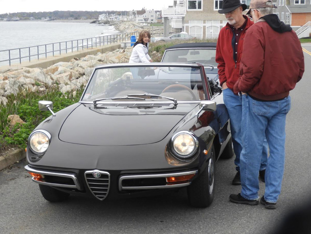 By Tom Lesko The day started with coolish weather and a just a very few sprinkles but that did not deter hearty Alfa people with spiders ... top down, of course! The weather improved some as the day went by. Tom arrived early and met 24 members and family with coffee, muffins and conversation as they arrived. Later, he passed out the "custom" route maps and explained the tour, which started with a loop around Hingham harbor. At the first stop sign, two Stelvios passed by, one in each direction. I believe those Stelvios winked and smiled ;-) as their owners waved to their elder (Tom's '65 Giulia Spider Veloce) as they went by. The tour went well, but because of the large number of cars, we were split up after touring Nantasket beach, Hull and Spinnaker Island. All was well, though, as members found their way to the "photo op stop" at Minot lighthouse beach, where we spent a few minutes chatting and taking in the spectacular view. We then traced our route back through Scituate, Cohasset harbor and "Little Harbor", and finally back to Hull for lunch at Jake's Seafood Restaurant. Plenty of great food and beverages were enjoyed over conversation and we all vowed to see each other at the next AONE event! Tom Lesko - 1965 Spider Veloce ("Grumpy") |