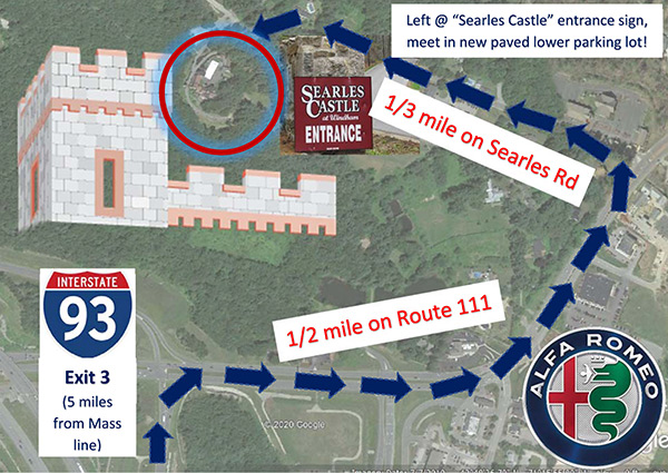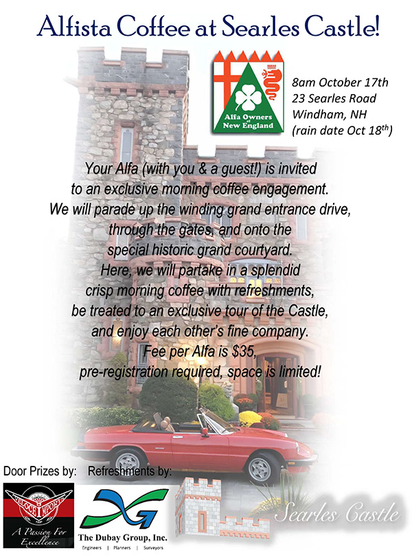Don't hang up your Alfa's car keys just yet! We've got one more event lined up in the form of a private tour of the gorgeous Searles Castle in Windham, NH on Sunday, October 18th. New AONE member Karl Dubay has made all of the arrangements and will be providing coffee and goodies. In addition, Londonderry Alfa Romeo specialists Veloce Imports will be supplying door prizes! We will gather at 8:00 AM in the lower parking lot at the bottom of the long, winding driveway, and then motor up as a group to the top, where we will park together in the exclusive courtyard. Talk about an Alfa Romeo photo op! (Hint: The annual AONE Alfa photo contest is just around the corner.) We'll then be given a private tour of the beautiful castle and grounds, and partake in the refreshments and see what the door prizes are all about! You must pre-register by contacting AONE Director Greg Stidsen at gregorystidsen@gmail.com or 978-884-8617 by the end of the day Friday, October 16th. Bring your own COVID masks; CDC social distancing guidelines will be faithfully observed. Yes, 8:00 AM is an early start, but Searles Castle is just over the Massachusetts line at the first exit off I-93. And will be well worth getting up for! This will be a wonderful way to wind down our season — sign up now!