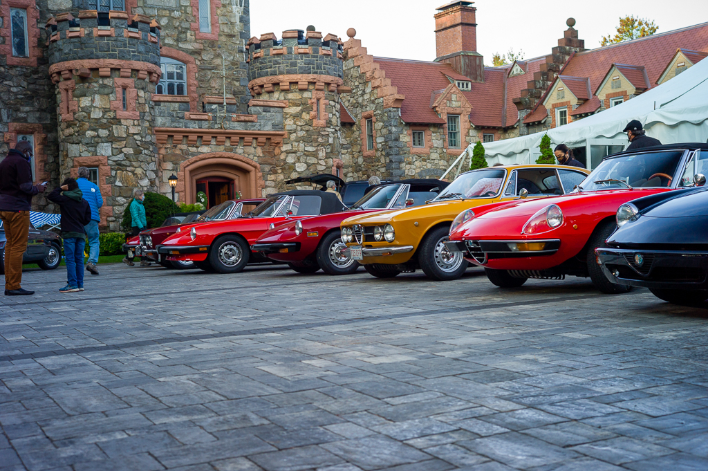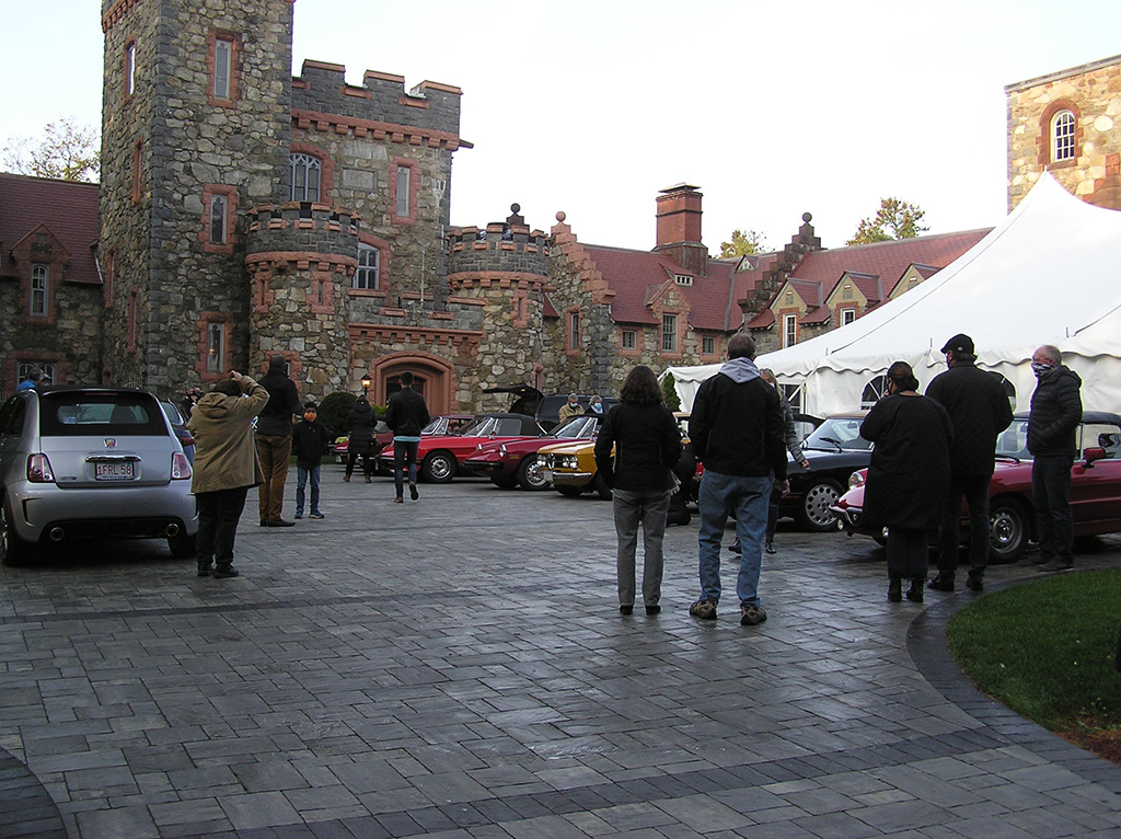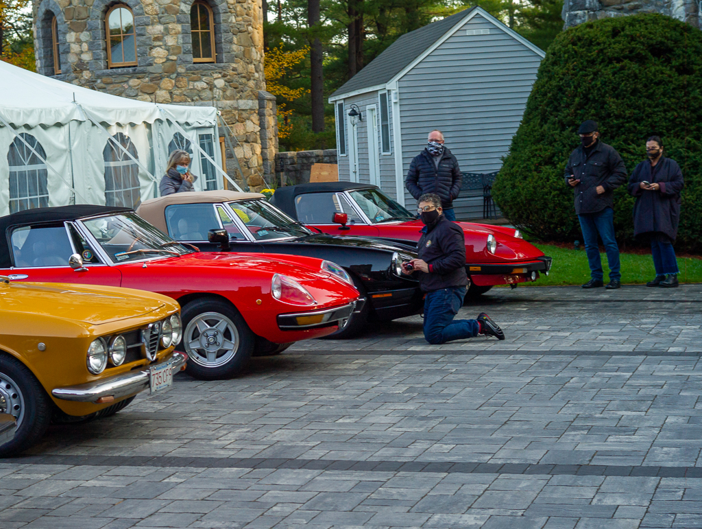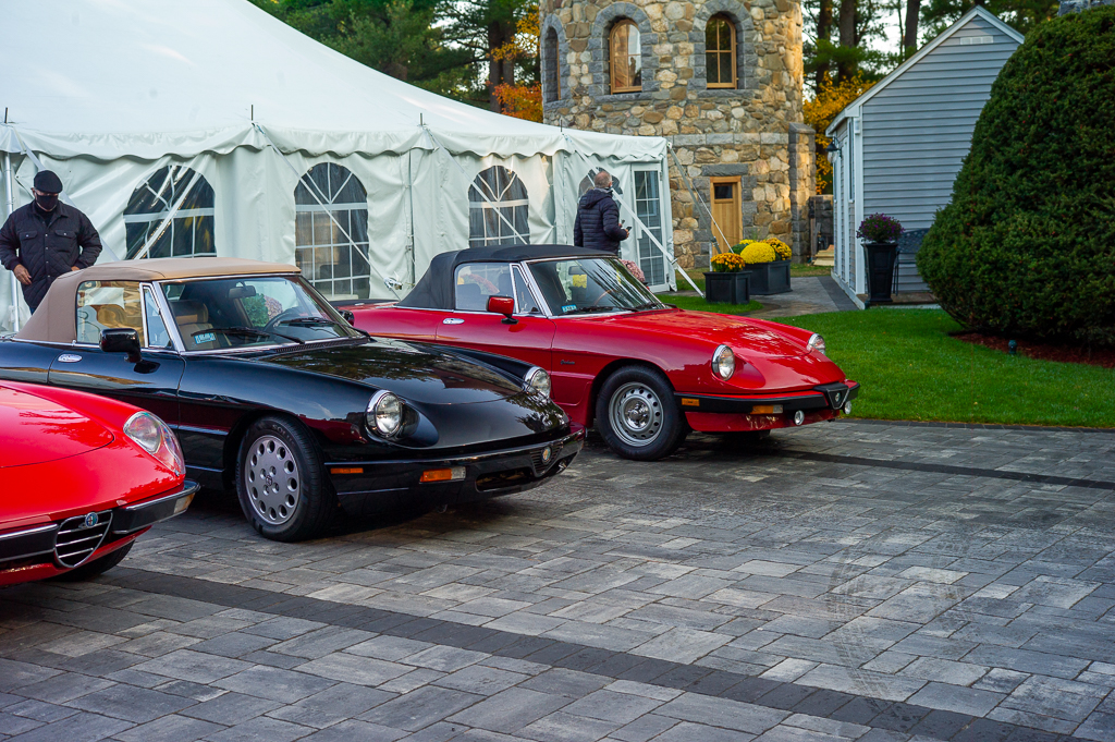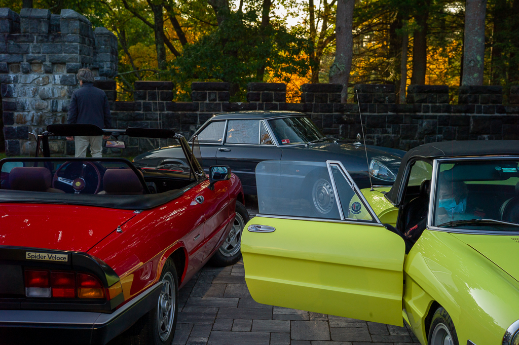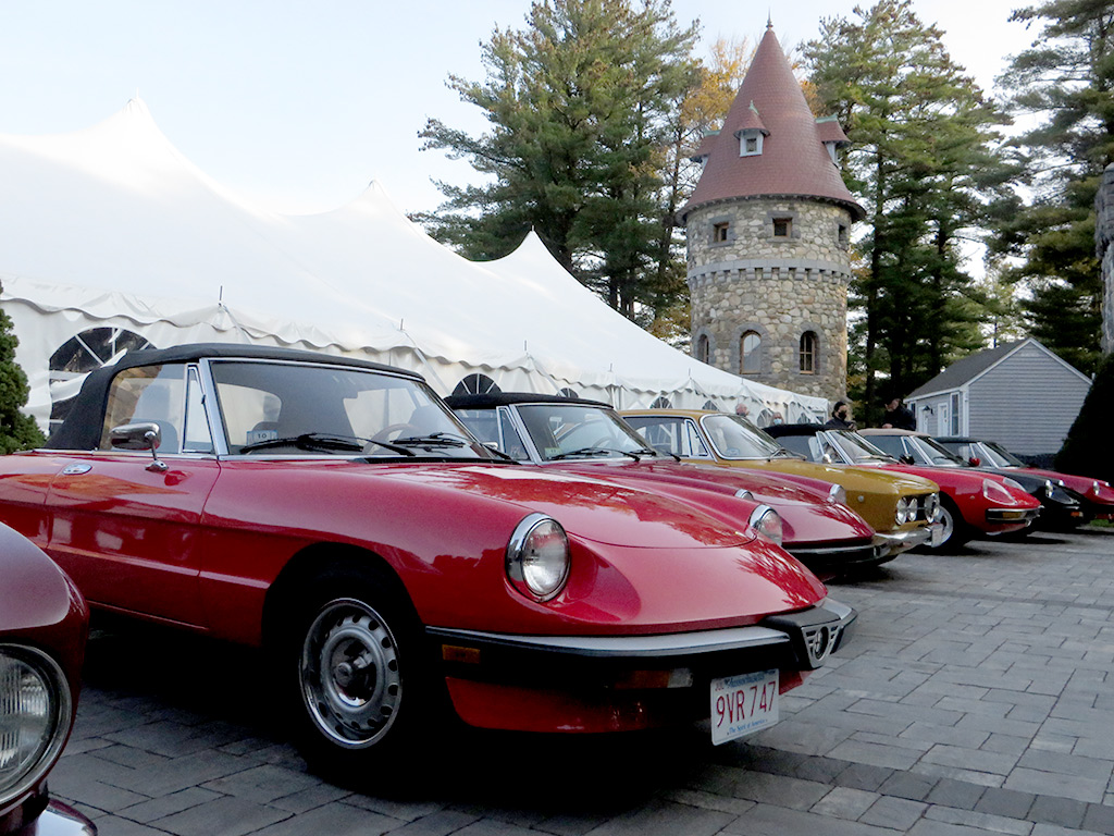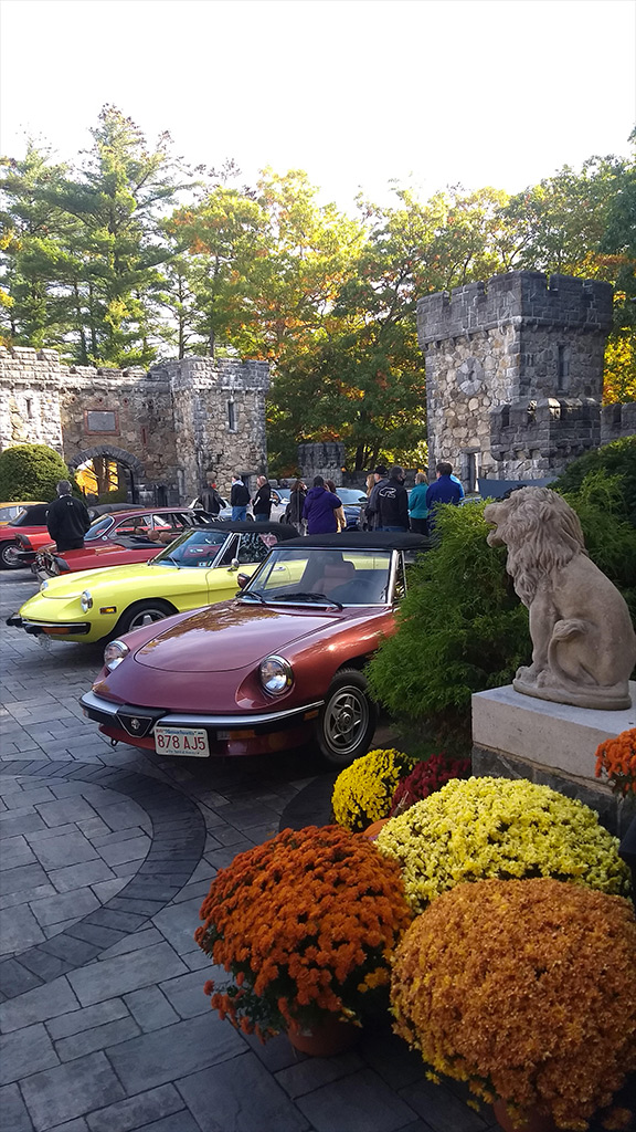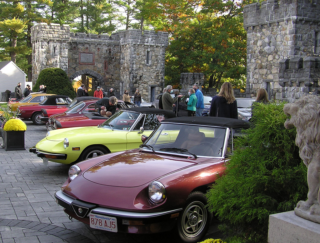 Sunday, October 18th, dawned bright, with cold, ethereal clouds of fog prowling the valleys. The lazy sun slowly emerged, warming the fresh autumn air as streams of light illuminated the fall foliage. Alfisti started gathering at the lower parking area of Searles Castle located in Windham, New Hampshire, at about 7:30 AM for an 8:00 AM event start. Unlike many of our driving events, this was a cars 'n' coffee style event, including a tour of the private castle that was created by interior designer Edward Searles back at the turn of the 20th century. Now owned by an angel investor from California, it is being lovingly refurbished and updated. Club member Karl Dubay's engineering firm has been involved in the project and he was able to pull together what turned out to be a fantastic AONE event. Even though this event came together at the last minute, we had fifteen cars lined up to follow a narrow, winding drive up the hill to the newly renovated courtyard of the castle. Although the castle is located only a couple of miles from the Interstate, we were all transported to a different, better time when the king was benevolent and Alfas ruled. What a place! (I should say palace.) Once the Alfas were carefully positioned in the courtyard, over thirty attendees enjoyed each other's company while discussing all things Alfa. As we drifted into the castle (socially distanced and properly masked), we found a welcoming table of delicious sweets and piping hot coffee provided by event sponsors The Dubay Group, Inc. and Alfa specialists Veloce Imports of nearby Londonderry. After exploring the four stories of beautiful woodwork, antique wall coverings, and imposing fireplaces of the castle, we stepped back outside where we were greeted with warming temperatures and a courtyard inhabited by beautiful Italian machinery gleaming in primary colors against the imposing stone edifice of the castle. As Italian themed music played in the background, many photos were taken and many compliments exchanged. The event closed with a raffle of prizes provided by Veloce Imports that included a free oil service and a complete exterior detail (valued at $250)! The club extends thanks to Jo and his team for the generous prizes and support of the event. [And thanks go to new member Karl Dubay and AONE Director Greg Stidsen for pulling off this terrific event, especially on such short notice! Karl reports, "When all of the Alfas vacated, I did a drip check on the new courtyard stones and was very impressed: i only used one tissue for three small drops of fresh quality lubricant over the 18 vehicles. Nice job, owners!" — Ed.] Searles Castle Tour Attendees Matt Collins and Eileen Isison - '85 Graduate Representing Veloce Imports