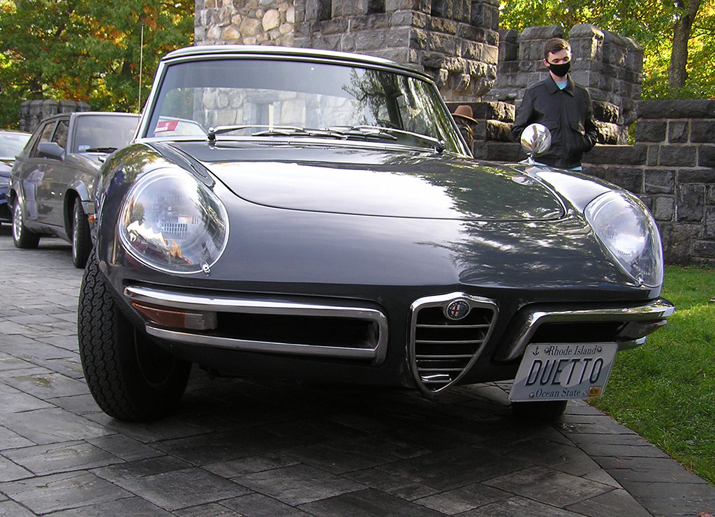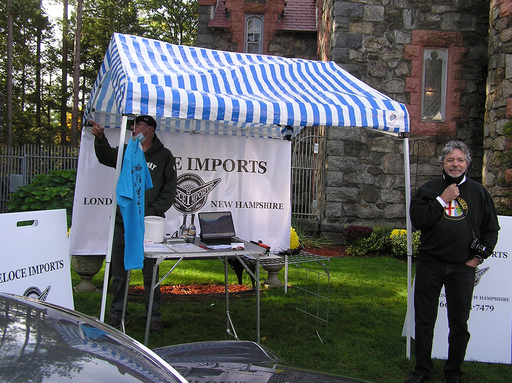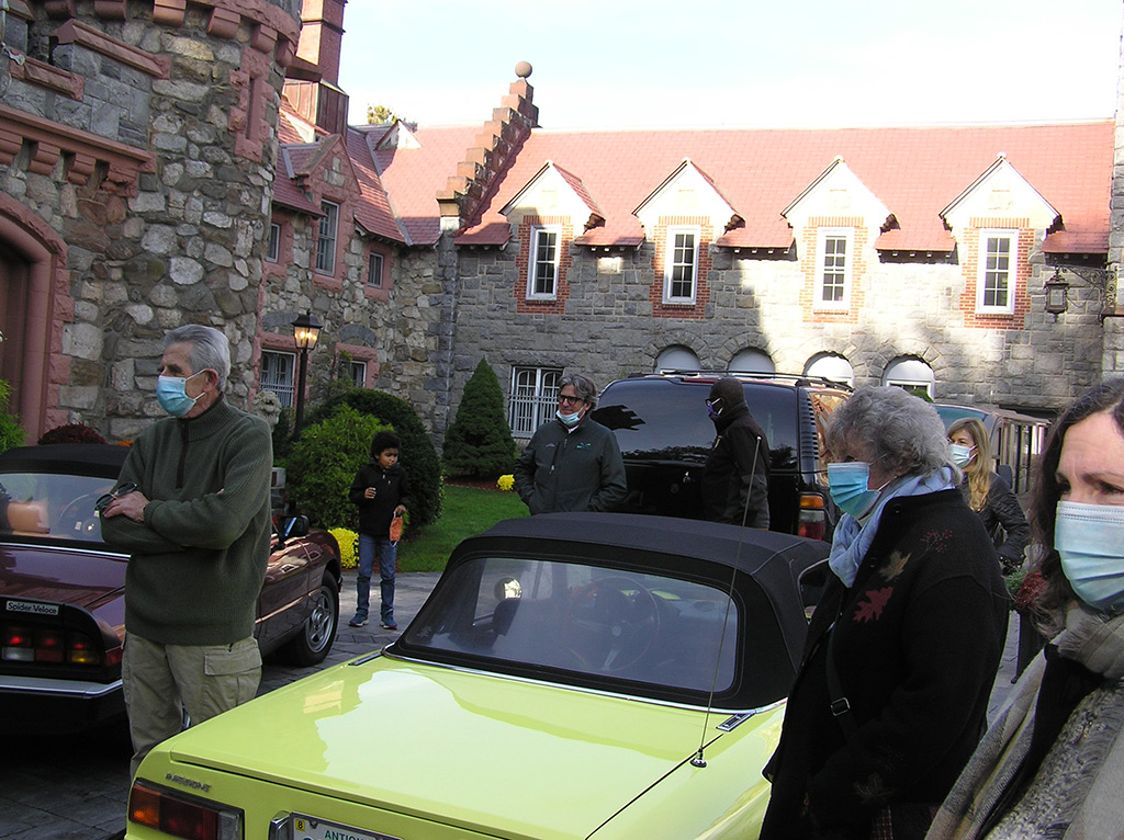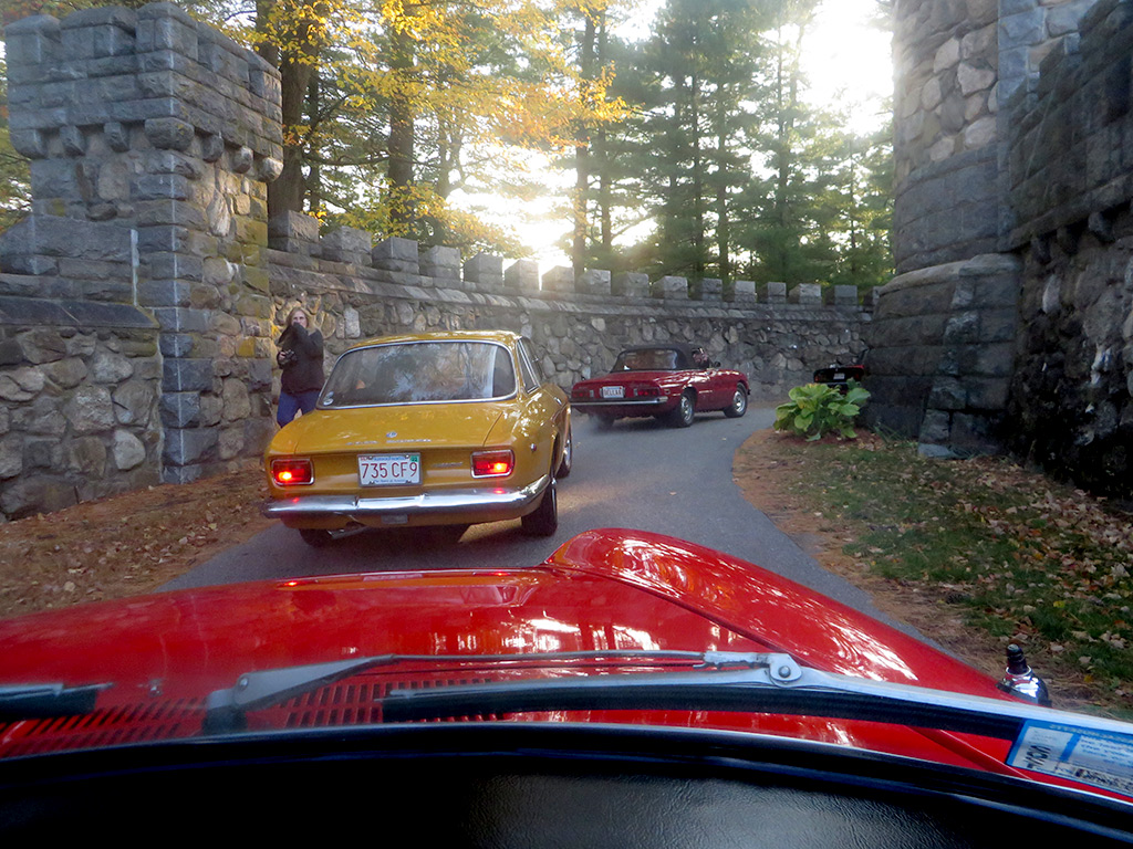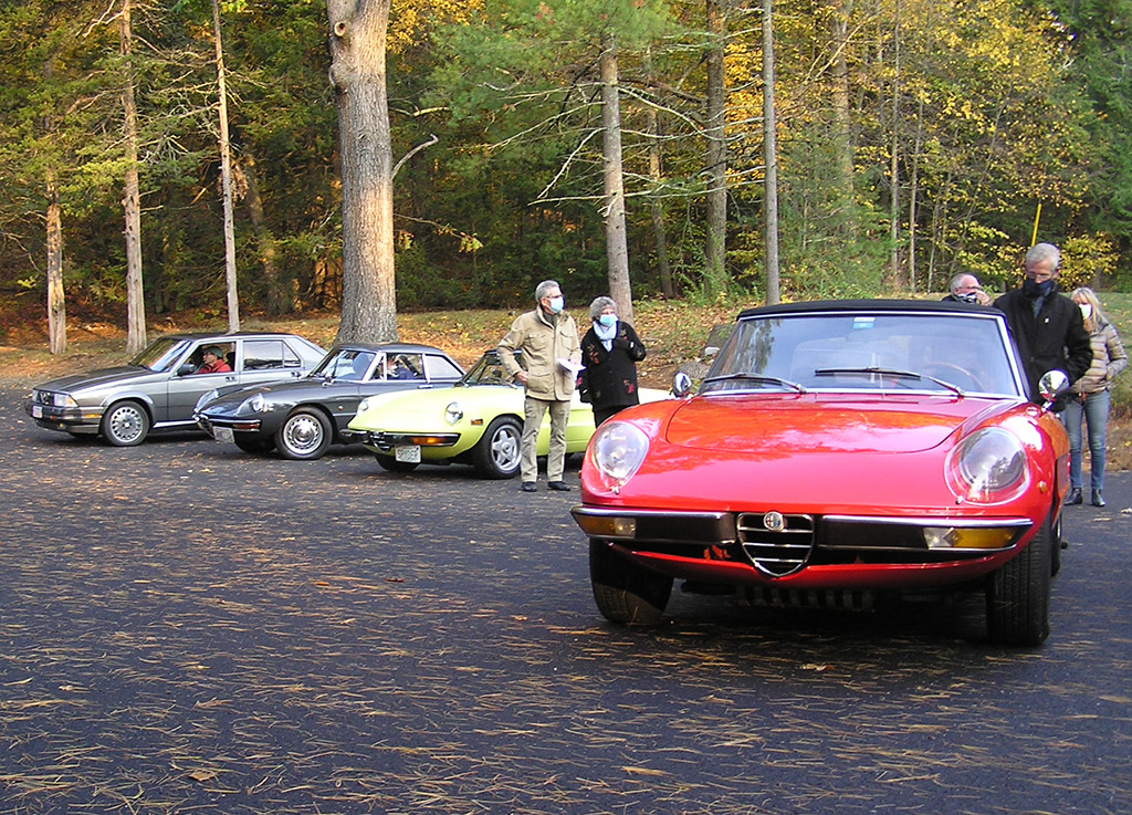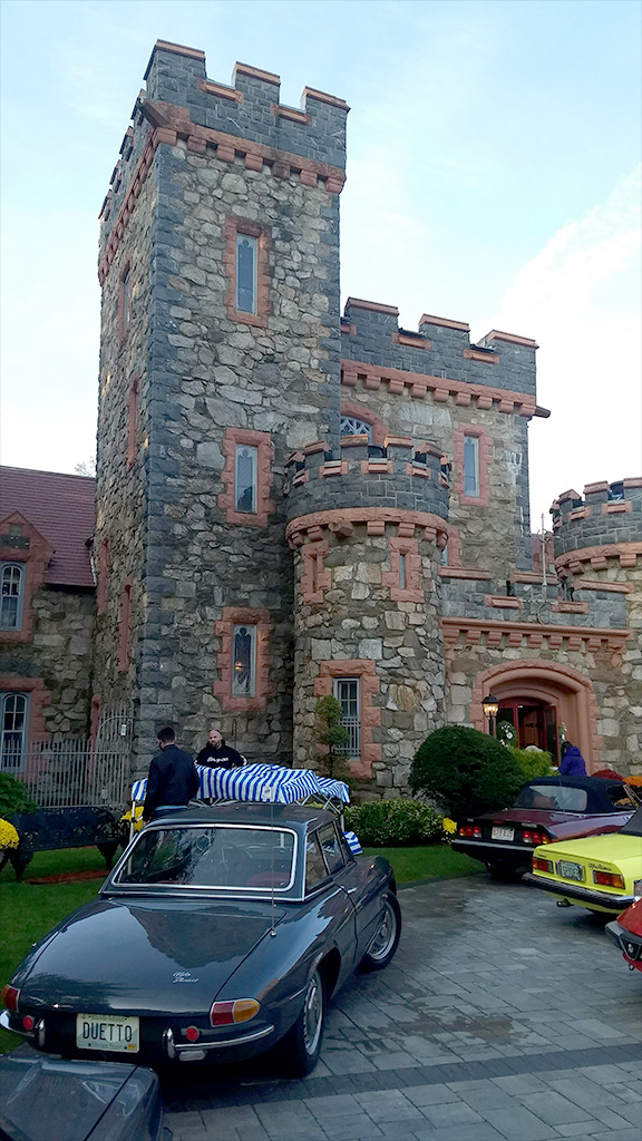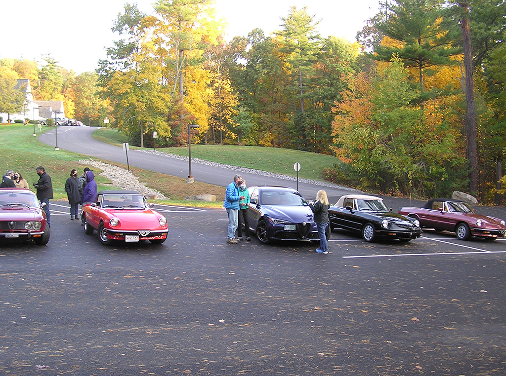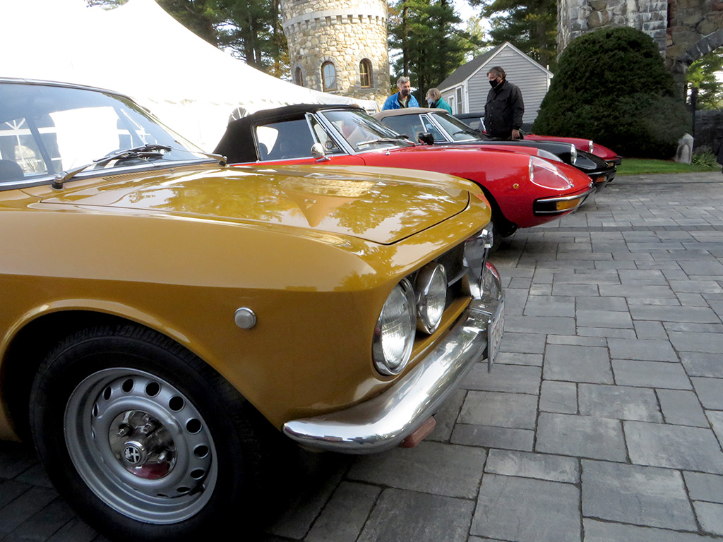 Sunday, October 18th, dawned bright, with cold, ethereal clouds of fog prowling the valleys. The lazy sun slowly emerged, warming the fresh autumn air as streams of light illuminated the fall foliage. Alfisti started gathering at the lower parking area of Searles Castle located in Windham, New Hampshire, at about 7:30 AM for an 8:00 AM event start. Unlike many of our driving events, this was a cars 'n' coffee style event, including a tour of the private castle that was created by interior designer Edward Searles back at the turn of the 20th century. Now owned by an angel investor from California, it is being lovingly refurbished and updated. Club member Karl Dubay's engineering firm has been involved in the project and he was able to pull together what turned out to be a fantastic AONE event. Even though this event came together at the last minute, we had fifteen cars lined up to follow a narrow, winding drive up the hill to the newly renovated courtyard of the castle. Although the castle is located only a couple of miles from the Interstate, we were all transported to a different, better time when the king was benevolent and Alfas ruled. What a place! (I should say palace.) Once the Alfas were carefully positioned in the courtyard, over thirty attendees enjoyed each other's company while discussing all things Alfa. As we drifted into the castle (socially distanced and properly masked), we found a welcoming table of delicious sweets and piping hot coffee provided by event sponsors The Dubay Group, Inc. and Alfa specialists Veloce Imports of nearby Londonderry. After exploring the four stories of beautiful woodwork, antique wall coverings, and imposing fireplaces of the castle, we stepped back outside where we were greeted with warming temperatures and a courtyard inhabited by beautiful Italian machinery gleaming in primary colors against the imposing stone edifice of the castle. As Italian themed music played in the background, many photos were taken and many compliments exchanged. The event closed with a raffle of prizes provided by Veloce Imports that included a free oil service and a complete exterior detail (valued at $250)! The club extends thanks to Jo and his team for the generous prizes and support of the event. [And thanks go to new member Karl Dubay and AONE Director Greg Stidsen for pulling off this terrific event, especially on such short notice! Karl reports, "When all of the Alfas vacated, I did a drip check on the new courtyard stones and was very impressed: i only used one tissue for three small drops of fresh quality lubricant over the 18 vehicles. Nice job, owners!" — Ed.] Searles Castle Tour Attendees Matt Collins and Eileen Isison - '85 Graduate Representing Veloce Imports