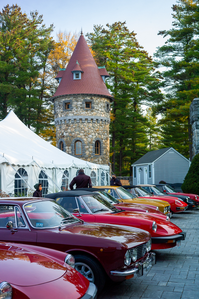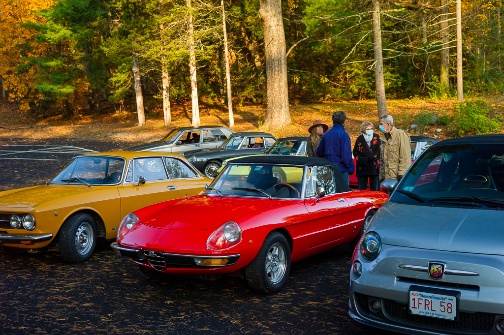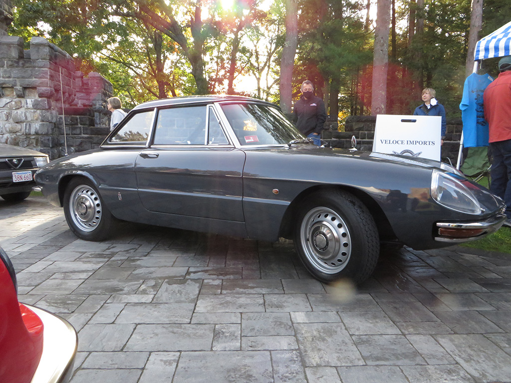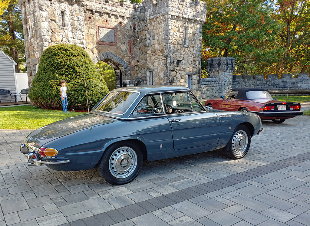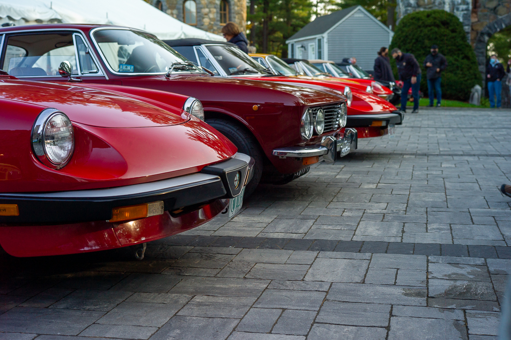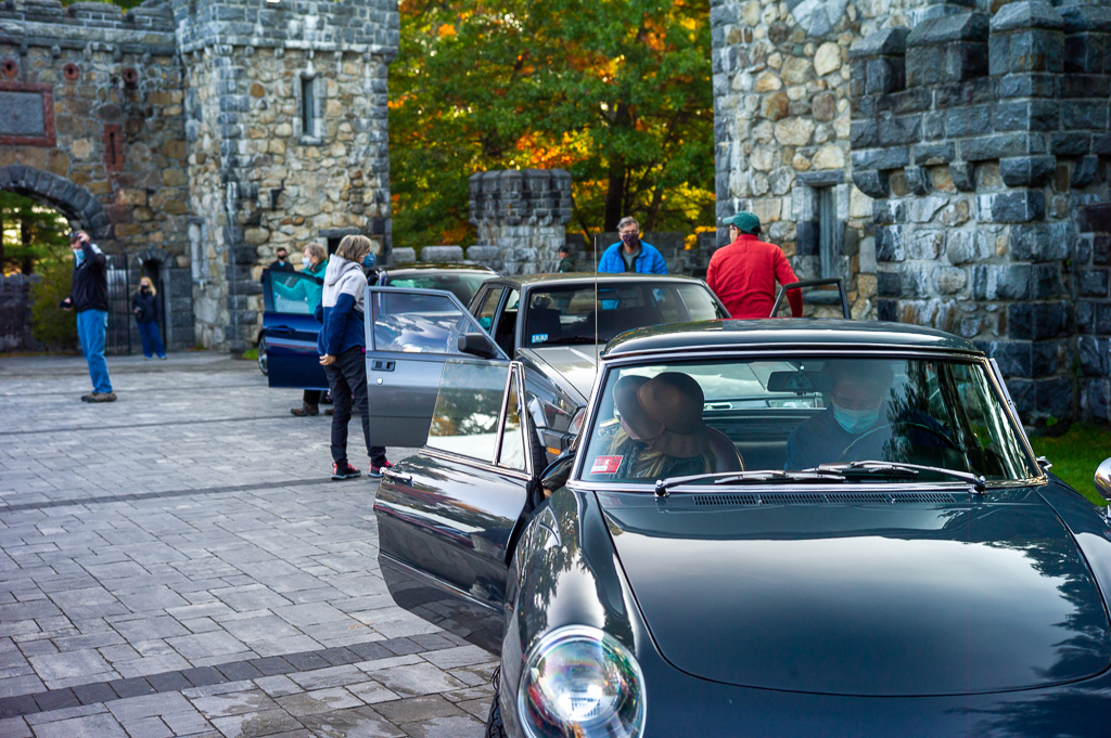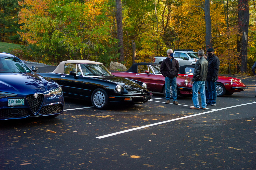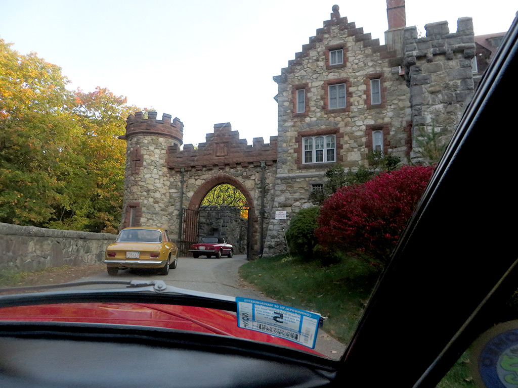 Sunday, October 18th, dawned bright, with cold, ethereal clouds of fog prowling the valleys. The lazy sun slowly emerged, warming the fresh autumn air as streams of light illuminated the fall foliage. Alfisti started gathering at the lower parking area of Searles Castle located in Windham, New Hampshire, at about 7:30 AM for an 8:00 AM event start. Unlike many of our driving events, this was a cars 'n' coffee style event, including a tour of the private castle that was created by interior designer Edward Searles back at the turn of the 20th century. Now owned by an angel investor from California, it is being lovingly refurbished and updated. Club member Karl Dubay's engineering firm has been involved in the project and he was able to pull together what turned out to be a fantastic AONE event. Even though this event came together at the last minute, we had fifteen cars lined up to follow a narrow, winding drive up the hill to the newly renovated courtyard of the castle. Although the castle is located only a couple of miles from the Interstate, we were all transported to a different, better time when the king was benevolent and Alfas ruled. What a place! (I should say palace.) Once the Alfas were carefully positioned in the courtyard, over thirty attendees enjoyed each other's company while discussing all things Alfa. As we drifted into the castle (socially distanced and properly masked), we found a welcoming table of delicious sweets and piping hot coffee provided by event sponsors The Dubay Group, Inc. and Alfa specialists Veloce Imports of nearby Londonderry. After exploring the four stories of beautiful woodwork, antique wall coverings, and imposing fireplaces of the castle, we stepped back outside where we were greeted with warming temperatures and a courtyard inhabited by beautiful Italian machinery gleaming in primary colors against the imposing stone edifice of the castle. As Italian themed music played in the background, many photos were taken and many compliments exchanged. The event closed with a raffle of prizes provided by Veloce Imports that included a free oil service and a complete exterior detail (valued at $250)! The club extends thanks to Jo and his team for the generous prizes and support of the event. [And thanks go to new member Karl Dubay and AONE Director Greg Stidsen for pulling off this terrific event, especially on such short notice! Karl reports, "When all of the Alfas vacated, I did a drip check on the new courtyard stones and was very impressed: i only used one tissue for three small drops of fresh quality lubricant over the 18 vehicles. Nice job, owners!" — Ed.] Searles Castle Tour Attendees Matt Collins and Eileen Isison - '85 Graduate Representing Veloce Imports