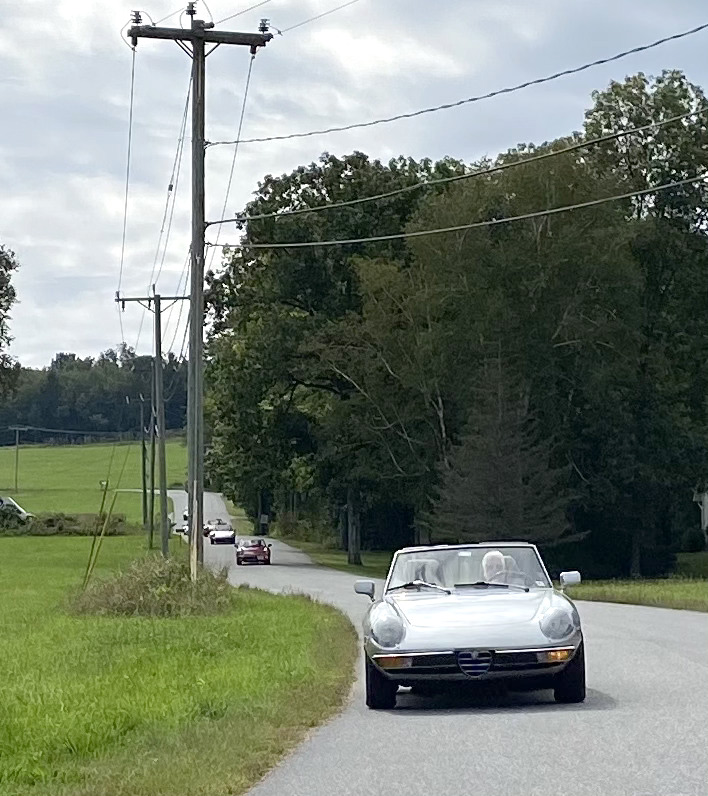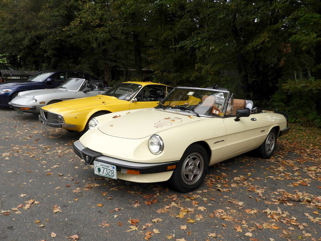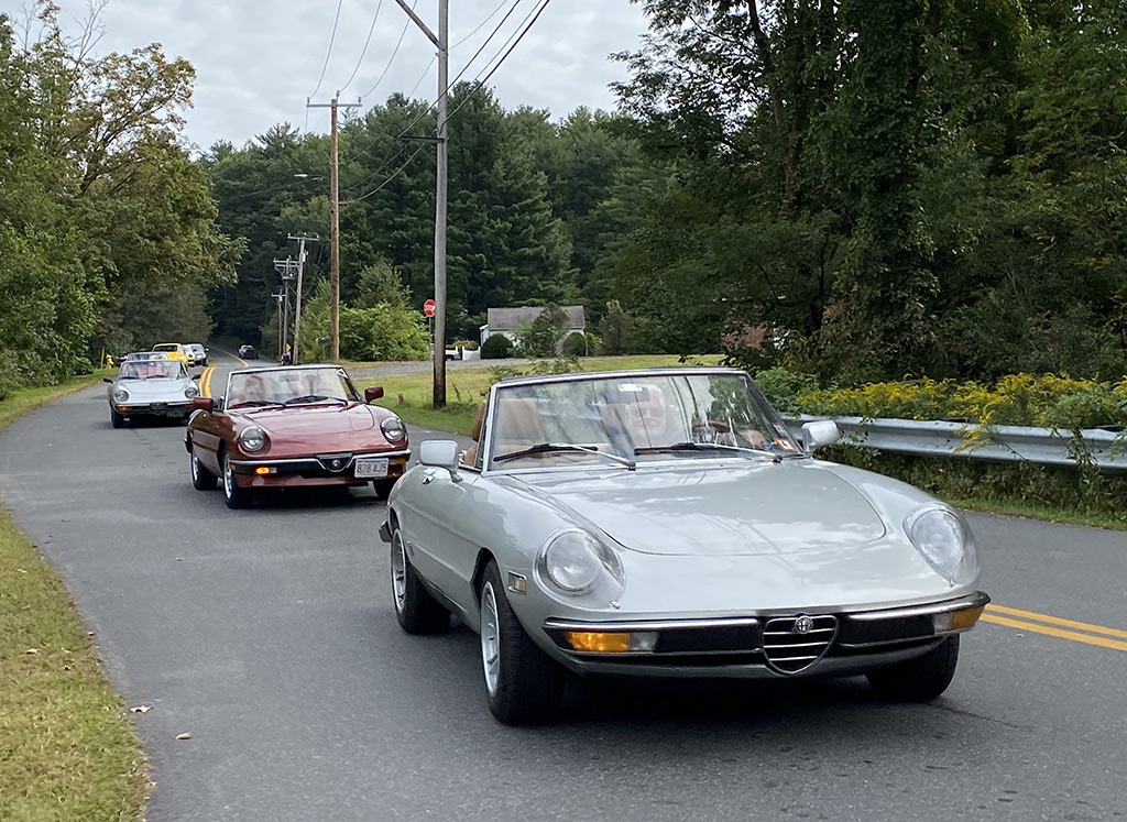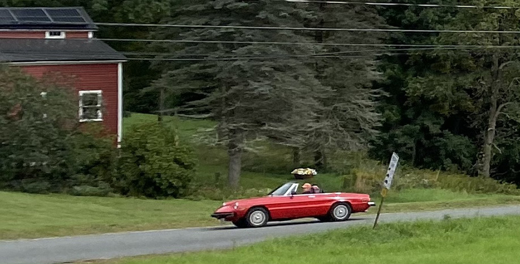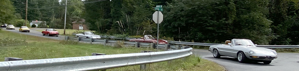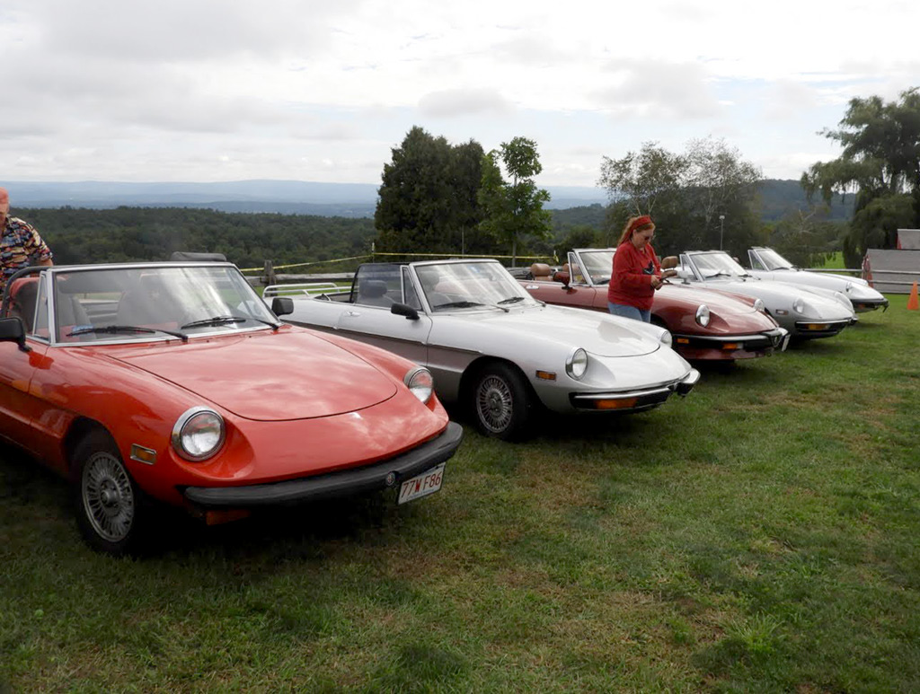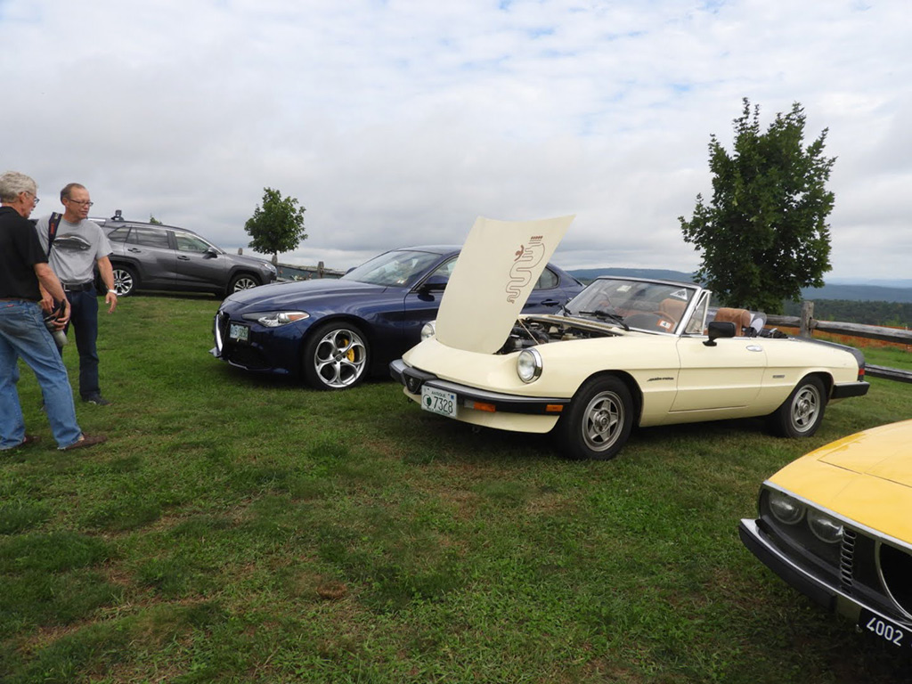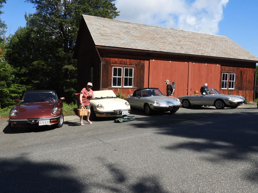 The 2021 Berkshires Sortie followed much the same format as in previous years. As usual, Alfisti met around 10-10:30 AM at a local roadside eatery, started the tour at 11 AM, and spent the next few hours enjoying (mostly) traffic-free and often twisty two-lane roads and pretty scenery. For 2021 we continued some of the changes that Covid-19 obliged us to introduce for the 2020 Sortie: rather than gathering in the morning at the Fillin' Station in South Deerfield, we met, again, in Bernardston, Mass., the last exit off of I-91 before entering Vermont. And rather than ending at a local restaurant, the 2021 Sortie concluded, as in 2020, with participants partaking of the picnic lunches they had brought to the Ashfield, Mass., home of the Walker family. For 2021, the turnout was more modest than the previous year: eight cars and twelve participants in all (there were 19 cars and 34 participants in 2020). The iffy weather forecast for the scheduled date (Saturday, September 18) did put a damper on the plans of at least one possible participant, who woke up in eastern Massachusetts to early-morning rain and decided against joining the tour. Another Boston-based participant was not discouraged by the poor early-morning eastern Massachusetts weather but did discover that his car's windshield wipers did not work. Many of us with older Alfas often do not think to service our cars' wipers, until the once-in-a-blue moon downpour reminds us that we should, which, of course, we promptly forget to do once the sun returns. The 2020 Sortie's gathering place in Bernardston was a roadside eatery aptly, for an Alfa Romeo gathering, called the Four Leaf Clover, and one of the photos from last year's event featured a Giulia Quadrifoglio (i.e. Four Leaf Clover) parked in front of the restaurant's sign. Unfortunately, the Four Leaf Clover restaurant fell victim to the pandemic's economic uncertainty and closed. Luckily, though, Sweet Lucy's Bakeshop is located right next door, has a large parking lot and outdoor seating and offers coffee and a large selection of baked goods, so we were able to gather there for the start of the tour. Peter and Meg, the Sortie's organizers, arrived at Sweet Lucy's before 10 AM and established an AONE presence at one of the Bakeshop's outdoor picnic tables. During the ensuing hour, seven other AONE cars trickled in, five of which were Spiders, the earliest being George Chris's 1971 1750 Spider and the most recent being Deb and Dan Donovan's 1988 Spider. The other Spiders were: Tom Freiberger's 1974 Spider, which is the same silver color as George's 1971 model (which, Peter pointed out, was also the original color of Meg's and his white Spider); Larry LoPresti's red Spider, like Peter's and Meg's, a 1977 model; and John and Roberta Rowntree's 1987 Spider, which, along with the Donovans', represented series 3 Spiders. Stefan and Sonchu Gavell's lovely, bright yellow 1973 1600 Junior Zagato completed our group of type 105 Giulia-based Alfas, and along with Bob Falco's almost brand new 2020 Giulia Q4 carried the flag for closed cars. Larry announced that his car was having trouble both starting and idling, though he was confident that it would be able to do clutch starts, and everyone assured him that we would be happy to push when necessary. We were never put to the test, as throughout the day Larry's Spider started every time it needed to. Idling, however, was another matter, and at our second "pit stop," in the parking lot of the Berkshire East ski area, the more mechanically-inclined among us tried to diagnose and improve Larry's idling problem. Of course the tour encountered no traffic lights, no traffic jams, and only a small number of stop signs, so thankfully the opportunities for Larry's Spider to stall and not restart were few. Having but eight cars on the tour made it easy to keep our group together, especially as the Gavells' Junior Zagato and Bob Falco's 2020 Giulia tended to remain at the rear of our peloton. The bright yellow of the Gavells' Junior Zagato and the brightly-lit xenon headlamps of Bob's Giulia were easy to see in rear-view mirrors. This made it easy to check that we had not lost anyone, and as a result, little time was lost re-grouping at the tour route's intersections. Since before dawn, the night's wet weather had been moving from west to east. At 11 AM the local roads were dry, but the sky was still mostly cloudy. From Bernardston our group wended its way south and west, toward skies that had been clearing since 9 AM. We drove along various country roads, through Leyden, Mass., where we crossed the first of three covered bridges on the route, and after about half an hour made the first of two stops, at Apex Orchard at the top of Peckville Road, outside Greenfield. A local dog walker on Peckville Road did not take at all kindly to sports cars driven con brio up what he must have felt was "his" hill and yelled out choice expletives that could be distinctly heard over what noise our cars were making. However his objections were forgotten at the top of the hill, in the orchard's parking lot. From this parking lot, we enjoyed an extraordinary view over the Connecticut River valley, with Vermont and New Hampshire in the distance, with Mount Monadnock dominating in the distance. Long-time AONE members recalled how Guilherme Bonatto, before he returned to Brazil, used to organize each fall a Giro di Monadnock in the area around Mount Monadnock. Apex Orchard allowed for some stretching of legs, kicking of tires, purchasing fresh and local apples and peaches, and taking striking photos. After leaving the orchard, we drove toward Colrain, along the same road where two years previously, but in the opposite direction, Rob Rizzo's GTV6 had run over an oversized piece of firewood lying in the middle of the narrow lane. Fortunately this year any fallen firewood had been cleared away, and our cars reached Colrain without incident. There we turned left onto route 112 (on