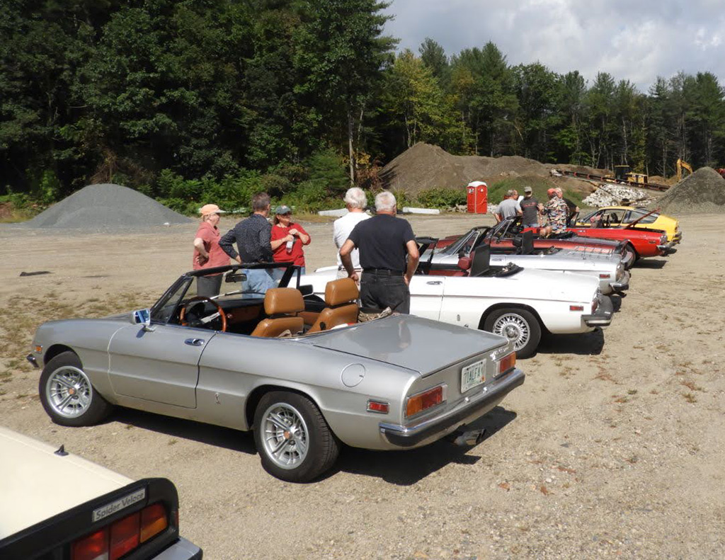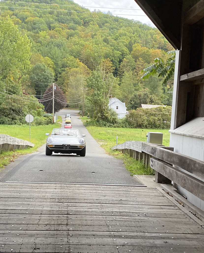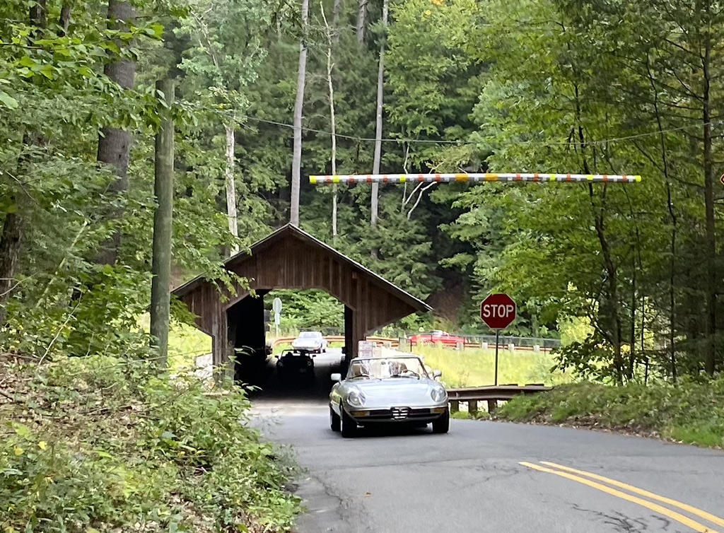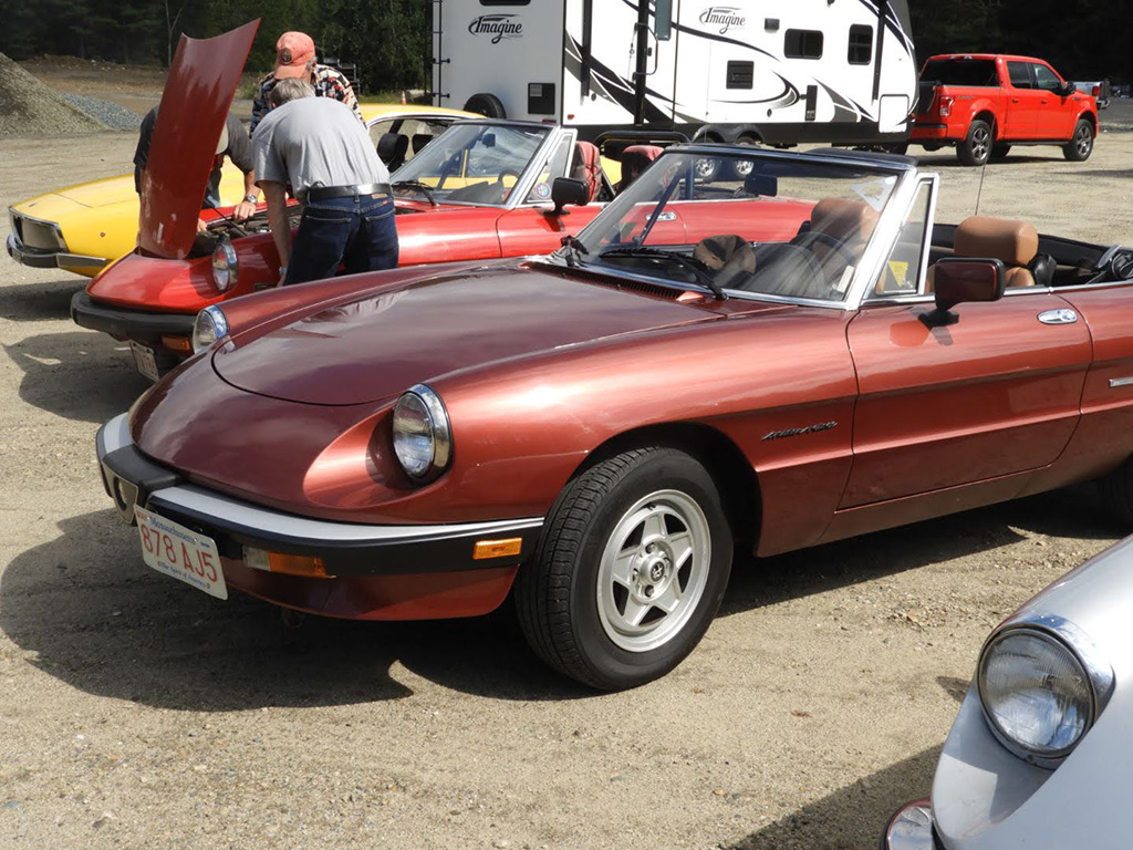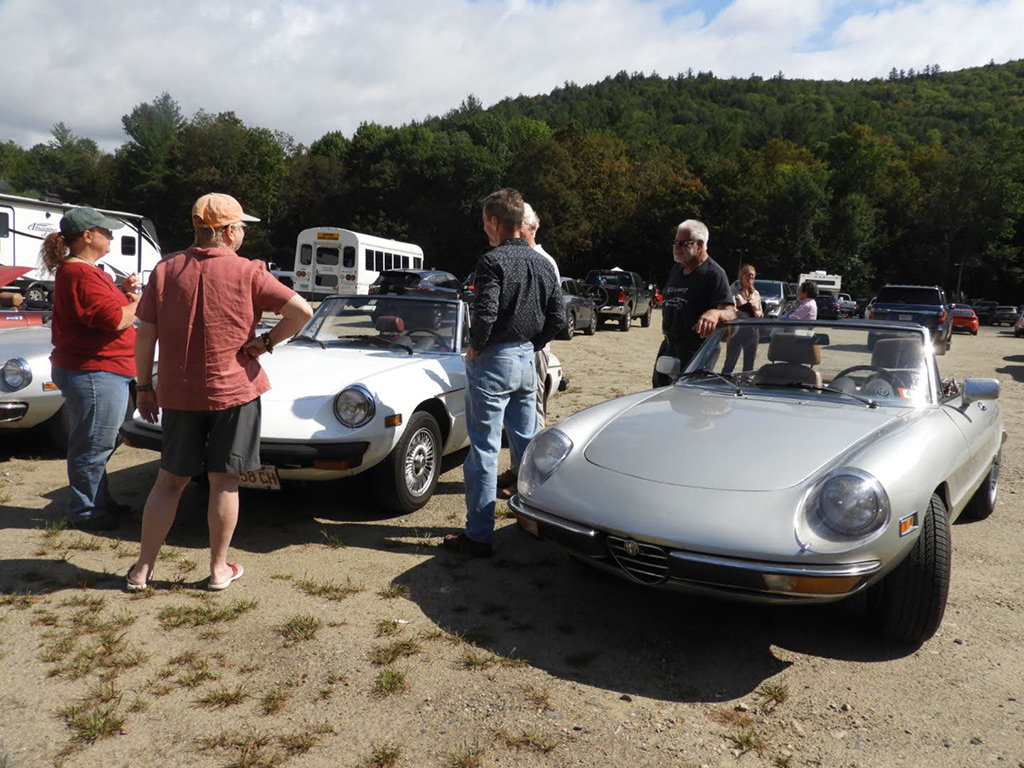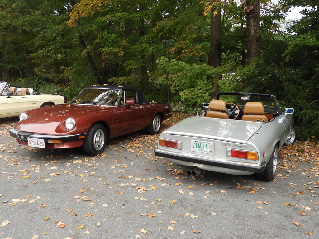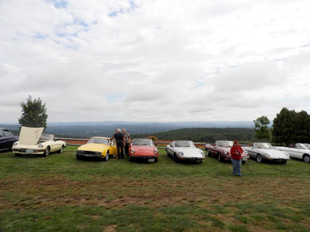 The 2021 Berkshires Sortie followed much the same format as in previous years. As usual, Alfisti met around 10-10:30 AM at a local roadside eatery, started the tour at 11 AM, and spent the next few hours enjoying (mostly) traffic-free and often twisty two-lane roads and pretty scenery. For 2021 we continued some of the changes that Covid-19 obliged us to introduce for the 2020 Sortie: rather than gathering in the morning at the Fillin' Station in South Deerfield, we met, again, in Bernardston, Mass., the last exit off of I-91 before entering Vermont. And rather than ending at a local restaurant, the 2021 Sortie concluded, as in 2020, with participants partaking of the picnic lunches they had brought to the Ashfield, Mass., home of the Walker family. For 2021, the turnout was more modest than the previous year: eight cars and twelve participants in all (there were 19 cars and 34 participants in 2020). The iffy weather forecast for the scheduled date (Saturday, September 18) did put a damper on the plans of at least one possible participant, who woke up in eastern Massachusetts to early-morning rain and decided against joining the tour. Another Boston-based participant was not discouraged by the poor early-morning eastern Massachusetts weather but did discover that his car's windshield wipers did not work. Many of us with older Alfas often do not think to service our cars' wipers, until the once-in-a-blue moon downpour reminds us that we should, which, of course, we promptly forget to do once the sun returns. The 2020 Sortie's gathering place in Bernardston was a roadside eatery aptly, for an Alfa Romeo gathering, called the Four Leaf Clover, and one of the photos from last year's event featured a Giulia Quadrifoglio (i.e. Four Leaf Clover) parked in front of the restaurant's sign. Unfortunately, the Four Leaf Clover restaurant fell victim to the pandemic's economic uncertainty and closed. Luckily, though, Sweet Lucy's Bakeshop is located right next door, has a large parking lot and outdoor seating and offers coffee and a large selection of baked goods, so we were able to gather there for the start of the tour. Peter and Meg, the Sortie's organizers, arrived at Sweet Lucy's before 10 AM and established an AONE presence at one of the Bakeshop's outdoor picnic tables. During the ensuing hour, seven other AONE cars trickled in, five of which were Spiders, the earliest being George Chris's 1971 1750 Spider and the most recent being Deb and Dan Donovan's 1988 Spider. The other Spiders were: Tom Freiberger's 1974 Spider, which is the same silver color as George's 1971 model (which, Peter pointed out, was also the original color of Meg's and his white Spider); Larry LoPresti's red Spider, like Peter's and Meg's, a 1977 model; and John and Roberta Rowntree's 1987 Spider, which, along with the Donovans', represented series 3 Spiders. Stefan and Sonchu Gavell's lovely, bright yellow 1973 1600 Junior Zagato completed our group of type 105 Giulia-based Alfas, and along with Bob Falco's almost brand new 2020 Giulia Q4 carried the flag for closed cars. Larry announced that his car was having trouble both starting and idling, though he was confident that it would be able to do clutch starts, and everyone assured him that we would be happy to push when necessary. We were never put to the test, as throughout the day Larry's Spider started every time it needed to. Idling, however, was another matter, and at our second "pit stop," in the parking lot of the Berkshire East ski area, the more mechanically-inclined among us tried to diagnose and improve Larry's idling problem. Of course the tour encountered no traffic lights, no traffic jams, and only a small number of stop signs, so thankfully the opportunities for Larry's Spider to stall and not restart were few. Having but eight cars on the tour made it easy to keep our group together, especially as the Gavells' Junior Zagato and Bob Falco's 2020 Giulia tended to remain at the rear of our peloton. The bright yellow of the Gavells' Junior Zagato and the brightly-lit xenon headlamps of Bob's Giulia were easy to see in rear-view mirrors. This made it easy to check that we had not lost anyone, and as a result, little time was lost re-grouping at the tour route's intersections. Since before dawn, the night's wet weather had been moving from west to east. At 11 AM the local roads were dry, but the sky was still mostly cloudy. From Bernardston our group wended its way south and west, toward skies that had been clearing since 9 AM. We drove along various country roads, through Leyden, Mass., where we crossed the first of three covered bridges on the route, and after about half an hour made the first of two stops, at Apex Orchard at the top of Peckville Road, outside Greenfield. A local dog walker on Peckville Road did not take at all kindly to sports cars driven con brio up what he must have felt was "his" hill and yelled out choice expletives that could be distinctly heard over what noise our cars were making. However his objections were forgotten at the top of the hill, in the orchard's parking lot. From this parking lot, we enjoyed an extraordinary view over the Connecticut River valley, with Vermont and New Hampshire in the distance, with Mount Monadnock dominating in the distance. Long-time AONE members recalled how Guilherme Bonatto, before he returned to Brazil, used to organize each fall a Giro di Monadnock in the area around Mount Monadnock. Apex Orchard allowed for some stretching of legs, kicking of tires, purchasing fresh and local apples and peaches, and taking striking photos. After leaving the orchard, we drove toward Colrain, along the same road where two years previously, but in the opposite direction, Rob Rizzo's GTV6 had run over an oversized piece of firewood lying in the middle of the narrow lane. Fortunately this year any fallen firewood had been cleared away, and our cars reached Colrain without incident. There we turned left onto route 112 (on