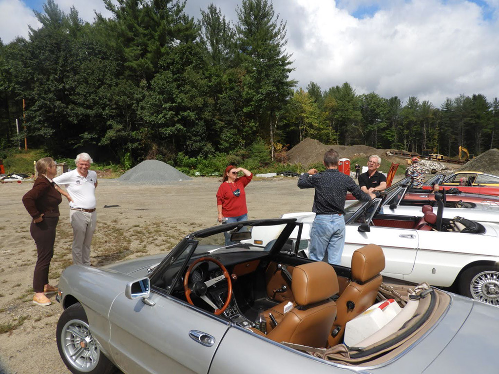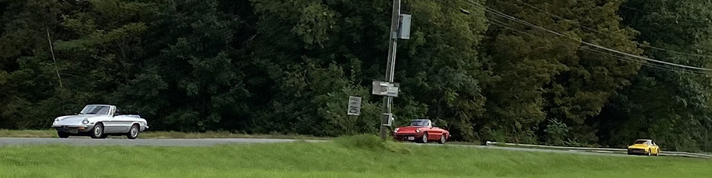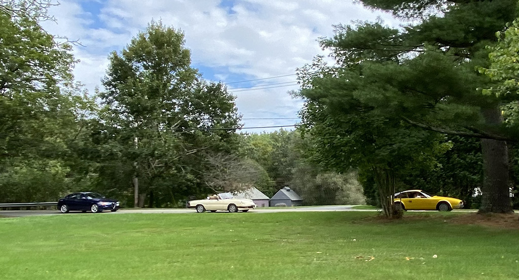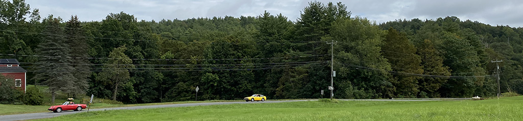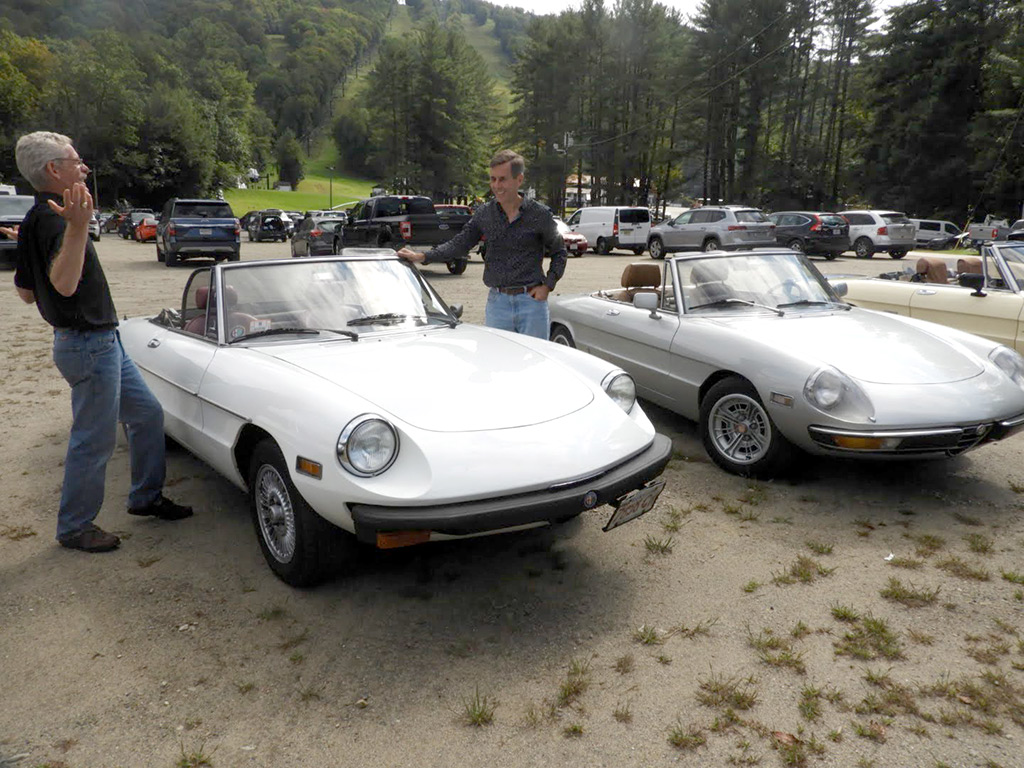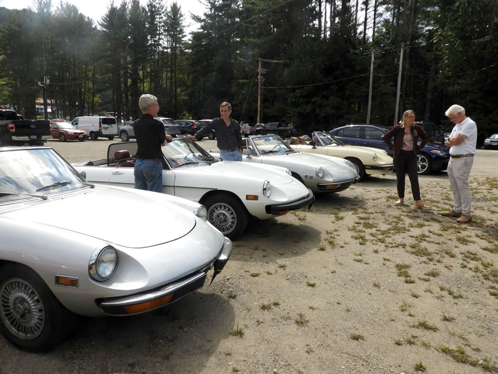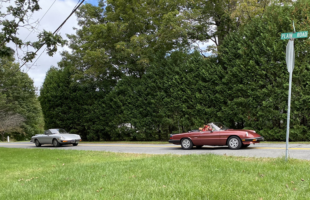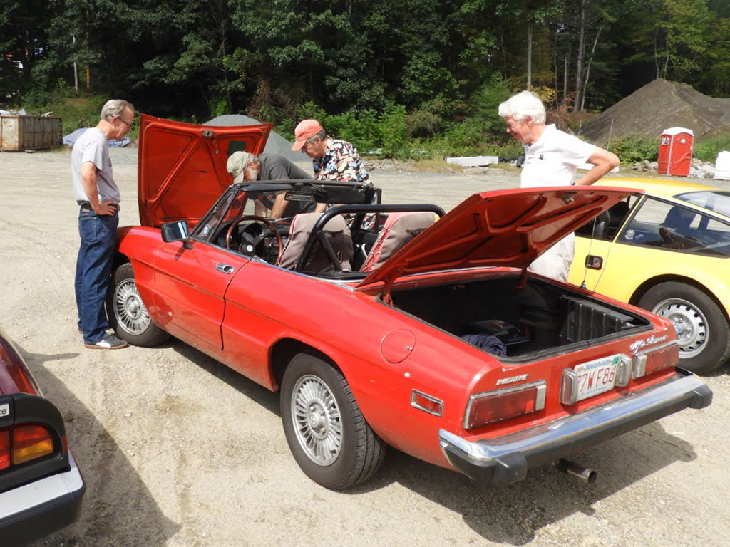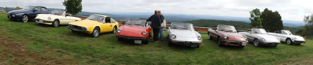 The 2021 Berkshires Sortie followed much the same format as in previous years. As usual, Alfisti met around 10-10:30 AM at a local roadside eatery, started the tour at 11 AM, and spent the next few hours enjoying (mostly) traffic-free and often twisty two-lane roads and pretty scenery. For 2021 we continued some of the changes that Covid-19 obliged us to introduce for the 2020 Sortie: rather than gathering in the morning at the Fillin' Station in South Deerfield, we met, again, in Bernardston, Mass., the last exit off of I-91 before entering Vermont. And rather than ending at a local restaurant, the 2021 Sortie concluded, as in 2020, with participants partaking of the picnic lunches they had brought to the Ashfield, Mass., home of the Walker family. For 2021, the turnout was more modest than the previous year: eight cars and twelve participants in all (there were 19 cars and 34 participants in 2020). The iffy weather forecast for the scheduled date (Saturday, September 18) did put a damper on the plans of at least one possible participant, who woke up in eastern Massachusetts to early-morning rain and decided against joining the tour. Another Boston-based participant was not discouraged by the poor early-morning eastern Massachusetts weather but did discover that his car's windshield wipers did not work. Many of us with older Alfas often do not think to service our cars' wipers, until the once-in-a-blue moon downpour reminds us that we should, which, of course, we promptly forget to do once the sun returns. The 2020 Sortie's gathering place in Bernardston was a roadside eatery aptly, for an Alfa Romeo gathering, called the Four Leaf Clover, and one of the photos from last year's event featured a Giulia Quadrifoglio (i.e. Four Leaf Clover) parked in front of the restaurant's sign. Unfortunately, the Four Leaf Clover restaurant fell victim to the pandemic's economic uncertainty and closed. Luckily, though, Sweet Lucy's Bakeshop is located right next door, has a large parking lot and outdoor seating and offers coffee and a large selection of baked goods, so we were able to gather there for the start of the tour. Peter and Meg, the Sortie's organizers, arrived at Sweet Lucy's before 10 AM and established an AONE presence at one of the Bakeshop's outdoor picnic tables. During the ensuing hour, seven other AONE cars trickled in, five of which were Spiders, the earliest being George Chris's 1971 1750 Spider and the most recent being Deb and Dan Donovan's 1988 Spider. The other Spiders were: Tom Freiberger's 1974 Spider, which is the same silver color as George's 1971 model (which, Peter pointed out, was also the original color of Meg's and his white Spider); Larry LoPresti's red Spider, like Peter's and Meg's, a 1977 model; and John and Roberta Rowntree's 1987 Spider, which, along with the Donovans', represented series 3 Spiders. Stefan and Sonchu Gavell's lovely, bright yellow 1973 1600 Junior Zagato completed our group of type 105 Giulia-based Alfas, and along with Bob Falco's almost brand new 2020 Giulia Q4 carried the flag for closed cars. Larry announced that his car was having trouble both starting and idling, though he was confident that it would be able to do clutch starts, and everyone assured him that we would be happy to push when necessary. We were never put to the test, as throughout the day Larry's Spider started every time it needed to. Idling, however, was another matter, and at our second "pit stop," in the parking lot of the Berkshire East ski area, the more mechanically-inclined among us tried to diagnose and improve Larry's idling problem. Of course the tour encountered no traffic lights, no traffic jams, and only a small number of stop signs, so thankfully the opportunities for Larry's Spider to stall and not restart were few. Having but eight cars on the tour made it easy to keep our group together, especially as the Gavells' Junior Zagato and Bob Falco's 2020 Giulia tended to remain at the rear of our peloton. The bright yellow of the Gavells' Junior Zagato and the brightly-lit xenon headlamps of Bob's Giulia were easy to see in rear-view mirrors. This made it easy to check that we had not lost anyone, and as a result, little time was lost re-grouping at the tour route's intersections. Since before dawn, the night's wet weather had been moving from west to east. At 11 AM the local roads were dry, but the sky was still mostly cloudy. From Bernardston our group wended its way south and west, toward skies that had been clearing since 9 AM. We drove along various country roads, through Leyden, Mass., where we crossed the first of three covered bridges on the route, and after about half an hour made the first of two stops, at Apex Orchard at the top of Peckville Road, outside Greenfield. A local dog walker on Peckville Road did not take at all kindly to sports cars driven con brio up what he must have felt was "his" hill and yelled out choice expletives that could be distinctly heard over what noise our cars were making. However his objections were forgotten at the top of the hill, in the orchard's parking lot. From this parking lot, we enjoyed an extraordinary view over the Connecticut River valley, with Vermont and New Hampshire in the distance, with Mount Monadnock dominating in the distance. Long-time AONE members recalled how Guilherme Bonatto, before he returned to Brazil, used to organize each fall a Giro di Monadnock in the area around Mount Monadnock. Apex Orchard allowed for some stretching of legs, kicking of tires, purchasing fresh and local apples and peaches, and taking striking photos. After leaving the orchard, we drove toward Colrain, along the same road where two years previously, but in the opposite direction, Rob Rizzo's GTV6 had run over an oversized piece of firewood lying in the middle of the narrow lane. Fortunately this year any fallen firewood had been cleared away, and our cars reached Colrain without incident. There we turned left onto route 112 (on