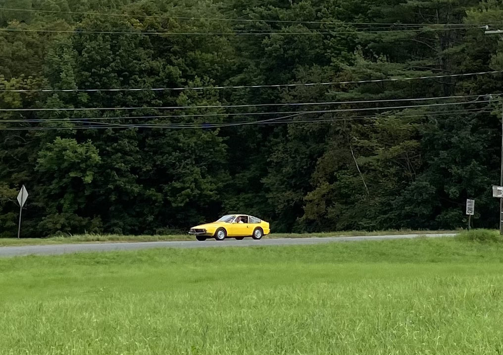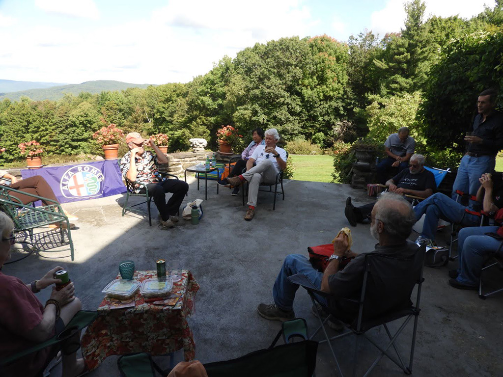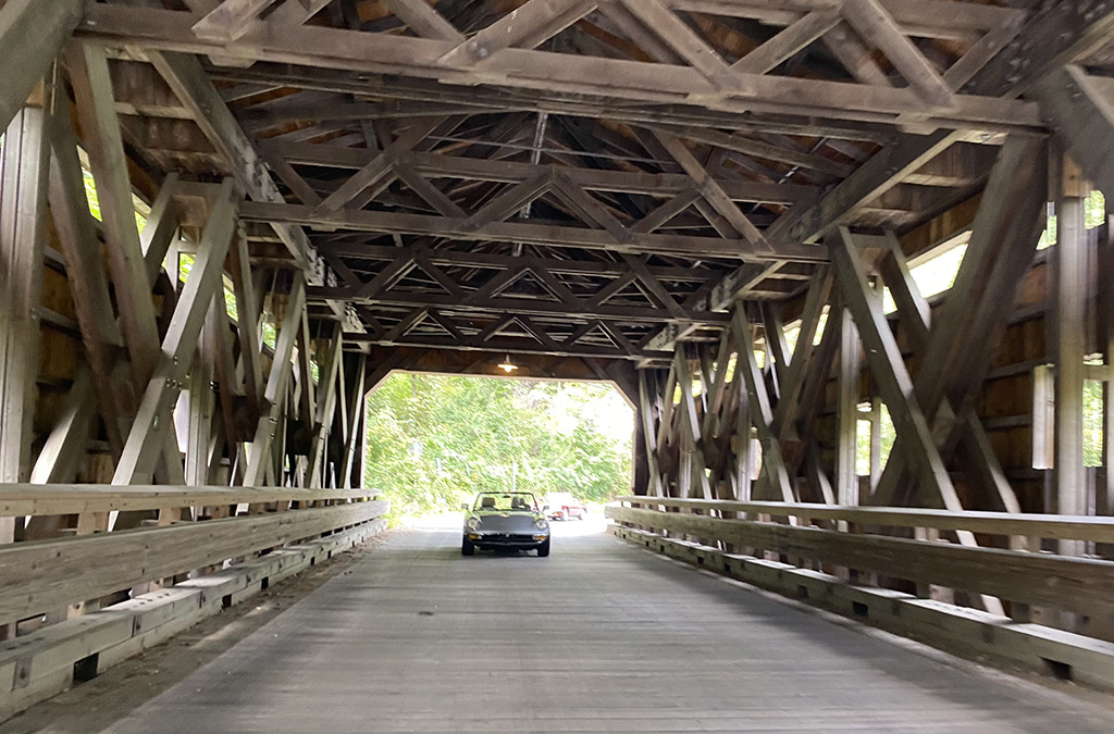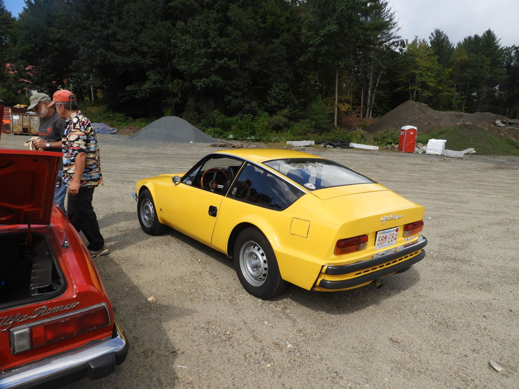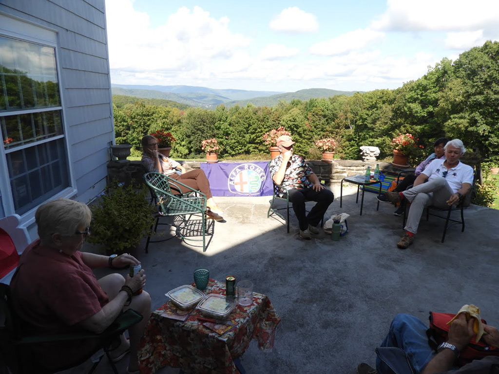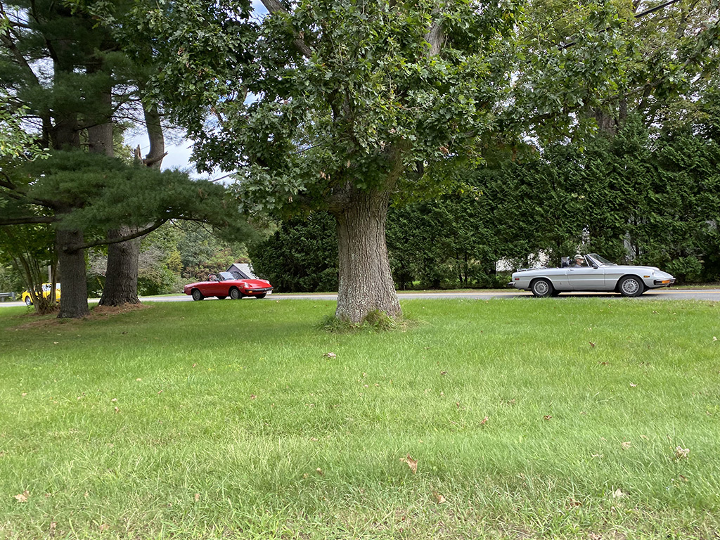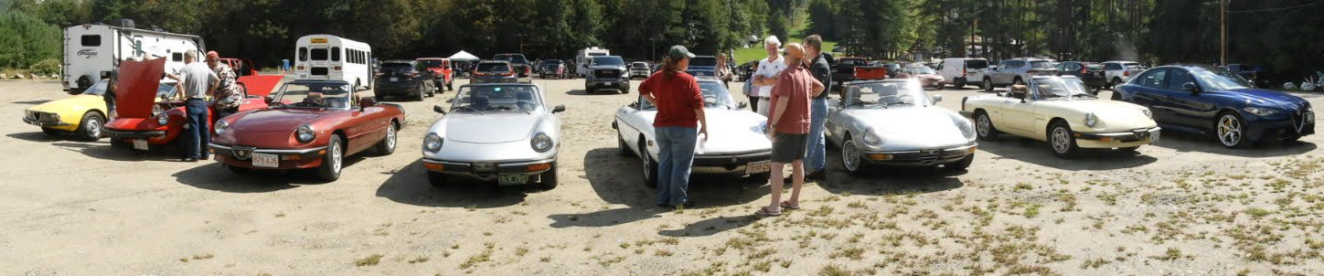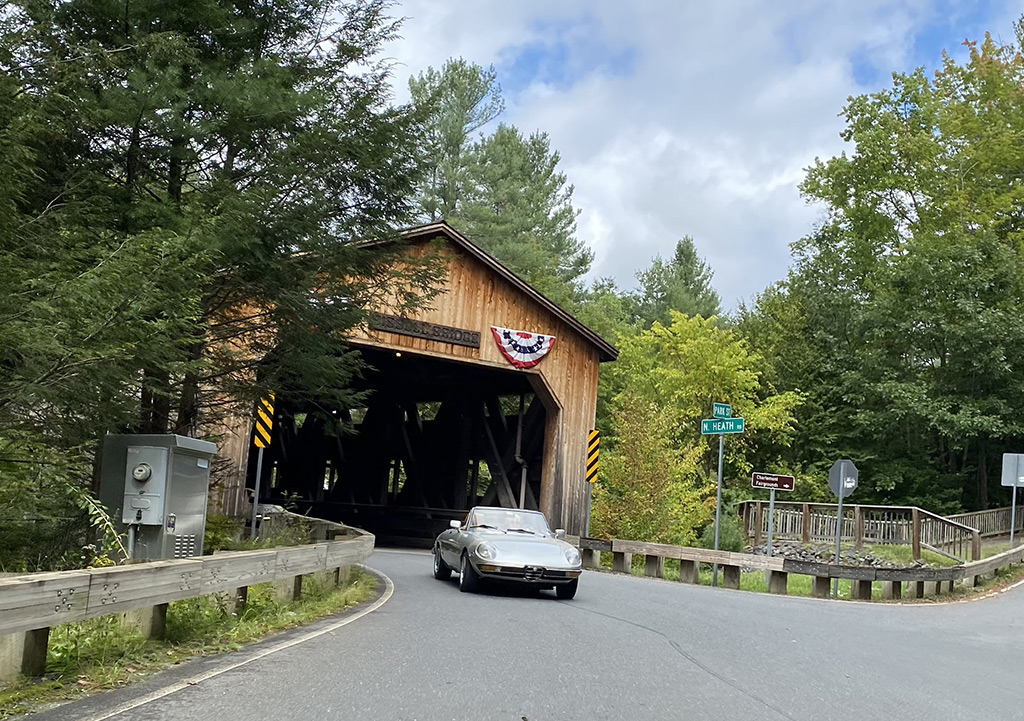 The 2021 Berkshires Sortie followed much the same format as in previous years. As usual, Alfisti met around 10-10:30 AM at a local roadside eatery, started the tour at 11 AM, and spent the next few hours enjoying (mostly) traffic-free and often twisty two-lane roads and pretty scenery. For 2021 we continued some of the changes that Covid-19 obliged us to introduce for the 2020 Sortie: rather than gathering in the morning at the Fillin' Station in South Deerfield, we met, again, in Bernardston, Mass., the last exit off of I-91 before entering Vermont. And rather than ending at a local restaurant, the 2021 Sortie concluded, as in 2020, with participants partaking of the picnic lunches they had brought to the Ashfield, Mass., home of the Walker family. For 2021, the turnout was more modest than the previous year: eight cars and twelve participants in all (there were 19 cars and 34 participants in 2020). The iffy weather forecast for the scheduled date (Saturday, September 18) did put a damper on the plans of at least one possible participant, who woke up in eastern Massachusetts to early-morning rain and decided against joining the tour. Another Boston-based participant was not discouraged by the poor early-morning eastern Massachusetts weather but did discover that his car's windshield wipers did not work. Many of us with older Alfas often do not think to service our cars' wipers, until the once-in-a-blue moon downpour reminds us that we should, which, of course, we promptly forget to do once the sun returns. The 2020 Sortie's gathering place in Bernardston was a roadside eatery aptly, for an Alfa Romeo gathering, called the Four Leaf Clover, and one of the photos from last year's event featured a Giulia Quadrifoglio (i.e. Four Leaf Clover) parked in front of the restaurant's sign. Unfortunately, the Four Leaf Clover restaurant fell victim to the pandemic's economic uncertainty and closed. Luckily, though, Sweet Lucy's Bakeshop is located right next door, has a large parking lot and outdoor seating and offers coffee and a large selection of baked goods, so we were able to gather there for the start of the tour. Peter and Meg, the Sortie's organizers, arrived at Sweet Lucy's before 10 AM and established an AONE presence at one of the Bakeshop's outdoor picnic tables. During the ensuing hour, seven other AONE cars trickled in, five of which were Spiders, the earliest being George Chris's 1971 1750 Spider and the most recent being Deb and Dan Donovan's 1988 Spider. The other Spiders were: Tom Freiberger's 1974 Spider, which is the same silver color as George's 1971 model (which, Peter pointed out, was also the original color of Meg's and his white Spider); Larry LoPresti's red Spider, like Peter's and Meg's, a 1977 model; and John and Roberta Rowntree's 1987 Spider, which, along with the Donovans', represented series 3 Spiders. Stefan and Sonchu Gavell's lovely, bright yellow 1973 1600 Junior Zagato completed our group of type 105 Giulia-based Alfas, and along with Bob Falco's almost brand new 2020 Giulia Q4 carried the flag for closed cars. Larry announced that his car was having trouble both starting and idling, though he was confident that it would be able to do clutch starts, and everyone assured him that we would be happy to push when necessary. We were never put to the test, as throughout the day Larry's Spider started every time it needed to. Idling, however, was another matter, and at our second "pit stop," in the parking lot of the Berkshire East ski area, the more mechanically-inclined among us tried to diagnose and improve Larry's idling problem. Of course the tour encountered no traffic lights, no traffic jams, and only a small number of stop signs, so thankfully the opportunities for Larry's Spider to stall and not restart were few. Having but eight cars on the tour made it easy to keep our group together, especially as the Gavells' Junior Zagato and Bob Falco's 2020 Giulia tended to remain at the rear of our peloton. The bright yellow of the Gavells' Junior Zagato and the brightly-lit xenon headlamps of Bob's Giulia were easy to see in rear-view mirrors. This made it easy to check that we had not lost anyone, and as a result, little time was lost re-grouping at the tour route's intersections. Since before dawn, the night's wet weather had been moving from west to east. At 11 AM the local roads were dry, but the sky was still mostly cloudy. From Bernardston our group wended its way south and west, toward skies that had been clearing since 9 AM. We drove along various country roads, through Leyden, Mass., where we crossed the first of three covered bridges on the route, and after about half an hour made the first of two stops, at Apex Orchard at the top of Peckville Road, outside Greenfield. A local dog walker on Peckville Road did not take at all kindly to sports cars driven con brio up what he must have felt was "his" hill and yelled out choice expletives that could be distinctly heard over what noise our cars were making. However his objections were forgotten at the top of the hill, in the orchard's parking lot. From this parking lot, we enjoyed an extraordinary view over the Connecticut River valley, with Vermont and New Hampshire in the distance, with Mount Monadnock dominating in the distance. Long-time AONE members recalled how Guilherme Bonatto, before he returned to Brazil, used to organize each fall a Giro di Monadnock in the area around Mount Monadnock. Apex Orchard allowed for some stretching of legs, kicking of tires, purchasing fresh and local apples and peaches, and taking striking photos. After leaving the orchard, we drove toward Colrain, along the same road where two years previously, but in the opposite direction, Rob Rizzo's GTV6 had run over an oversized piece of firewood lying in the middle of the narrow lane. Fortunately this year any fallen firewood had been cleared away, and our cars reached Colrain without incident. There we turned left onto route 112 (on